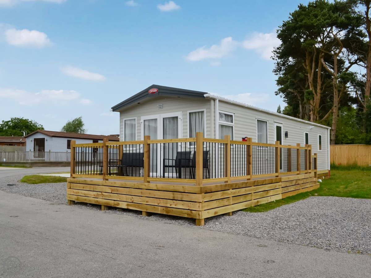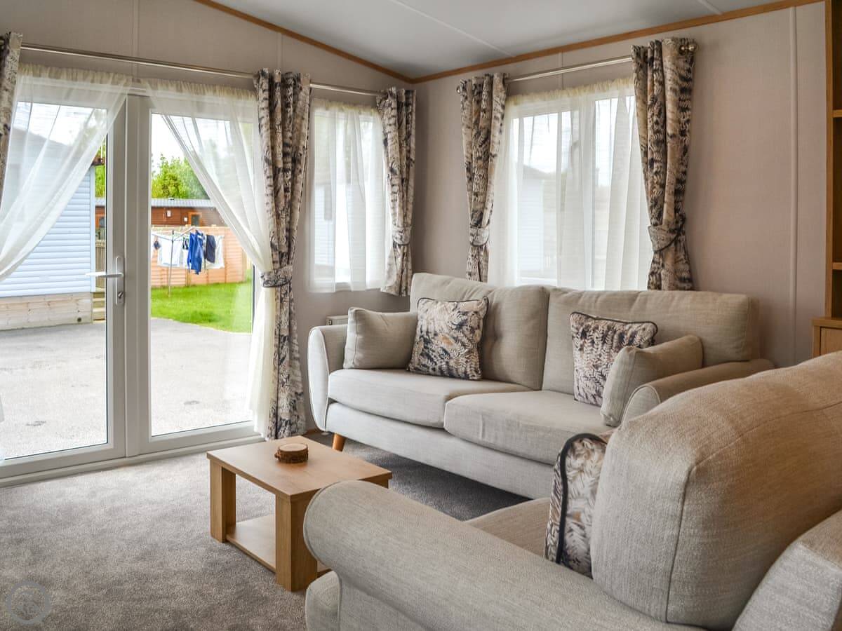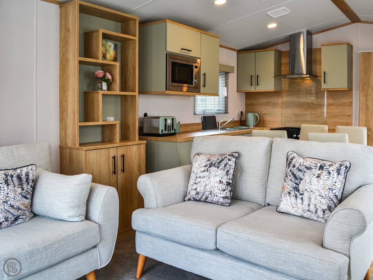 It's a detached lodge. It sleeps four, with two bedrooms and a bathroom. It's got a 4 Star rating. There's an open plan living area with a sofa, dining table, a TV and doors that open out onto the decking. Everything is modern and clean.