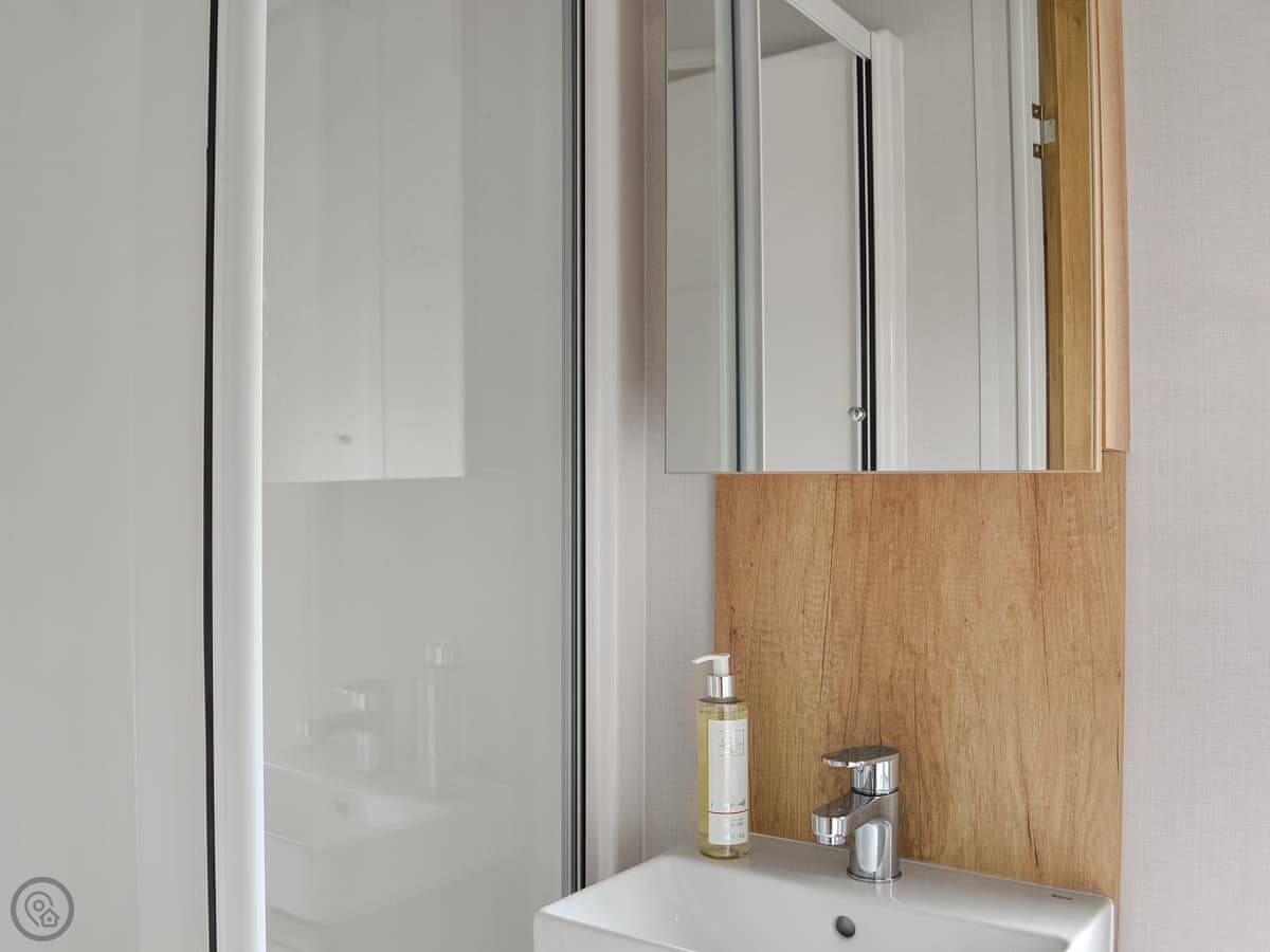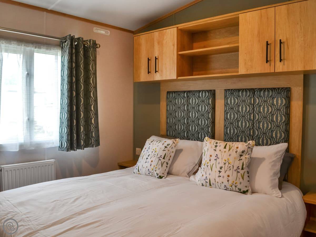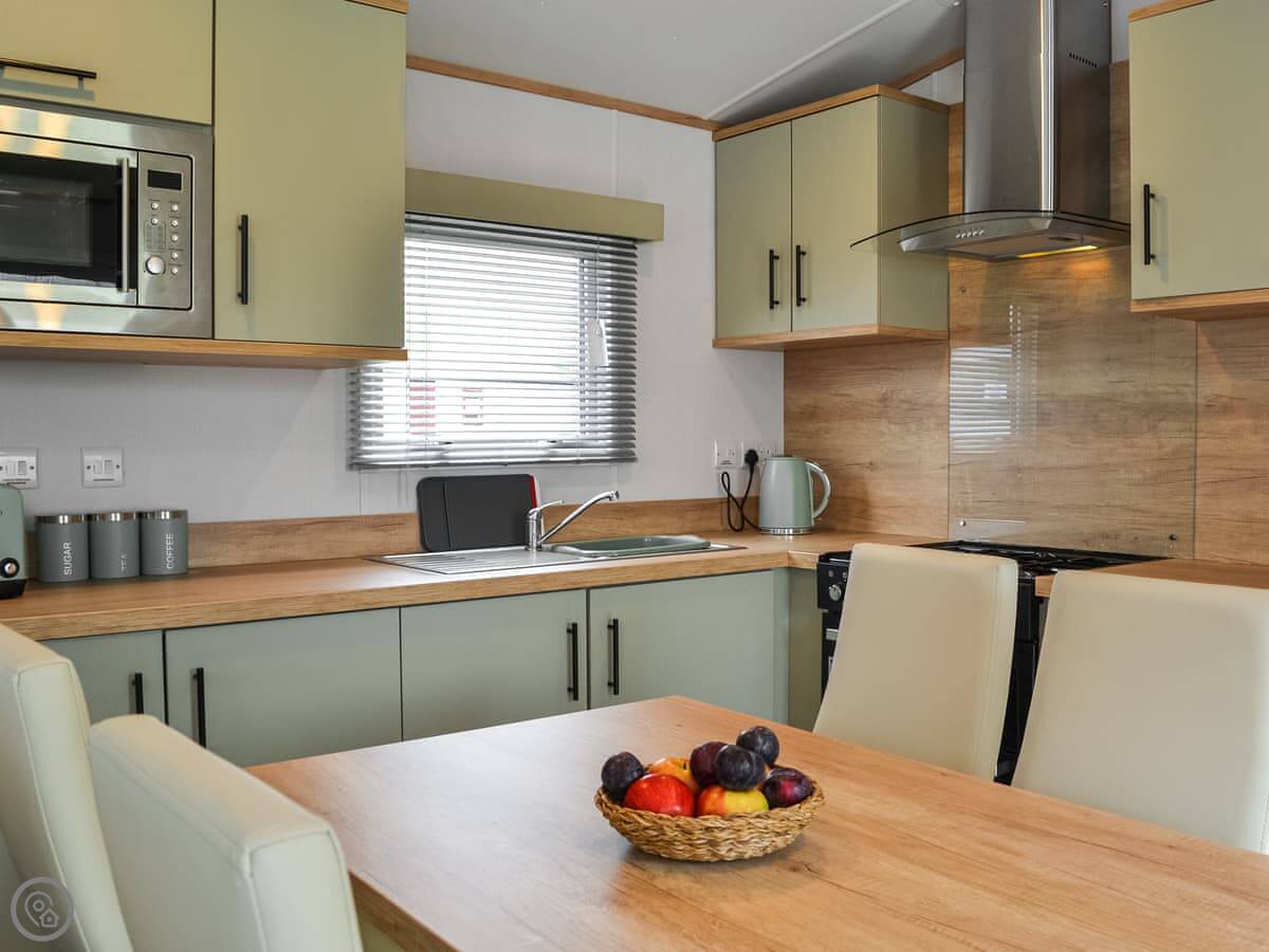 It's a detached lodge. It sleeps four, with two bedrooms and a bathroom. It's got a 4 Star rating. There's an open plan living area with a sofa, dining table, a TV and doors that open out onto the decking. Everything is modern and clean.