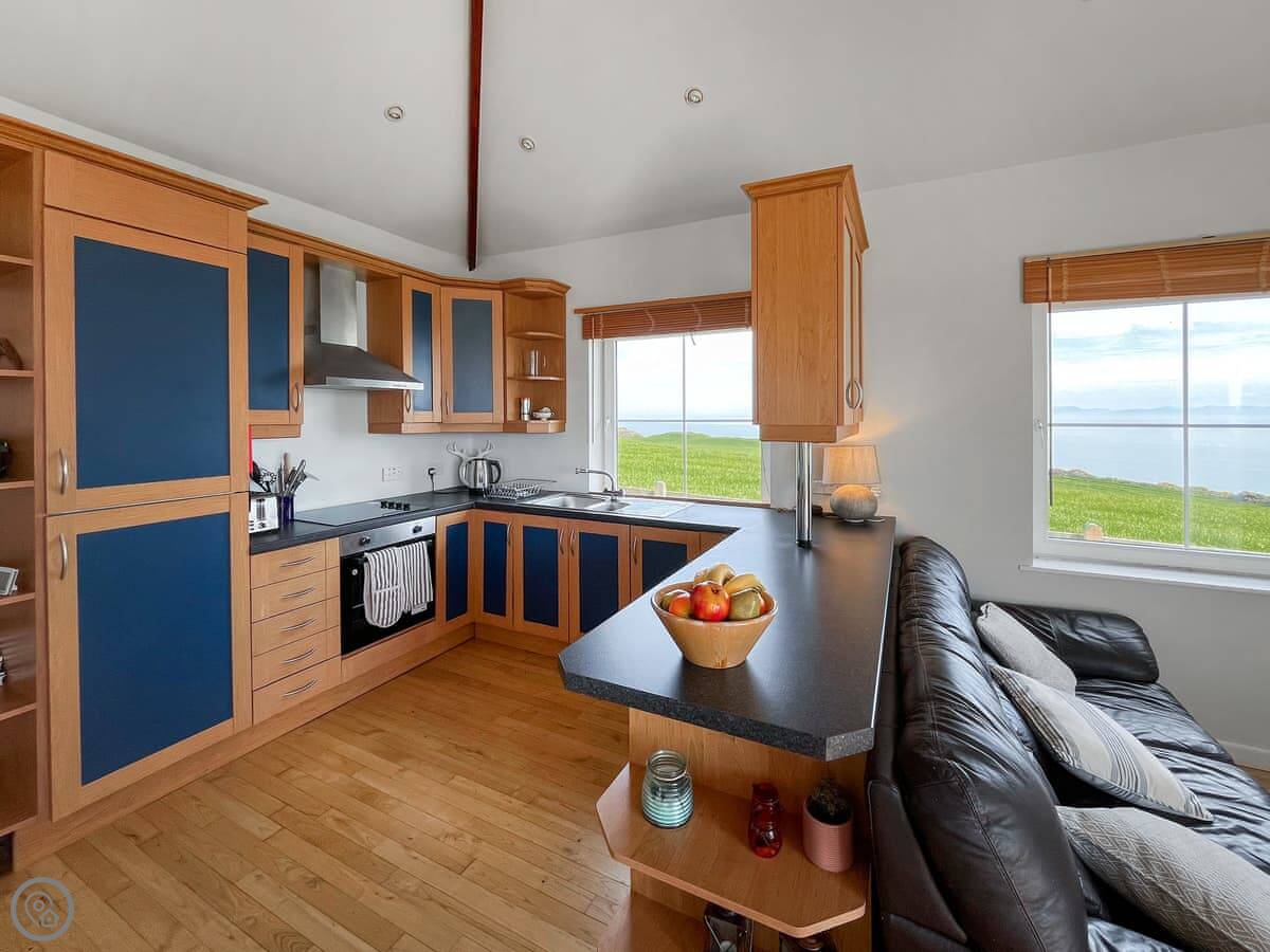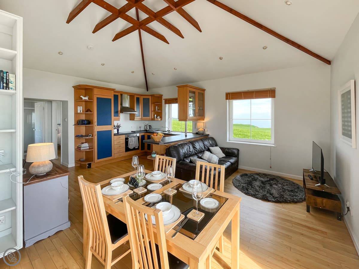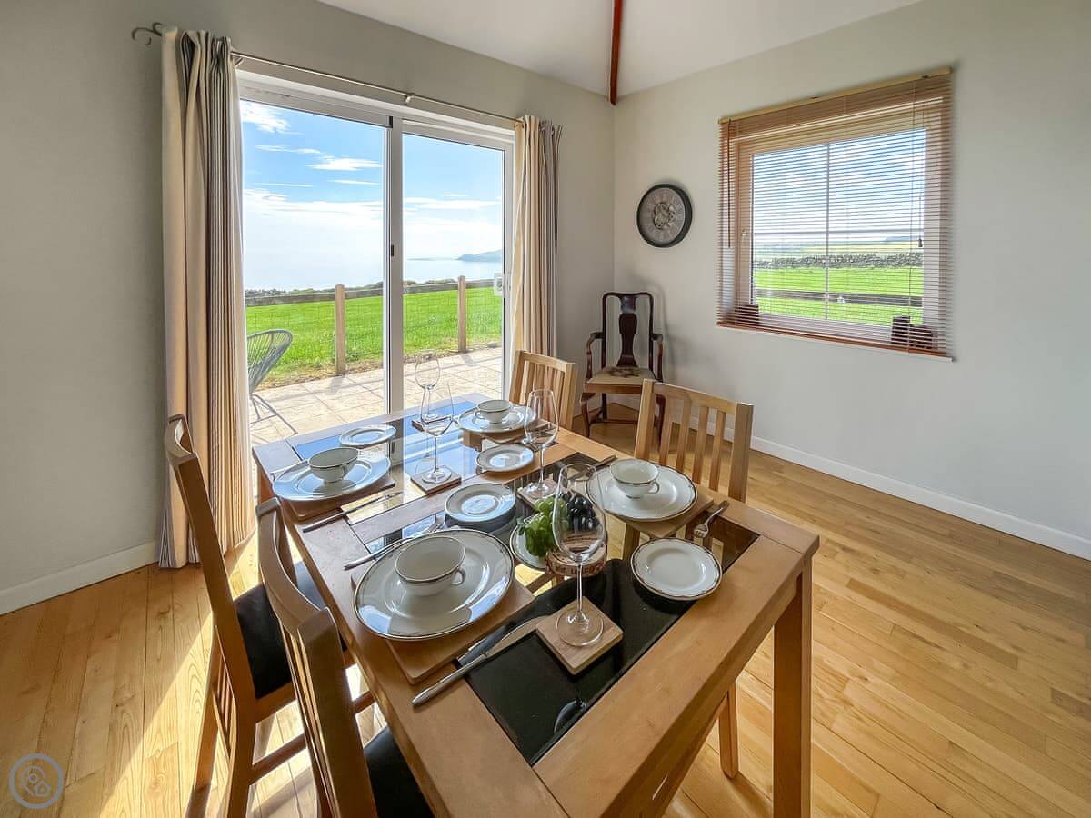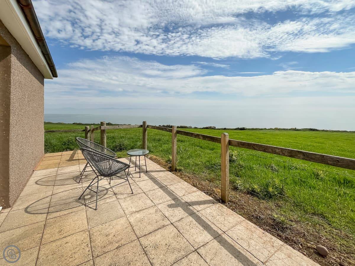The Look Out is a cottage near Dundrennan. It's detached, so no one shares a wall with you. It's at the end of a farm track. The sea views are the main thing. There are big windows in the living area so you can see it from inside.