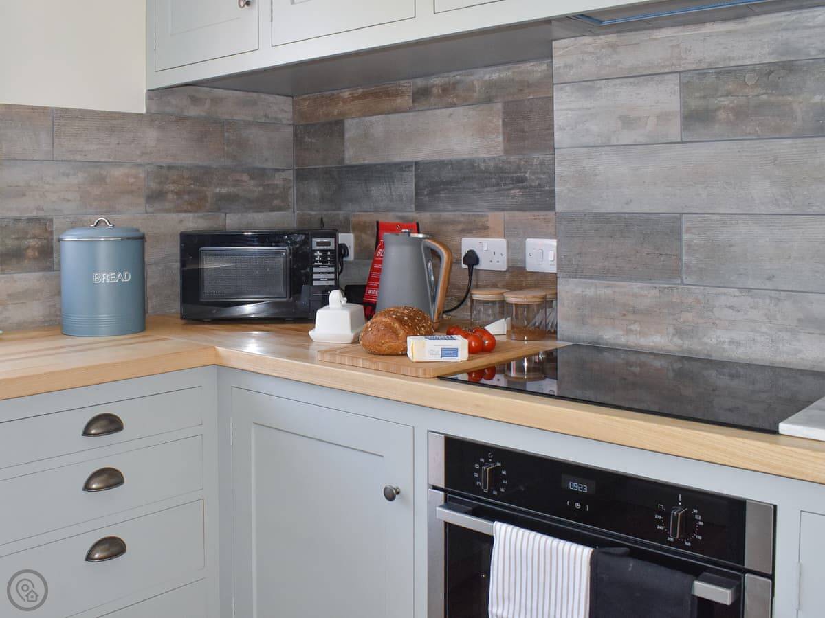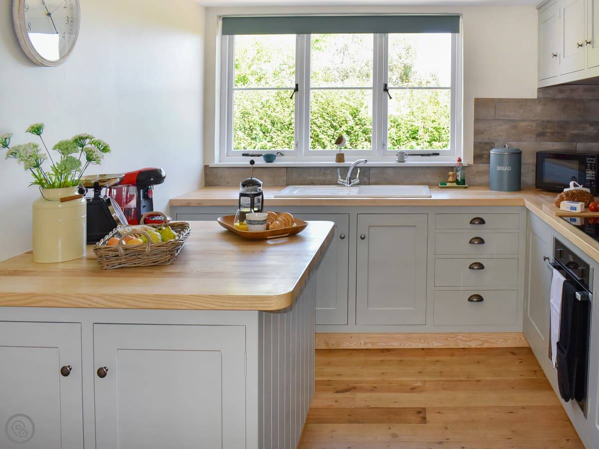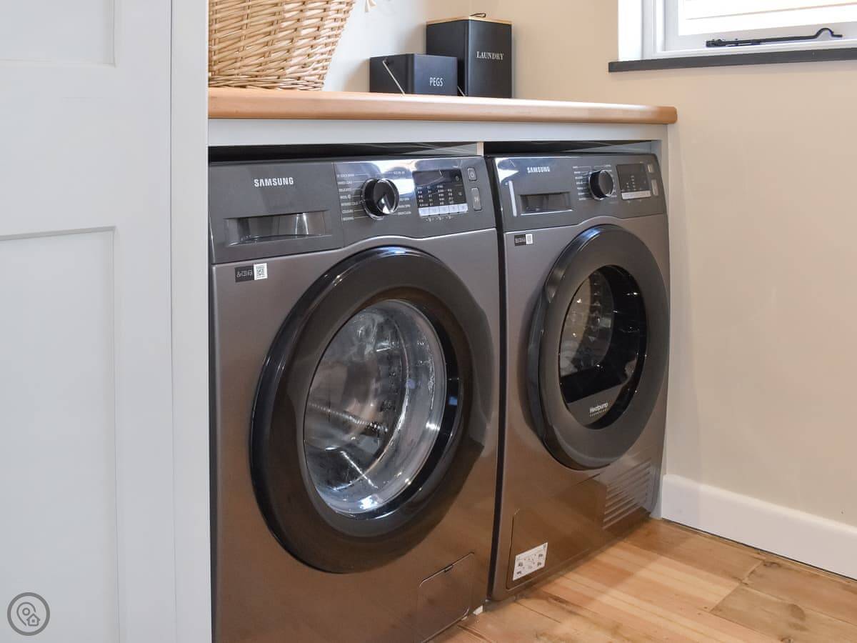Inside, it's all been refurbished recently, so it feels fresh. There's a wood burner in the living room. The kitchen has a dishwasher, and there's a utility room with a washing machine and tumble dryer. Plenty of space.