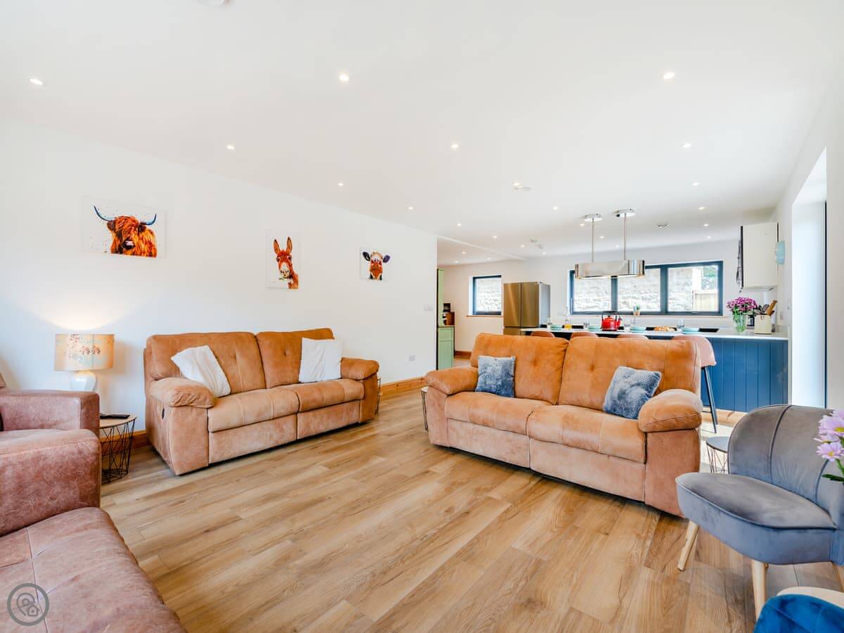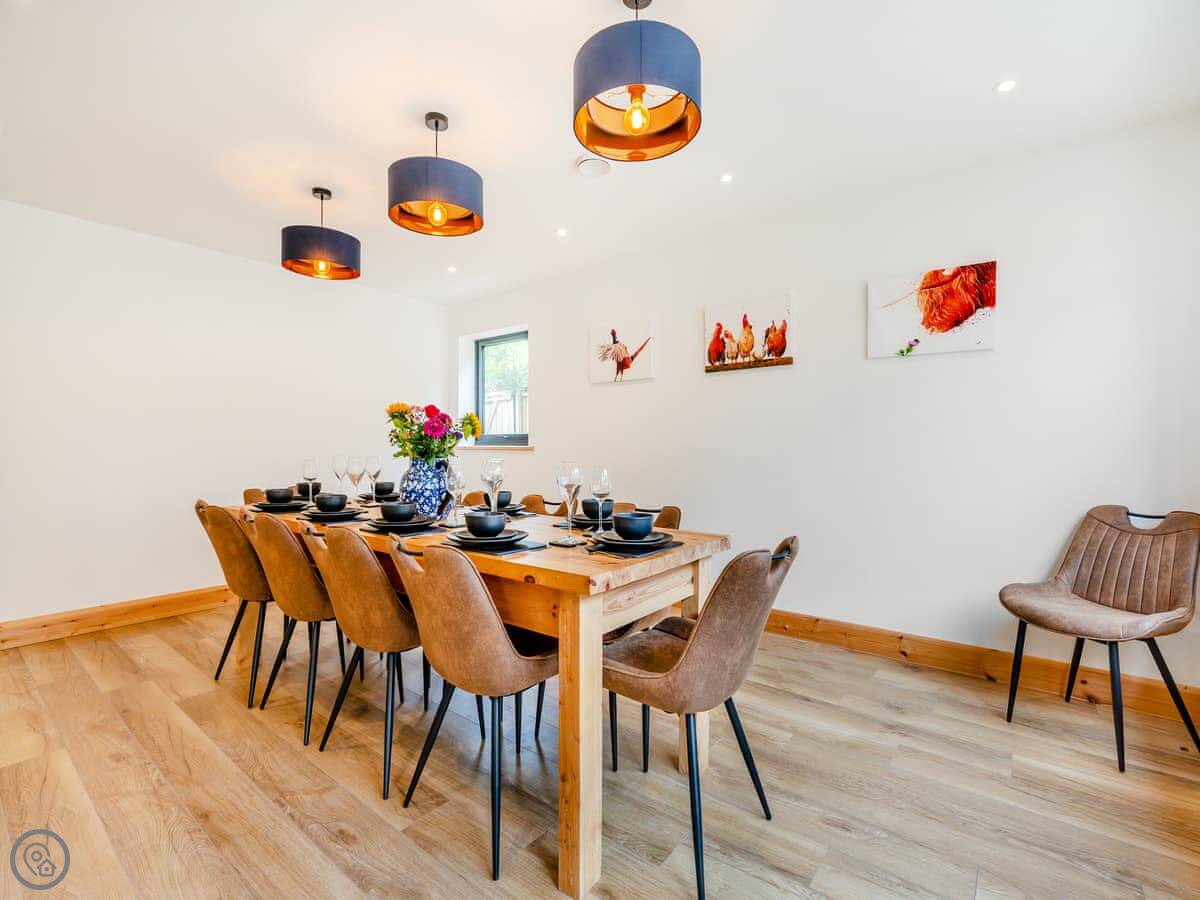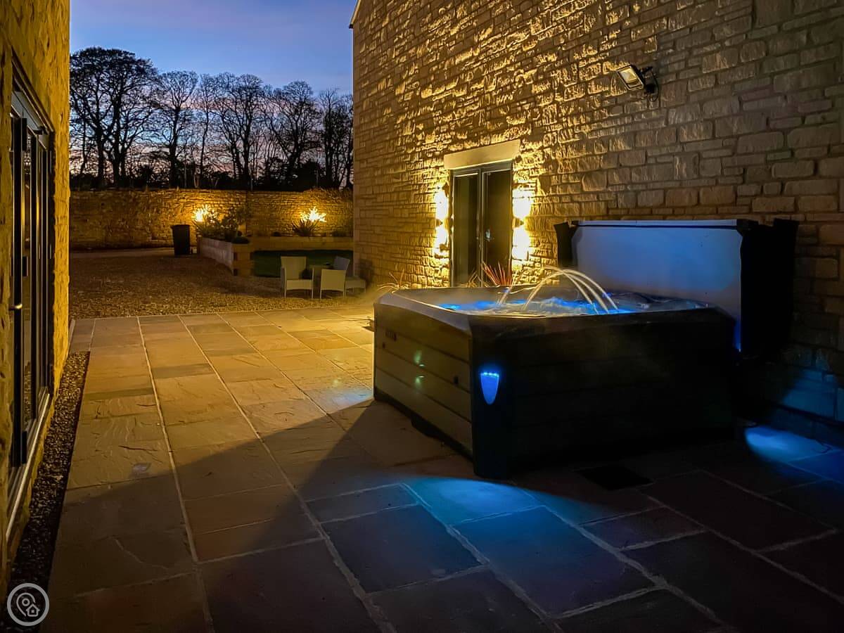 The main living area is open plan. The kitchen is big and well-equipped. There's a large dining table. The seating area is comfortable. Outside, there's a decent sized garden with a lawn and a patio. The hot tub is on the patio and seats six.