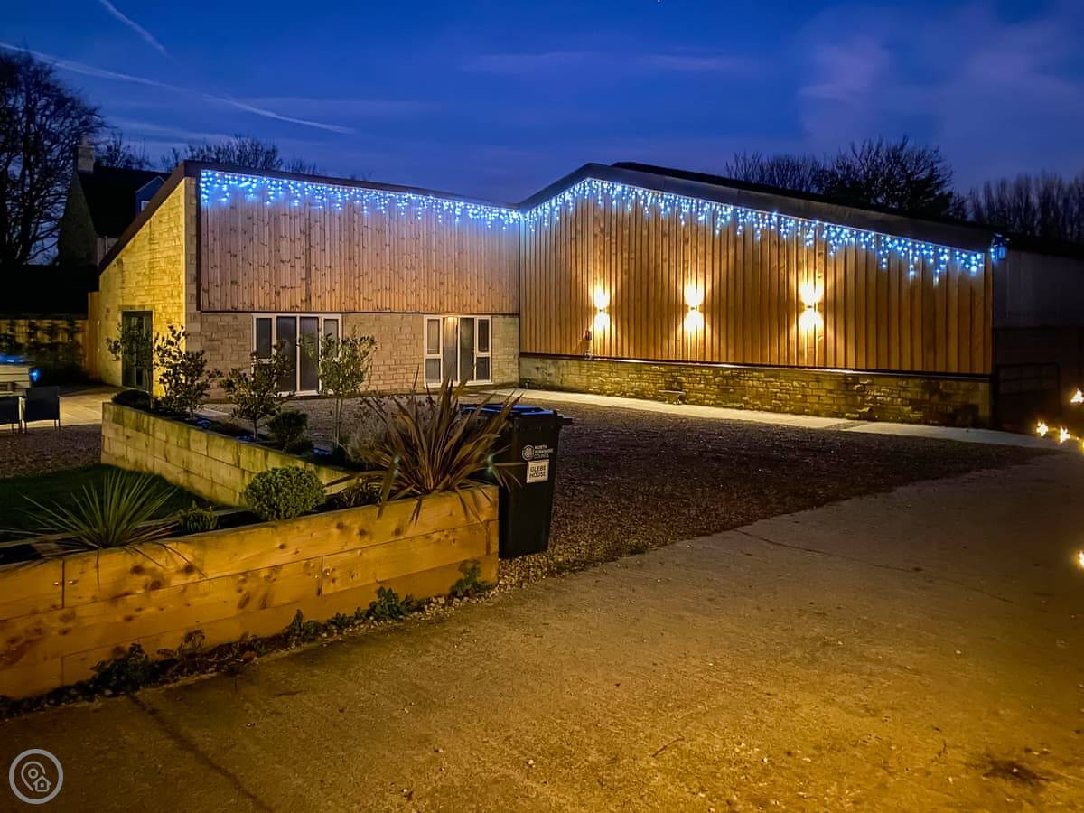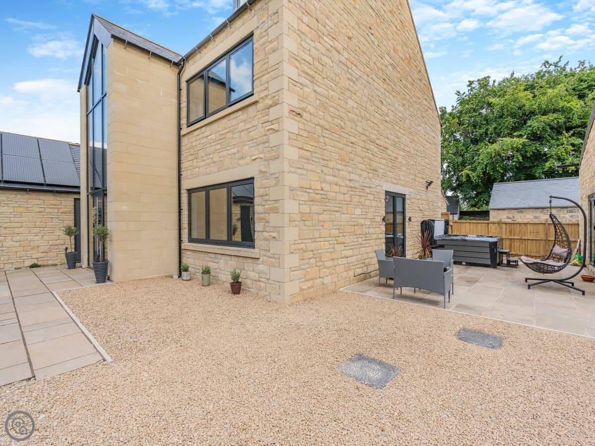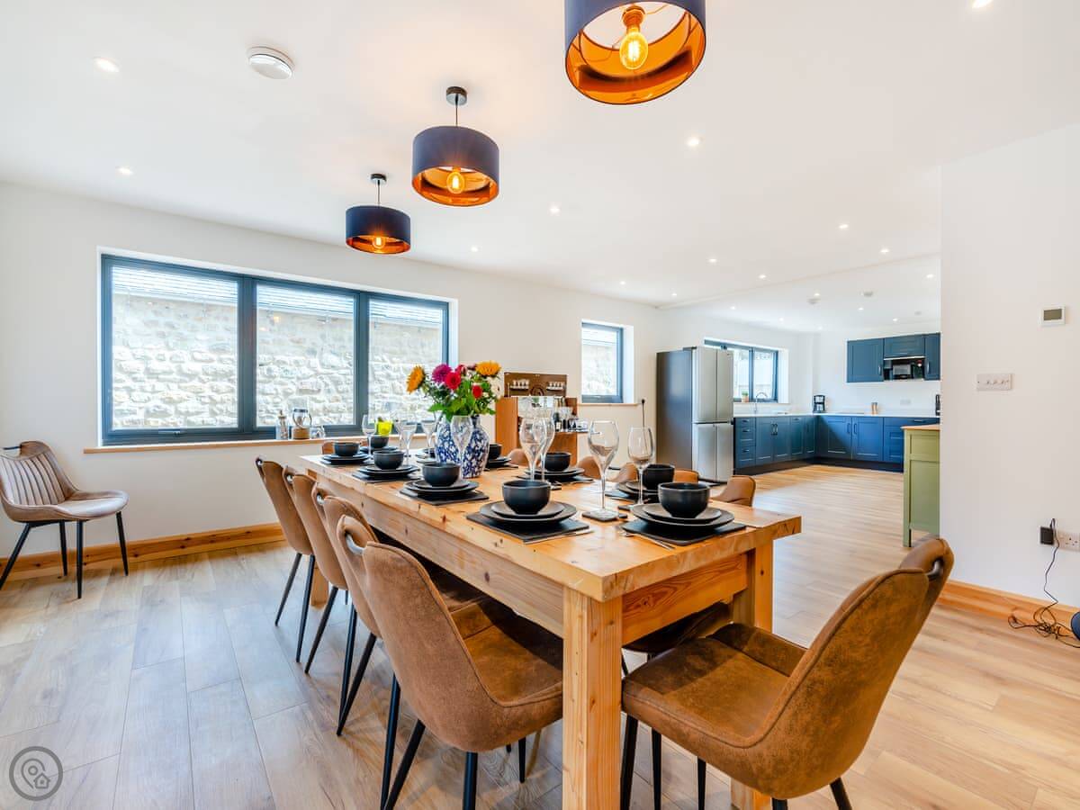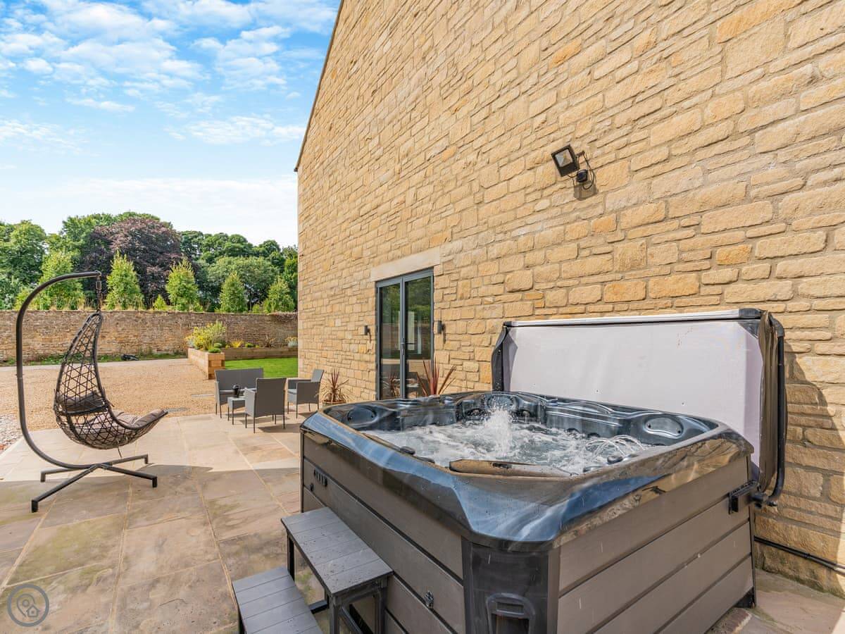 The main living area is open plan. The kitchen is big and well-equipped. There's a large dining table. The seating area is comfortable. Outside, there's a decent sized garden with a lawn and a patio. The hot tub is on the patio and seats six.