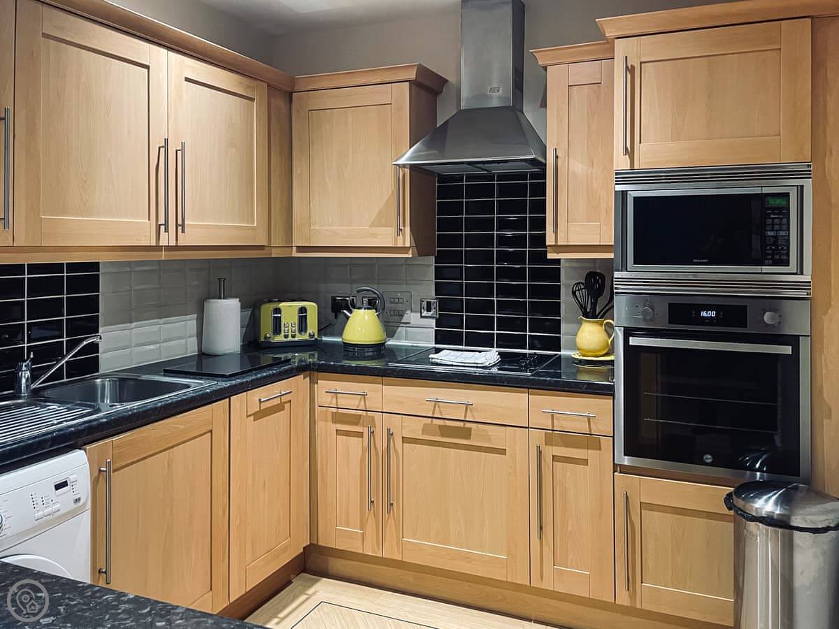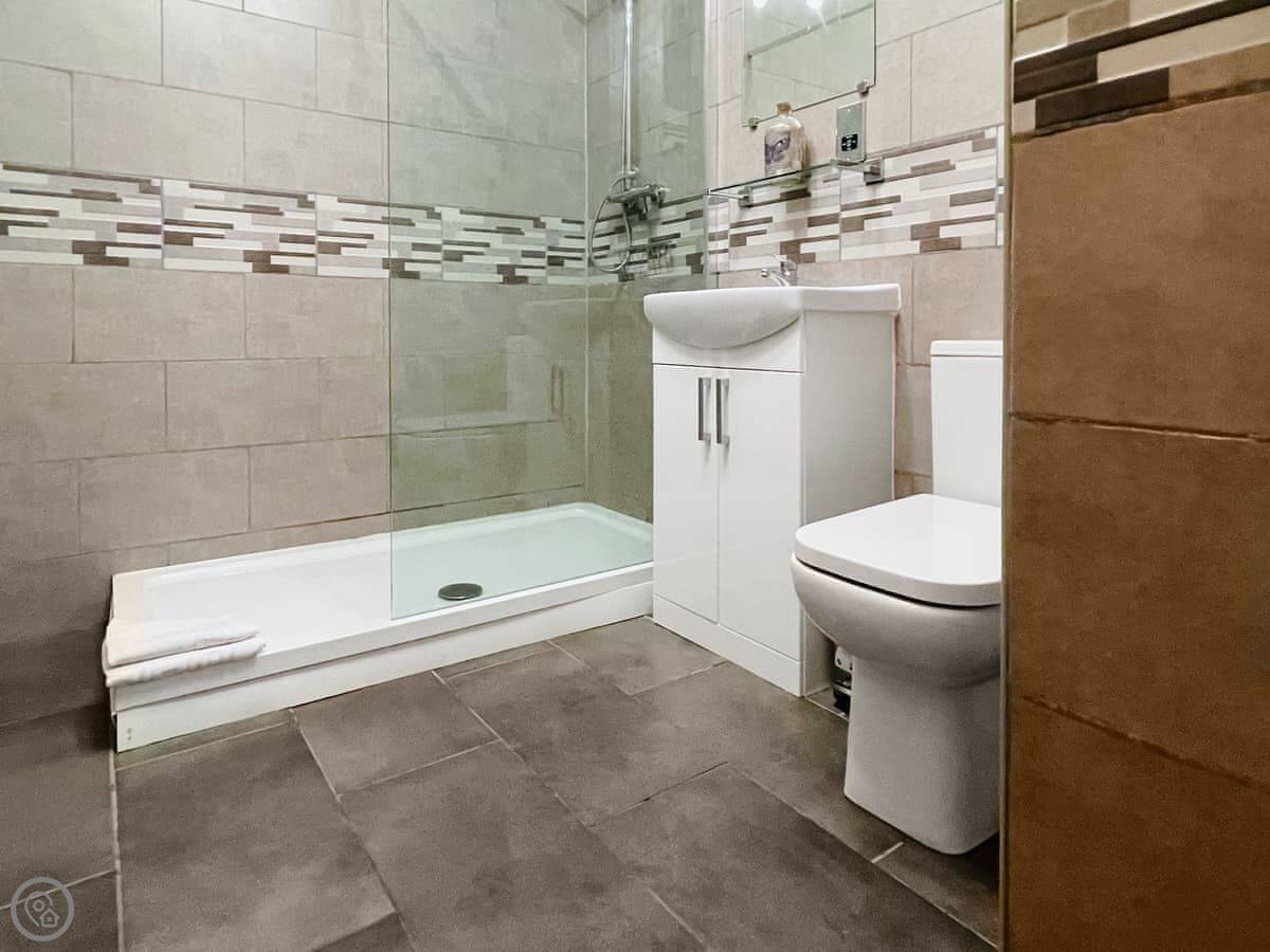 The flat has an open plan living area with a kitchen and a sofa. There's a Smart TV and WiFi. The bathroom has a walk-in shower. The bedroom has a kingsize bed. Everything you'd need is there: washing machine, dishwasher, bedding and towels are included. There's a little patio area with outdoor furniture.