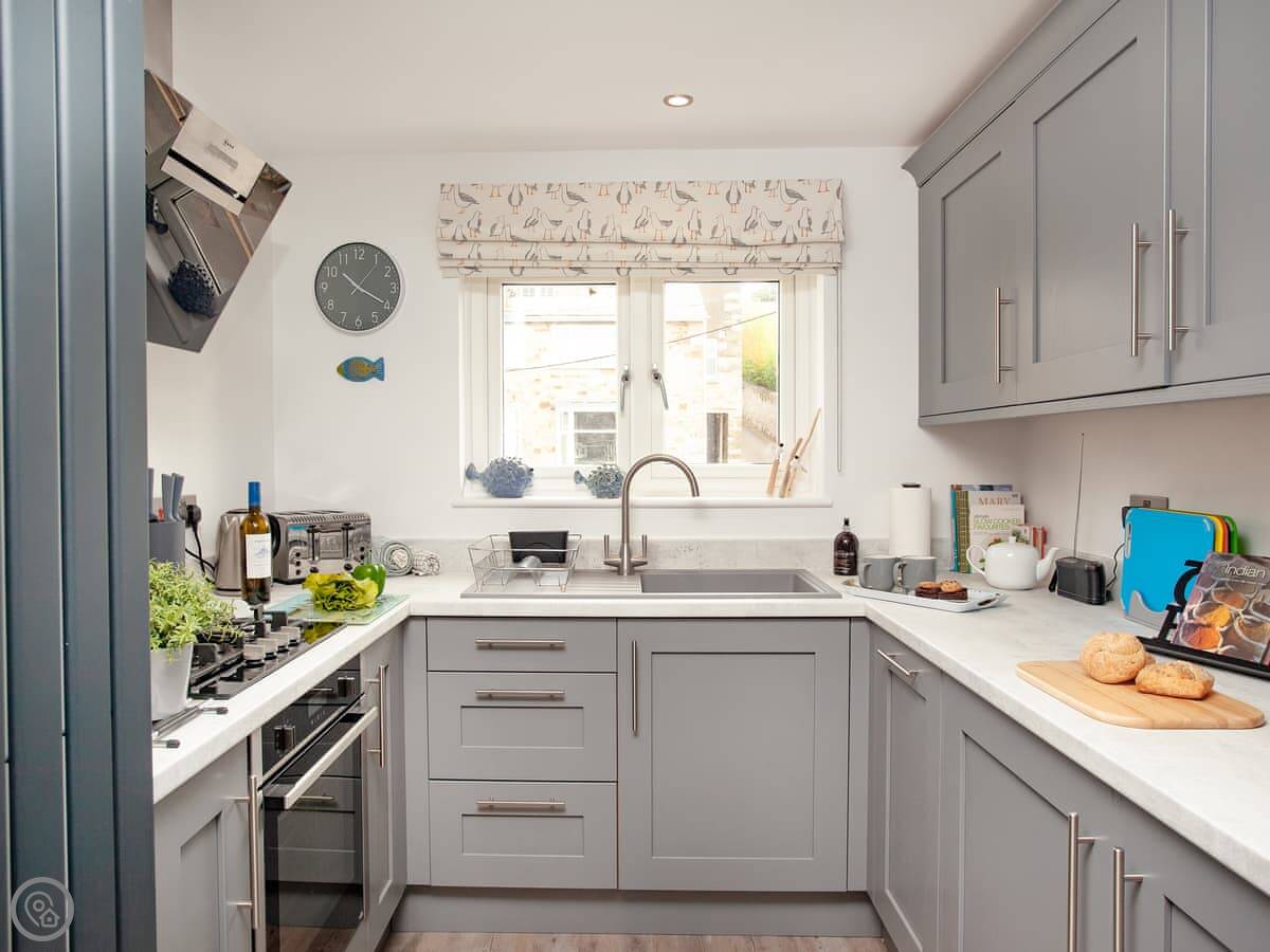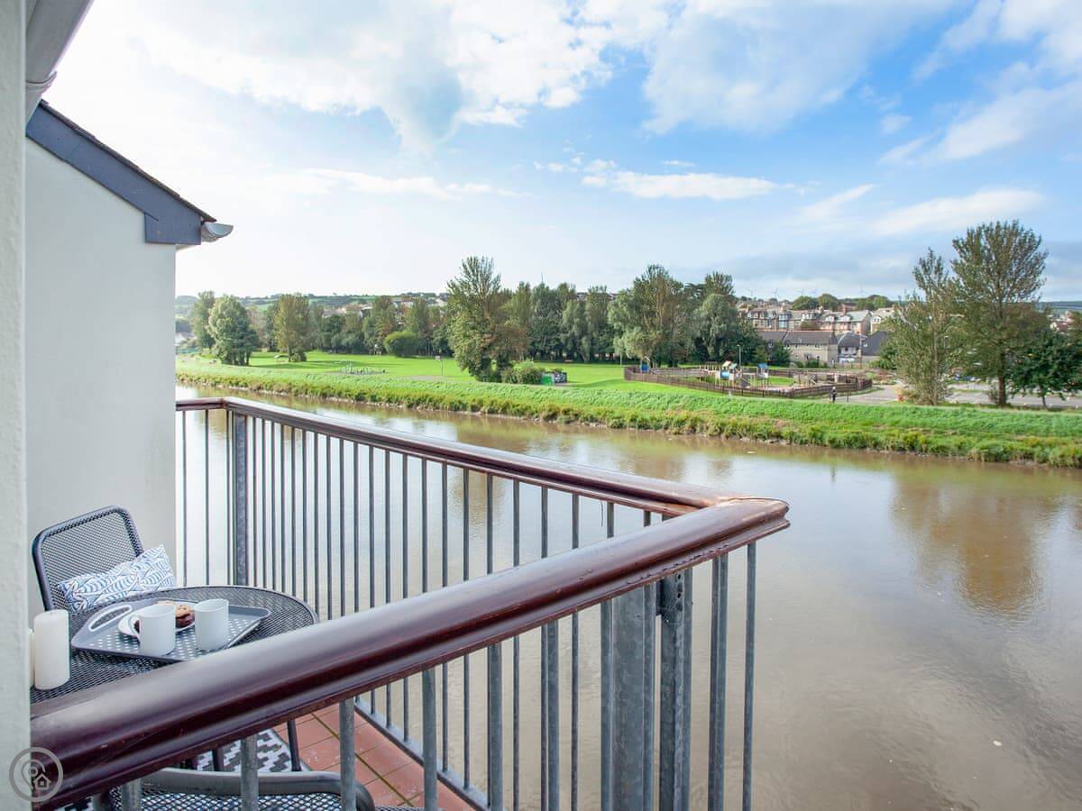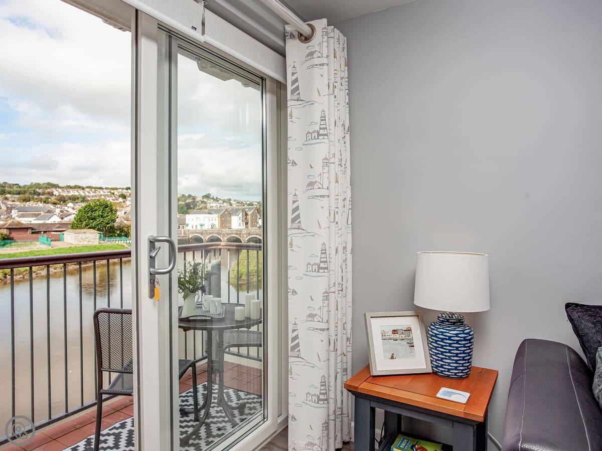 The living area is open plan. There's a big TV. The kitchen is new, with a dishwasher and washing machine. There's a small private balcony you can sit on. You look out over the estuary and the river.