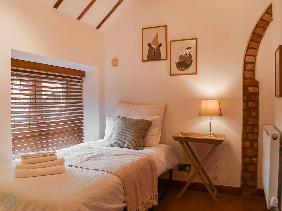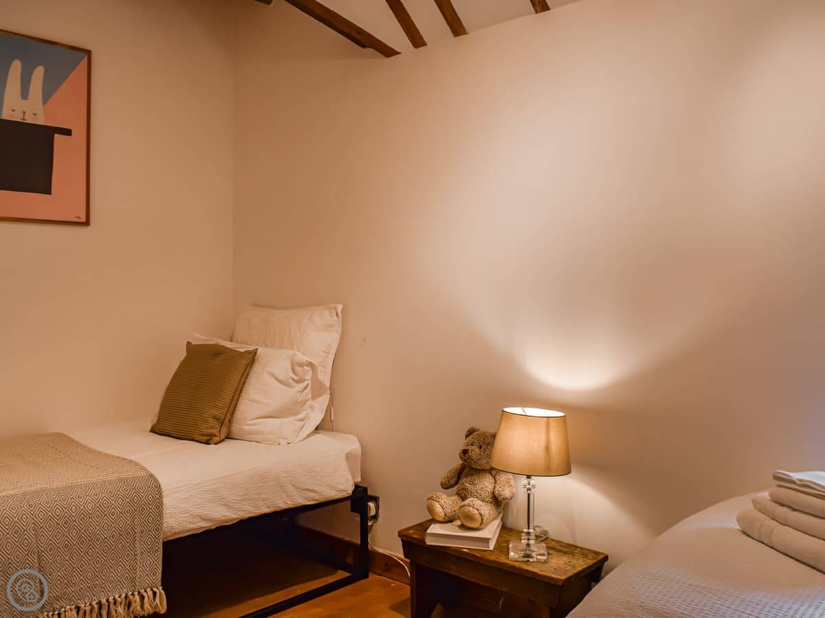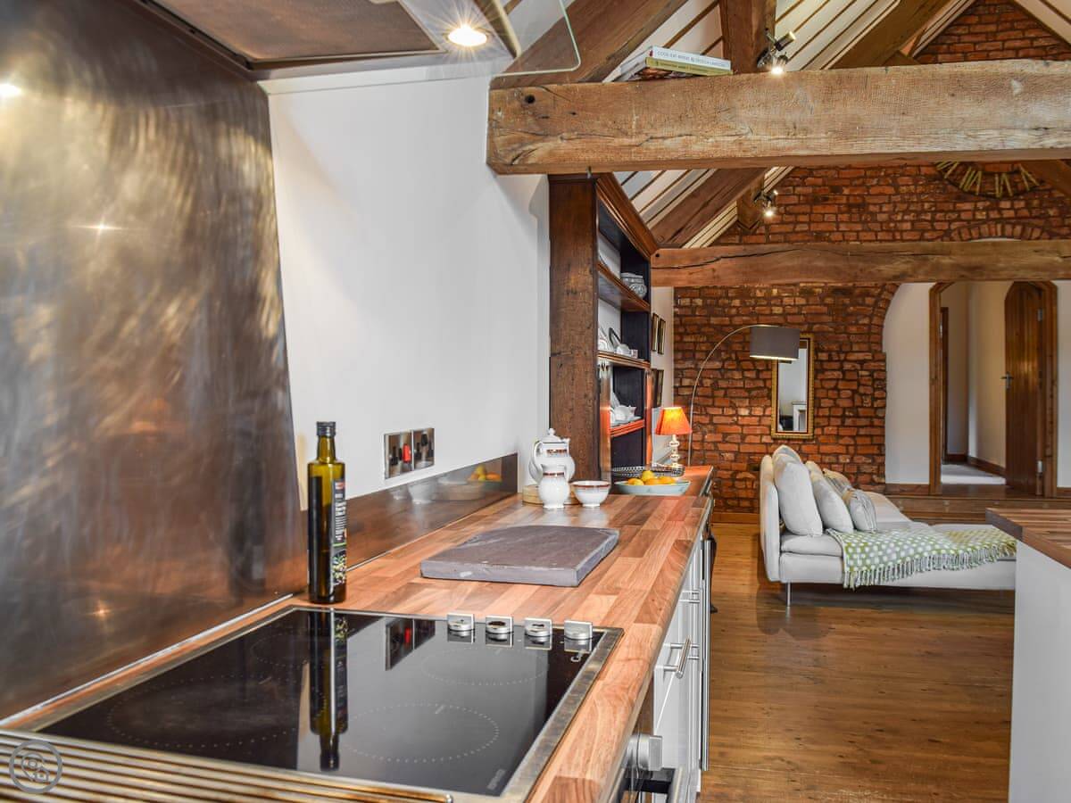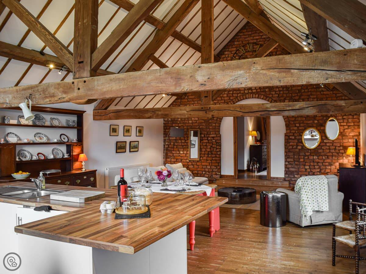 It sleeps four. Two bedrooms, both with their own bathrooms. One has a super king bed. The other has two single beds, built up on a platform. The ceilings are high and beamed, and one wall is the old brick. The main room is all open plan.