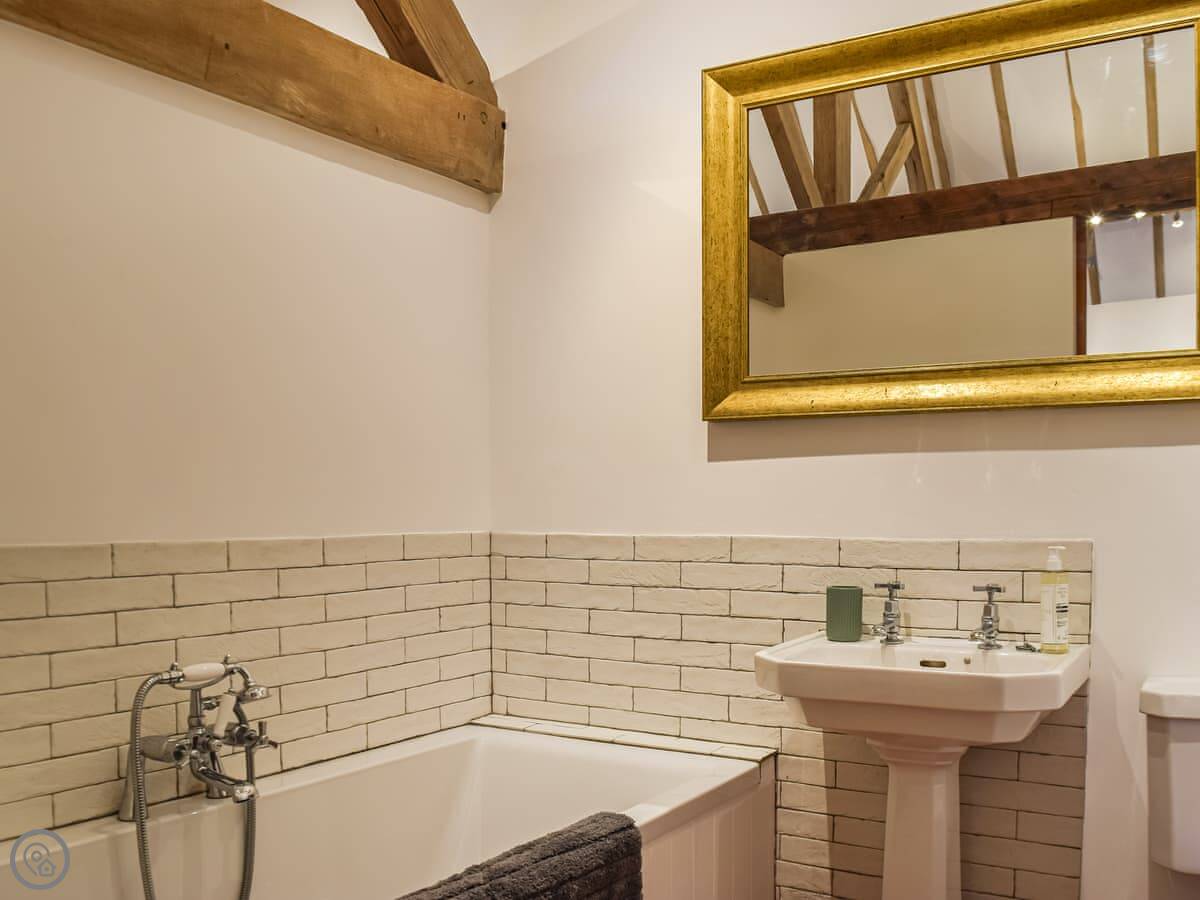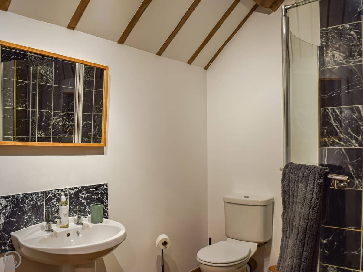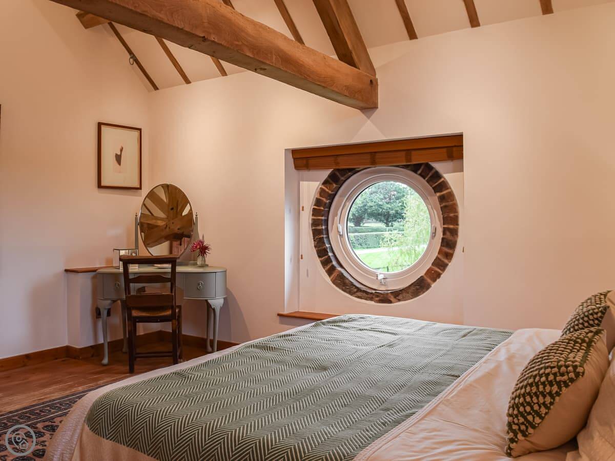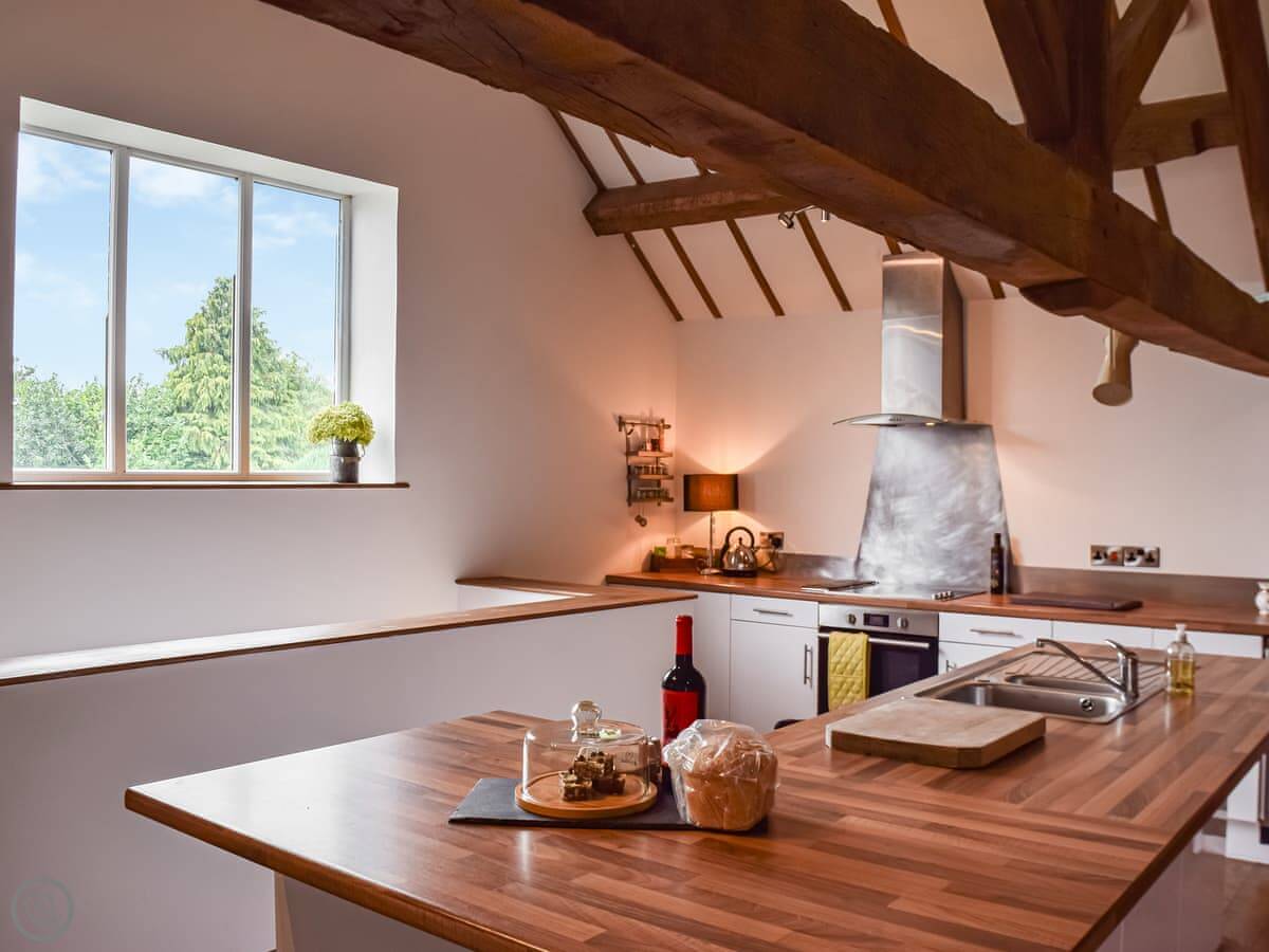 It sleeps four. Two bedrooms, both with their own bathrooms. One has a super king bed. The other has two single beds, built up on a platform. The ceilings are high and beamed, and one wall is the old brick. The main room is all open plan.