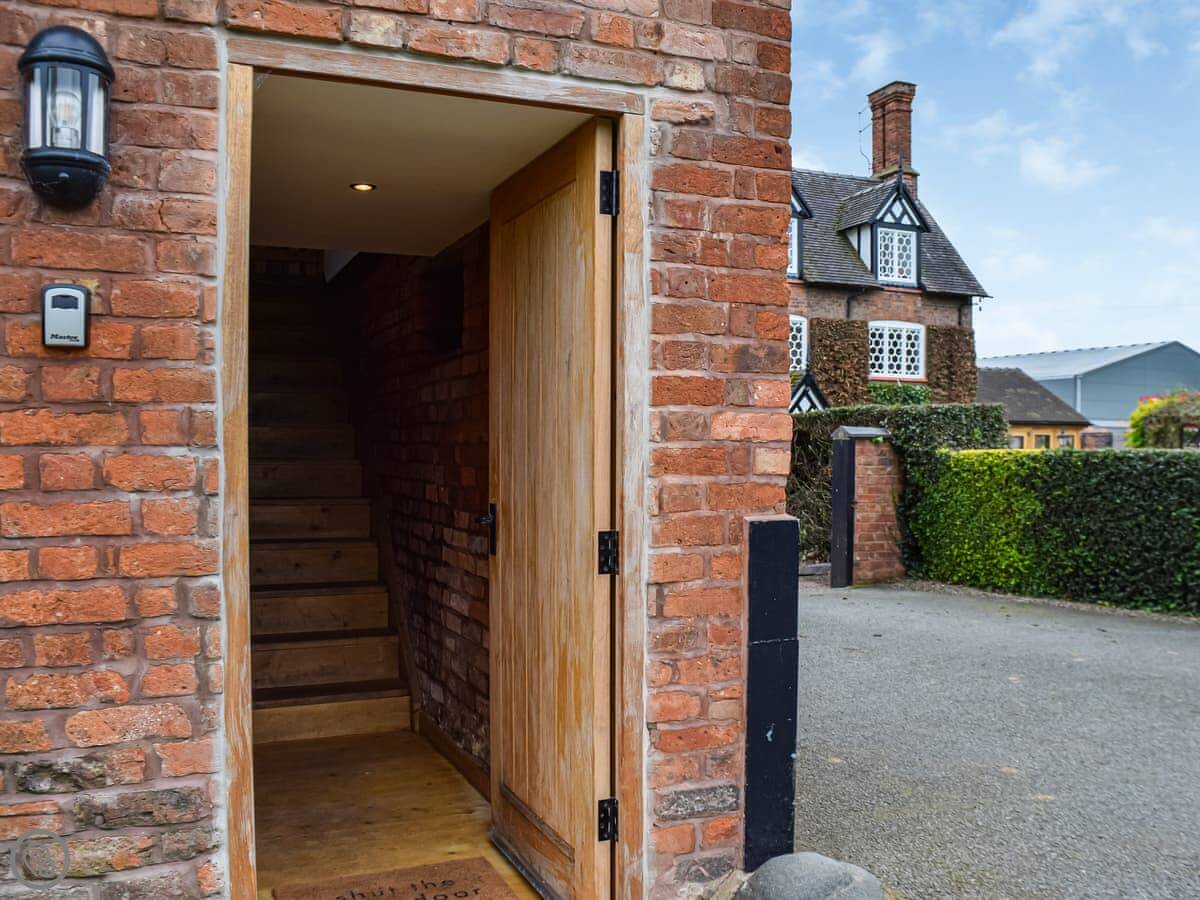 There's a seating area at the front with a view over the fields. Parking is right there. The stairs up to the apartment are a proper farm building staircase. They're steep and a bit narrow.