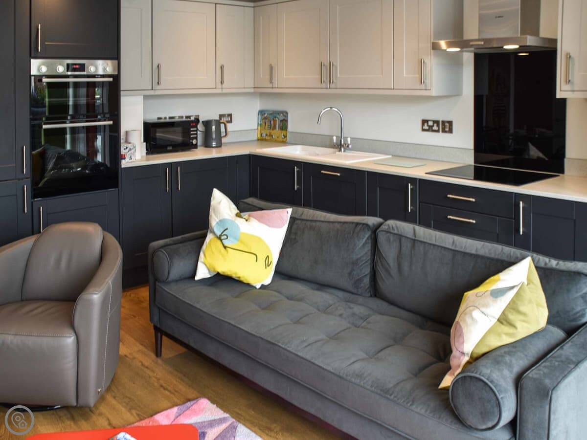 Inside, it's open plan. There's a kitchen area, a dining table, and the living space with sofas. It's all clean and well kept. The rating is 5 Star, which means it has everything you'd need and is in good order.