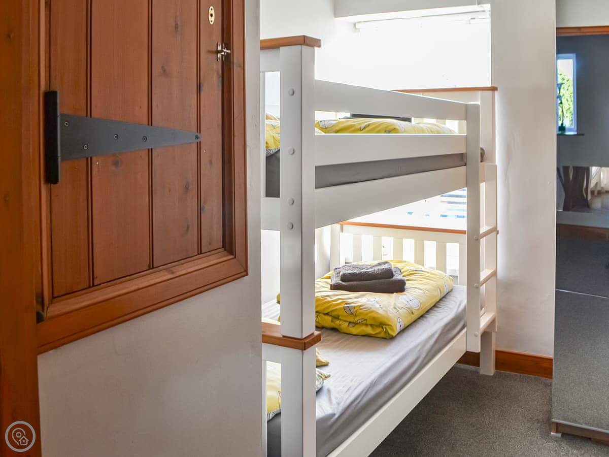 Inside, it's small but it works. The stairs are cottage stairs, so a bit steep and narrow. The main bedroom has a king-size bed. The second room has full-sized adult bunk beds. The bathroom has a shower over the bath.