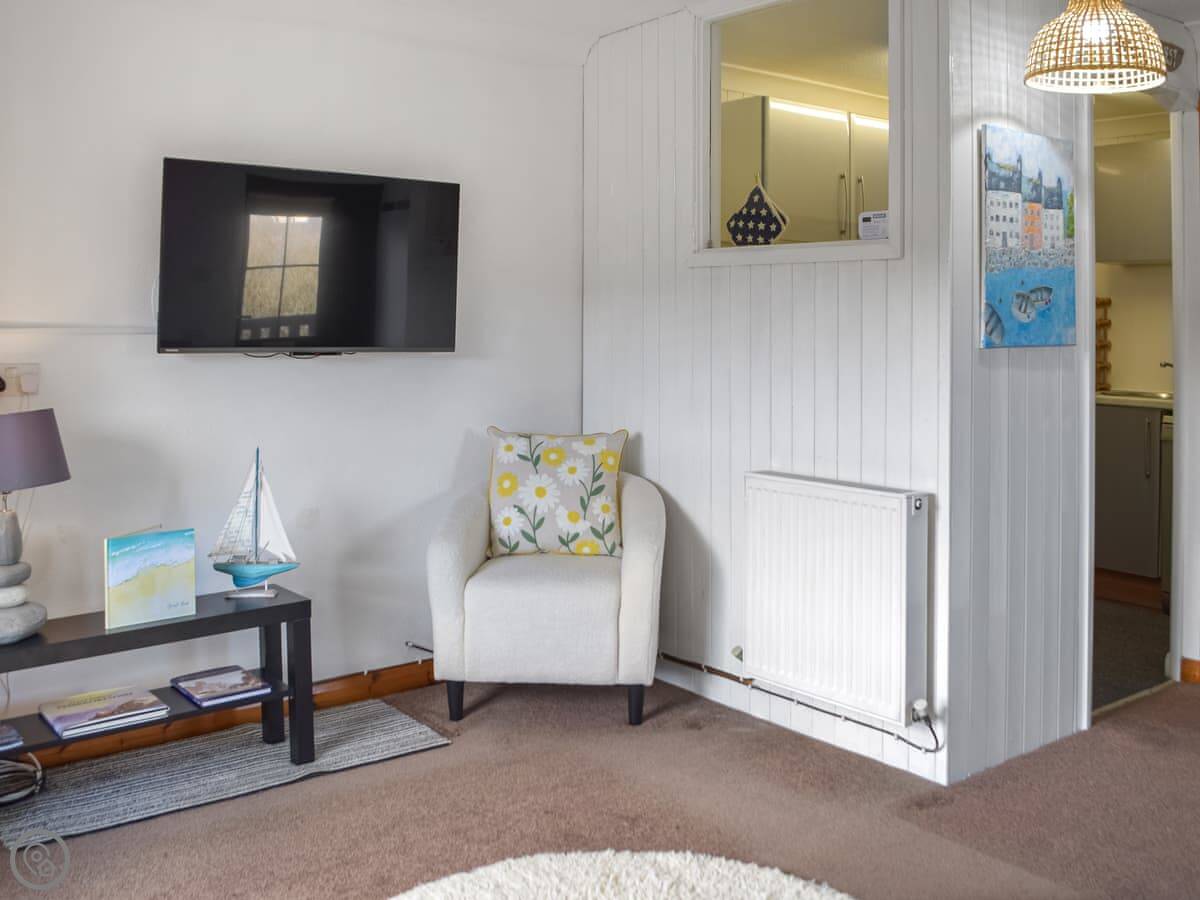 The living area is open plan with a separate kitchen. It's bright. There are two wooden decked balconies. One has a view of the sea.