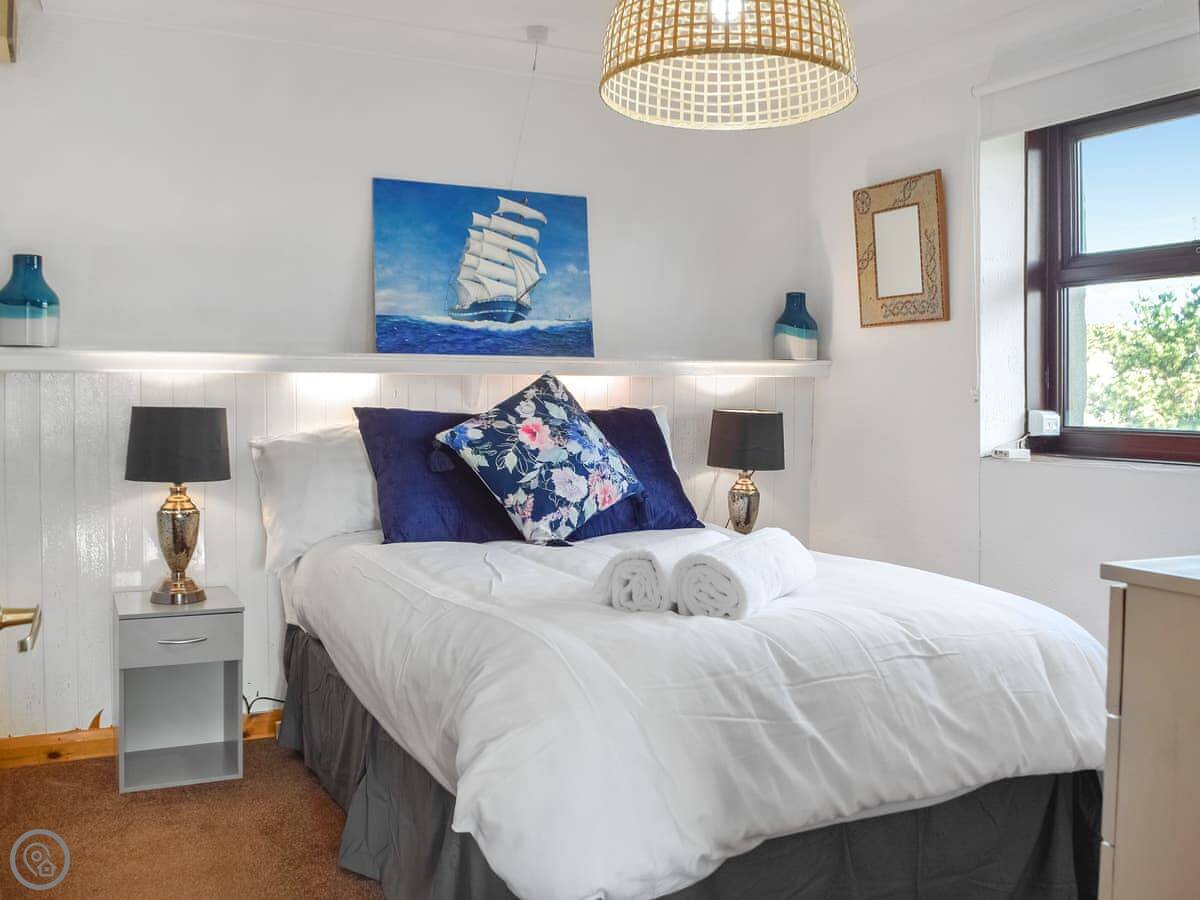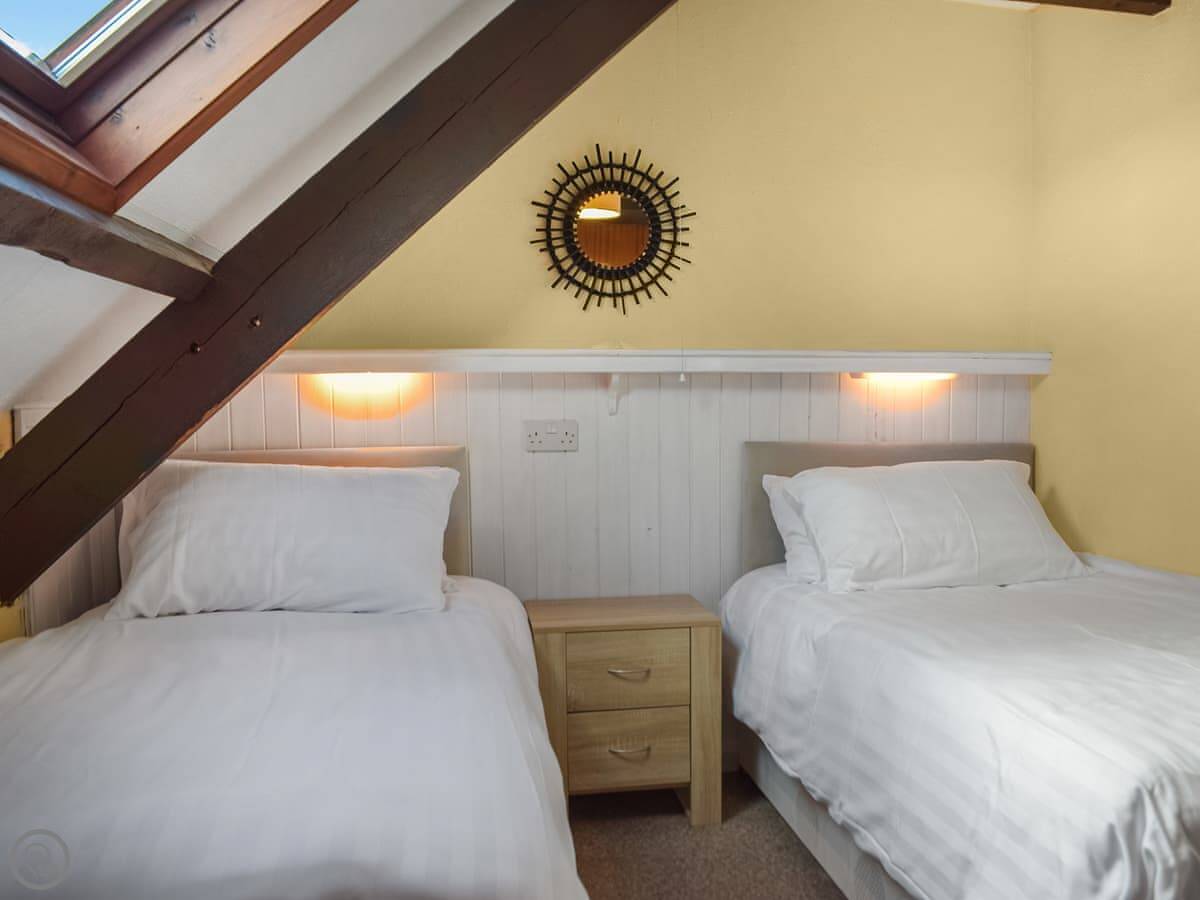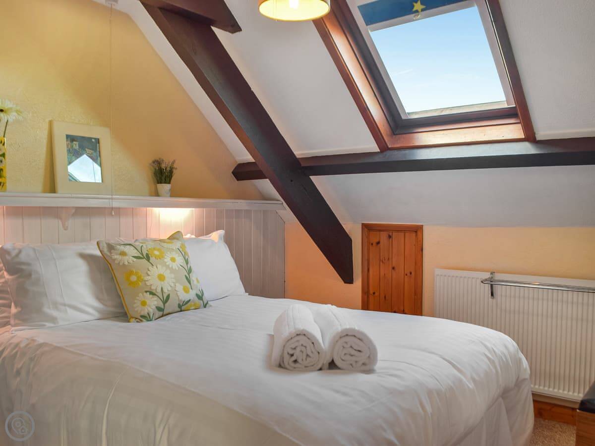 It sleeps four. Three bedrooms and two bathrooms. One is an en-suite shower room off the main bedroom downstairs. The other two bedrooms are upstairs under the eaves. They've got wooden beams, so watch your head if you're tall.