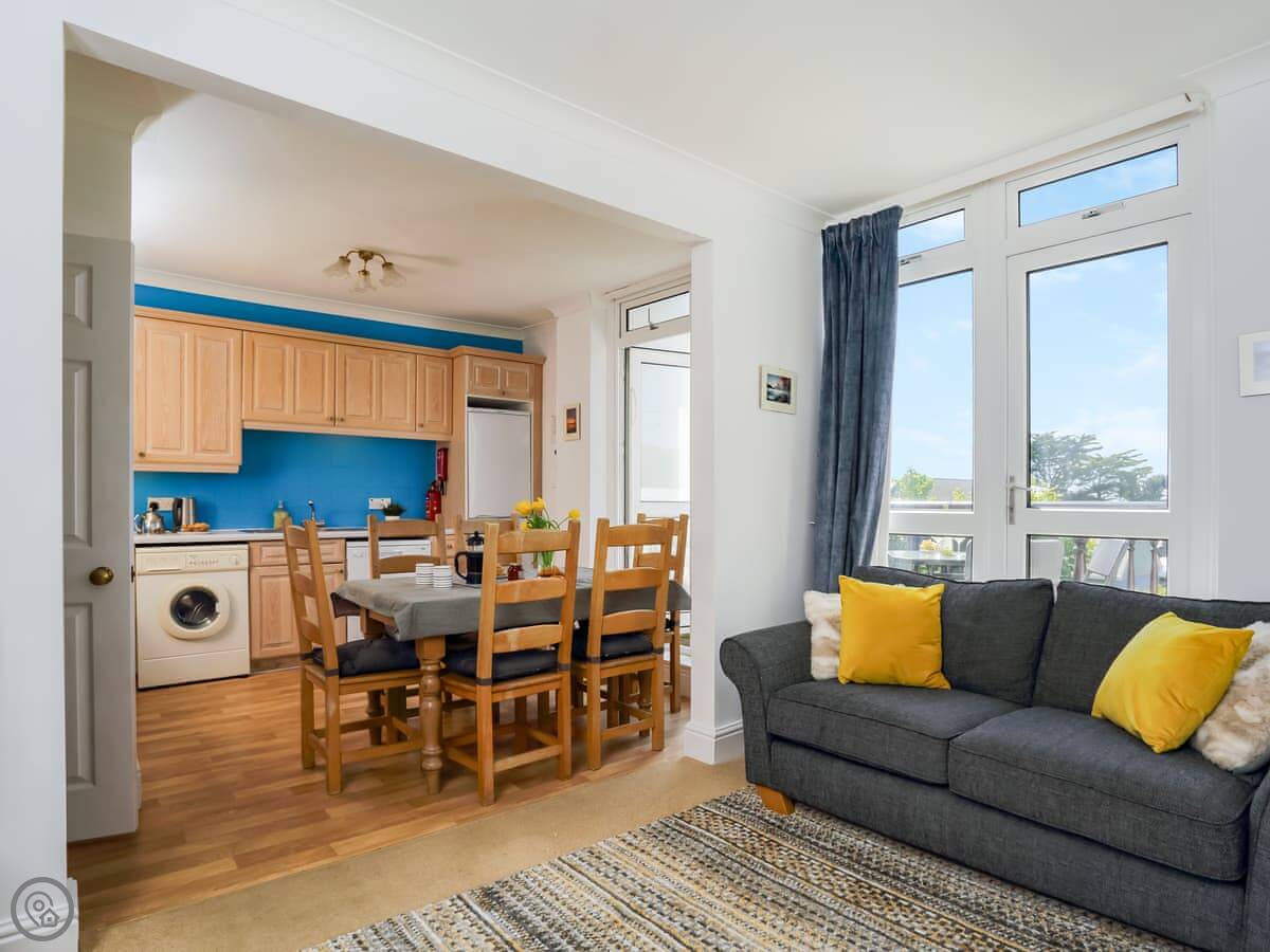 The living area is open plan, with patio doors to the balcony. There’s a smart TV, a kitchen with a dishwasher, and a washing machine. There’s also a bathroom with a proper bath, which is handy.