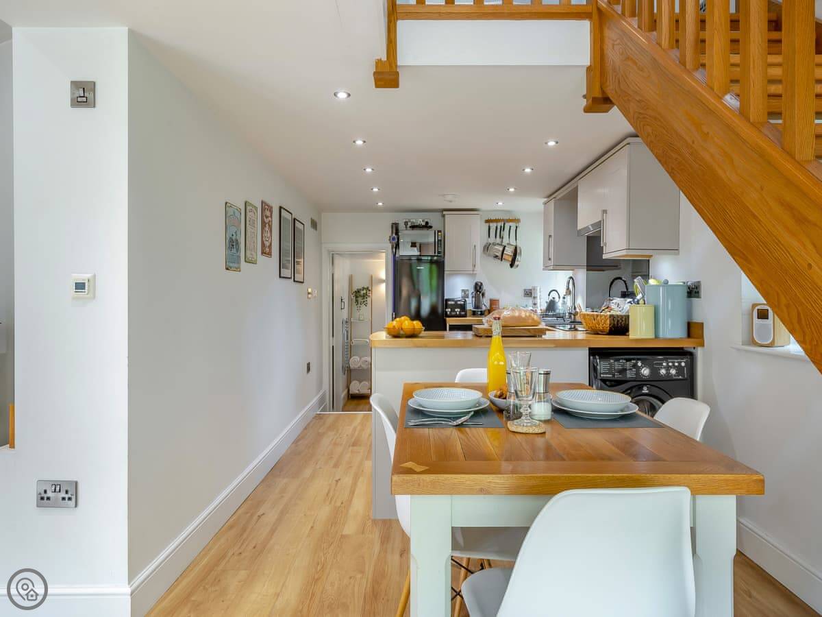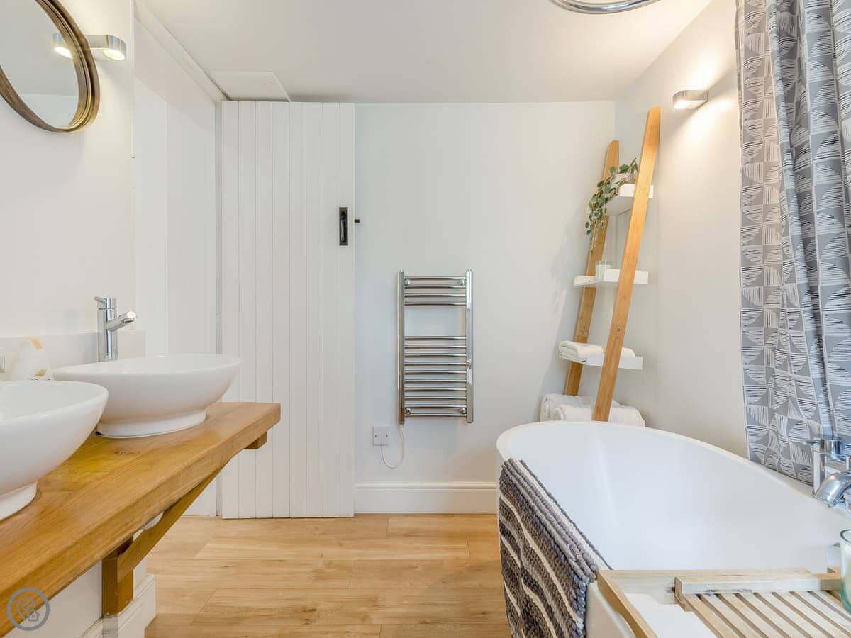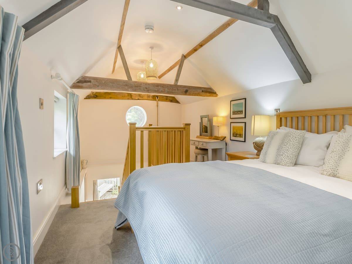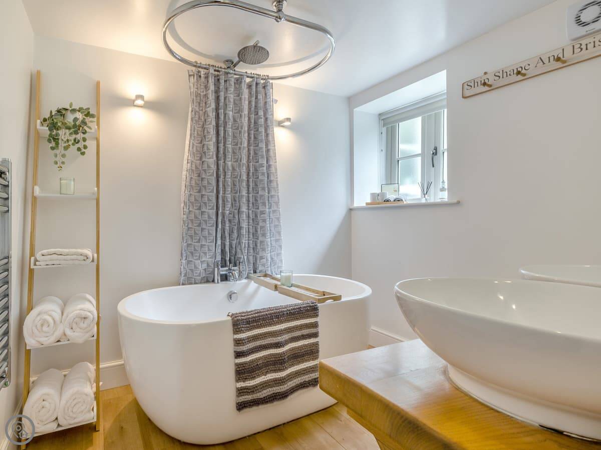 Downstairs is the living room, kitchen, and bathroom. The bathroom has a deep bath with a shower over it. Upstairs is the bedroom. It's open-plan under the eaves with the bed and a small seating area. The stairs are steep and narrow, just so you know.