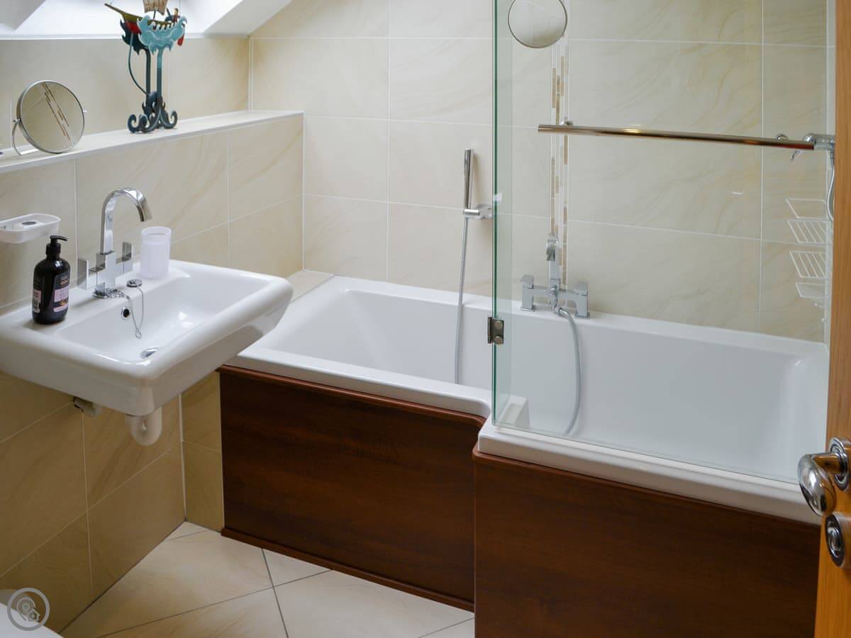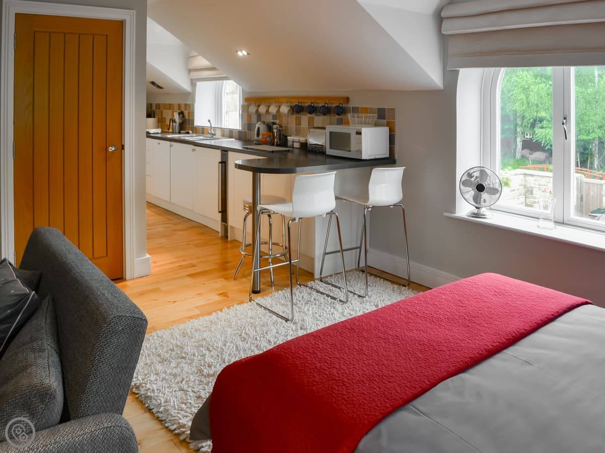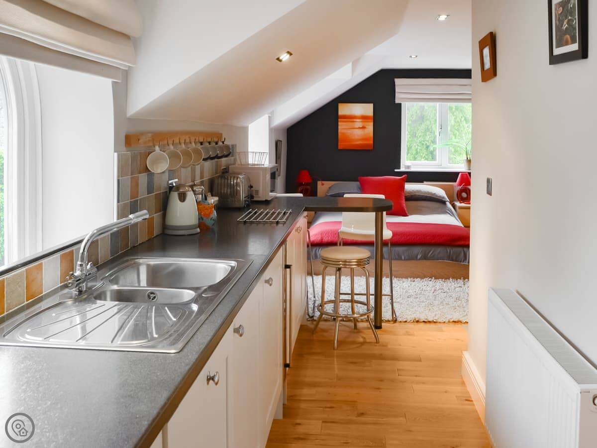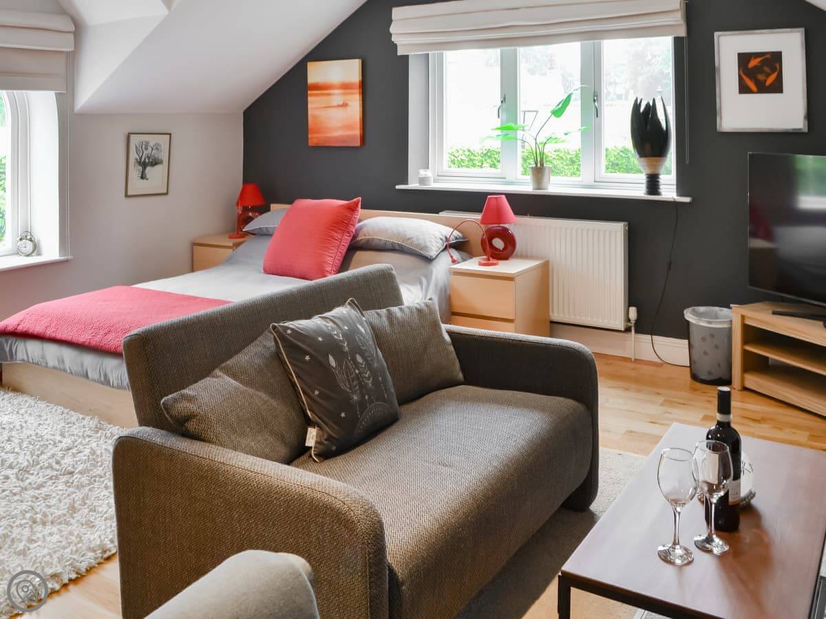It's a studio, so the living, sleeping, and kitchen areas are all in one room. There's a super king size bed. The kitchen is proper, with a dishwasher and washing machine. There's a TV, a flame effect electric fire, and the bathroom has a shower over the bath.