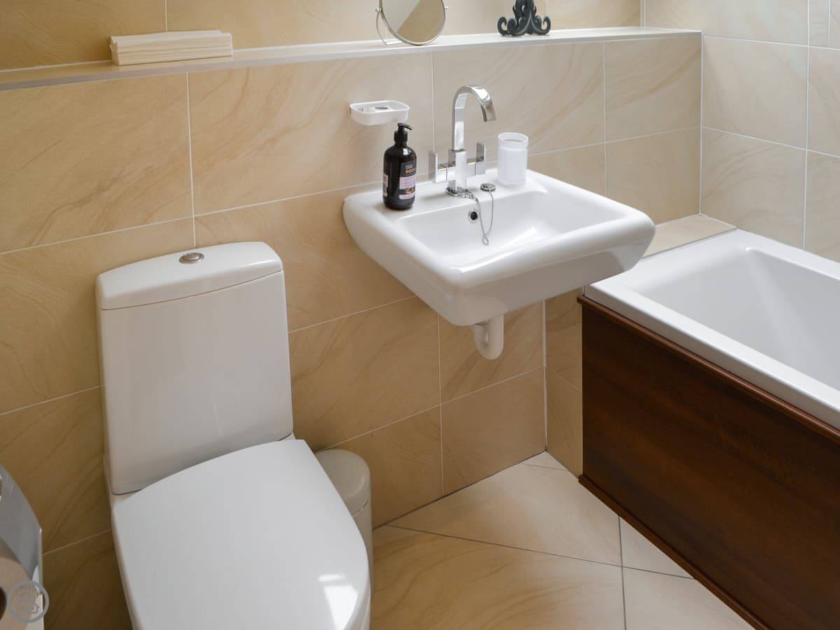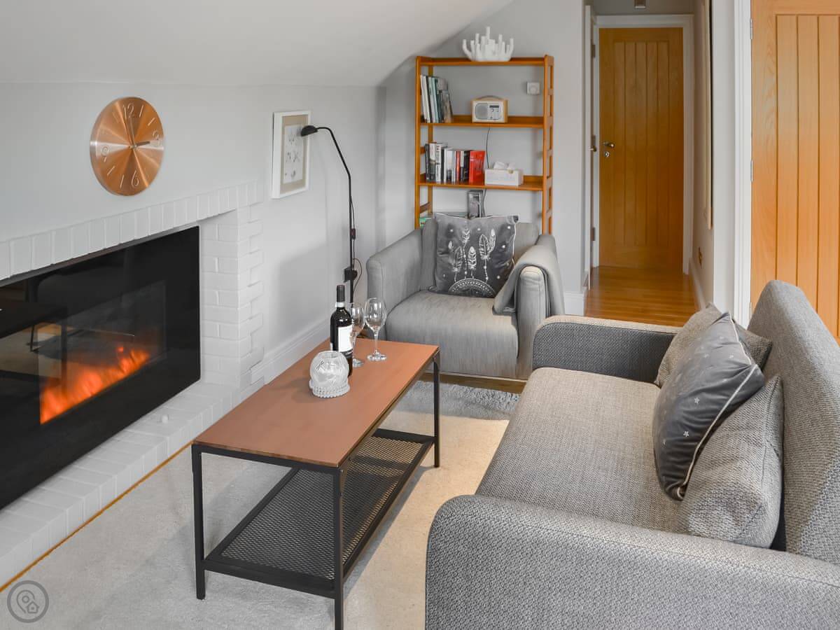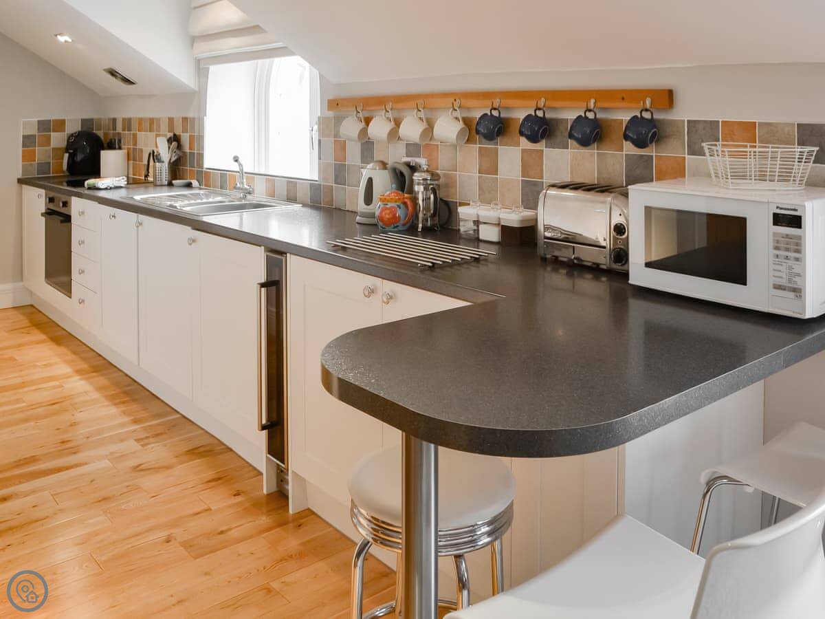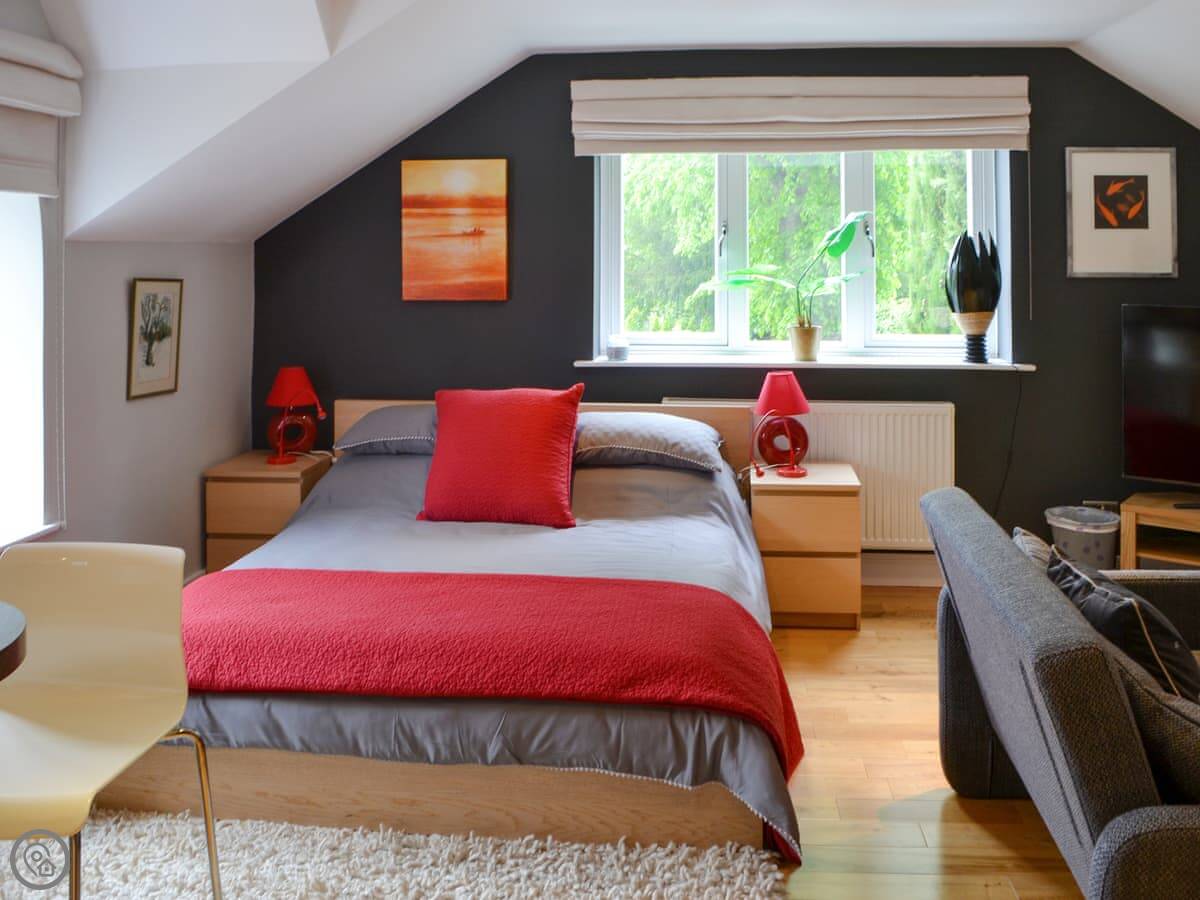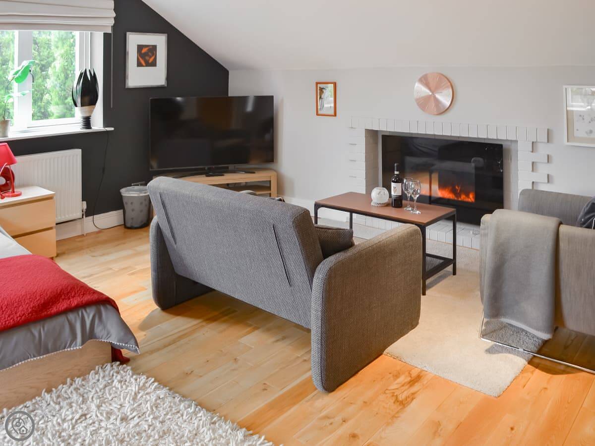 It's a studio, so the living, sleeping, and kitchen areas are all in one room. There's a super king size bed. The kitchen is proper, with a dishwasher and washing machine. There's a TV, a flame effect electric fire, and the bathroom has a shower over the bath.