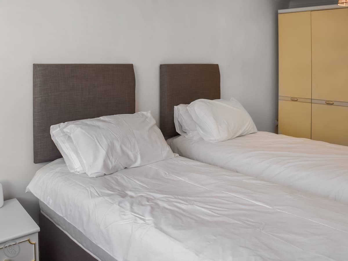 It sleeps four. Two bedrooms and one bathroom. The main bedroom has a Superking bed that splits into two singles if you need it. The bathroom has a shower over the bath. It's got a 4 Star rating, which means it's well-equipped and comfortable.