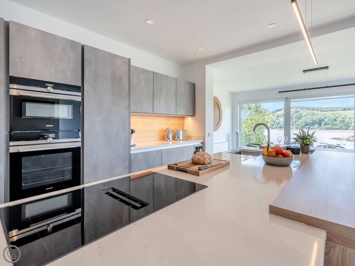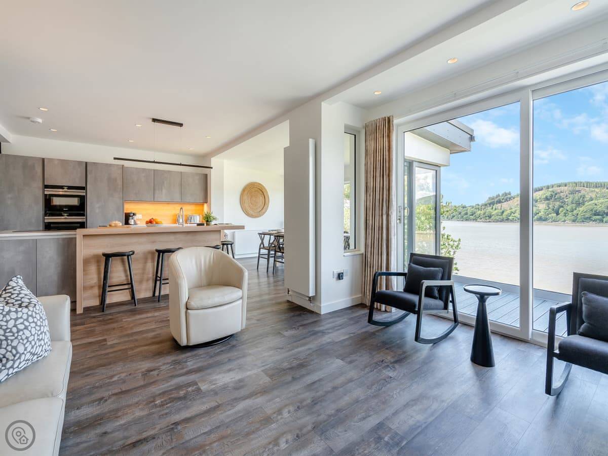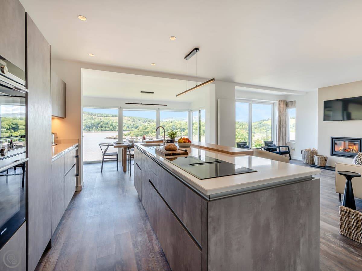 The main living area is open plan. Big windows and patio doors lead out to a balcony. That's where you'll sit. There's a wood burner for cooler nights. The kitchen has the usual stuff: dishwasher, washing machine.