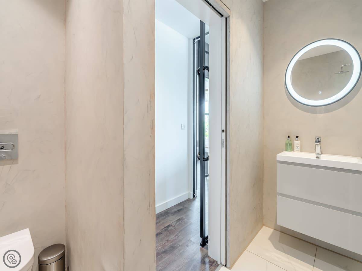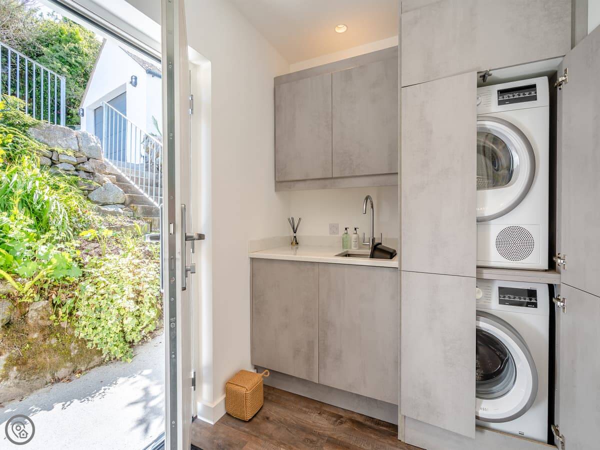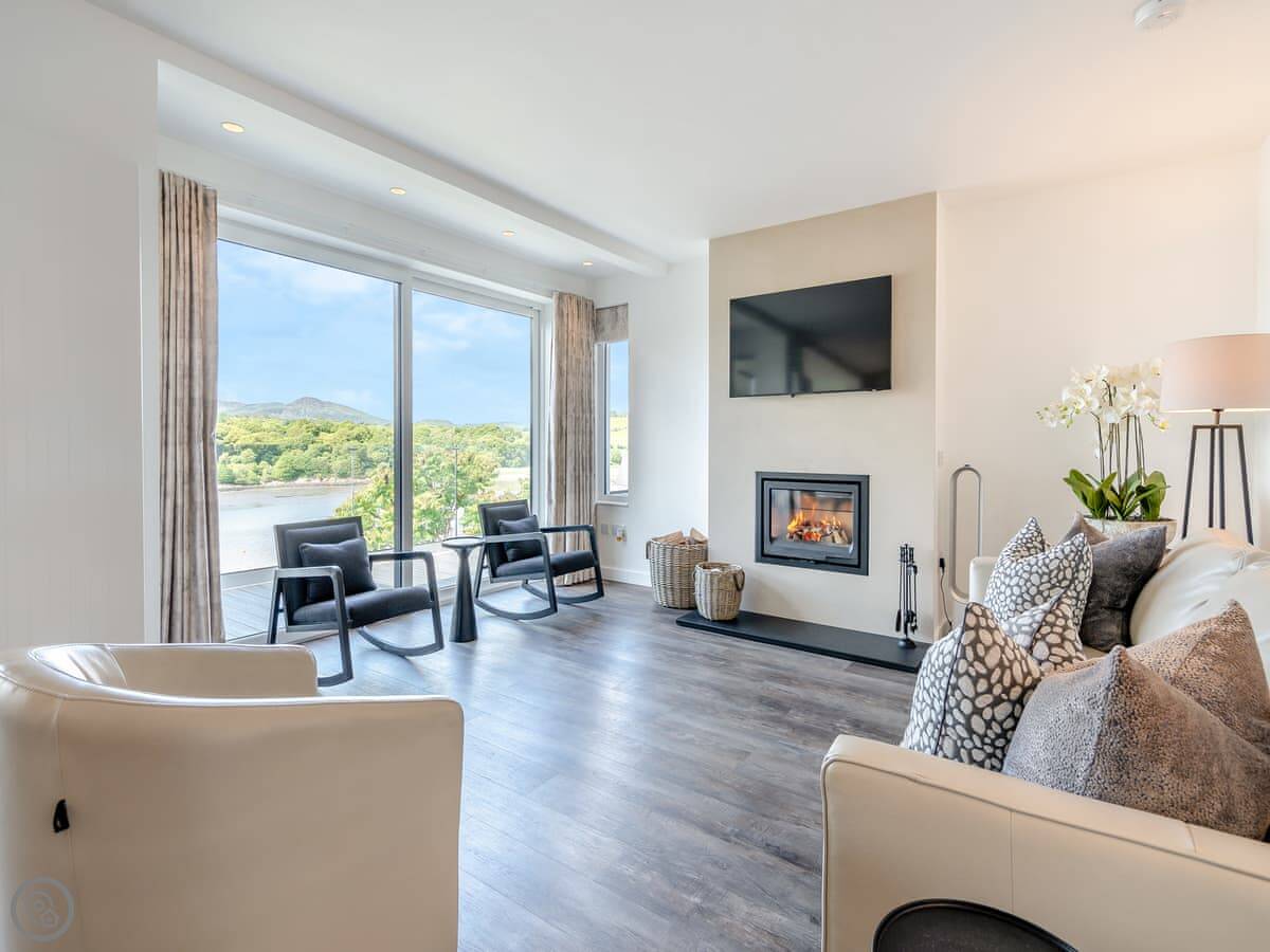 The main living area is open plan. Big windows and patio doors lead out to a balcony. That's where you'll sit. There's a wood burner for cooler nights. The kitchen has the usual stuff: dishwasher, washing machine.