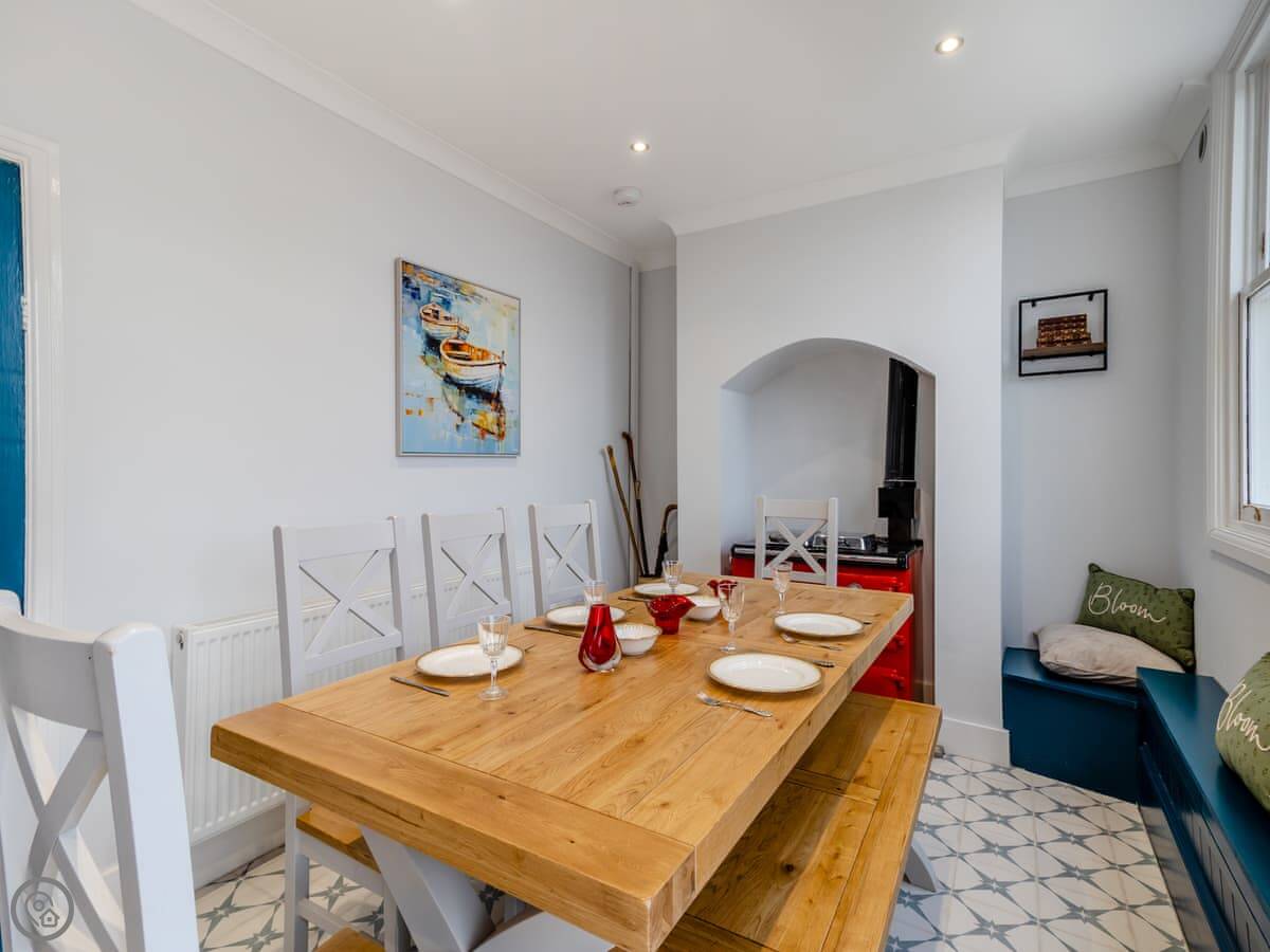 The kitchen is large and has a table and a sofa area. There's a smaller snug room with a TV and a fire. The stairs are fine, typical for a house this age.