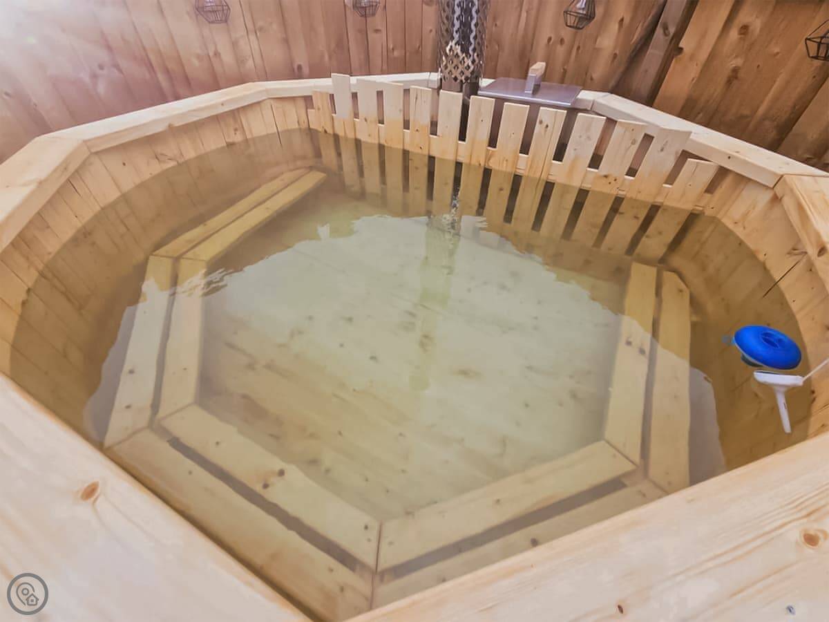 Outside, there's a wood-fired hot tub. It takes a few hours to heat up. There's a patio and a barbecue.