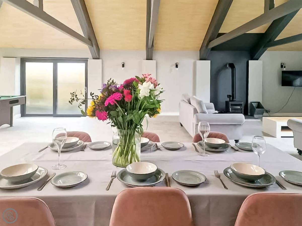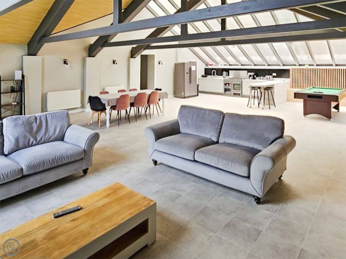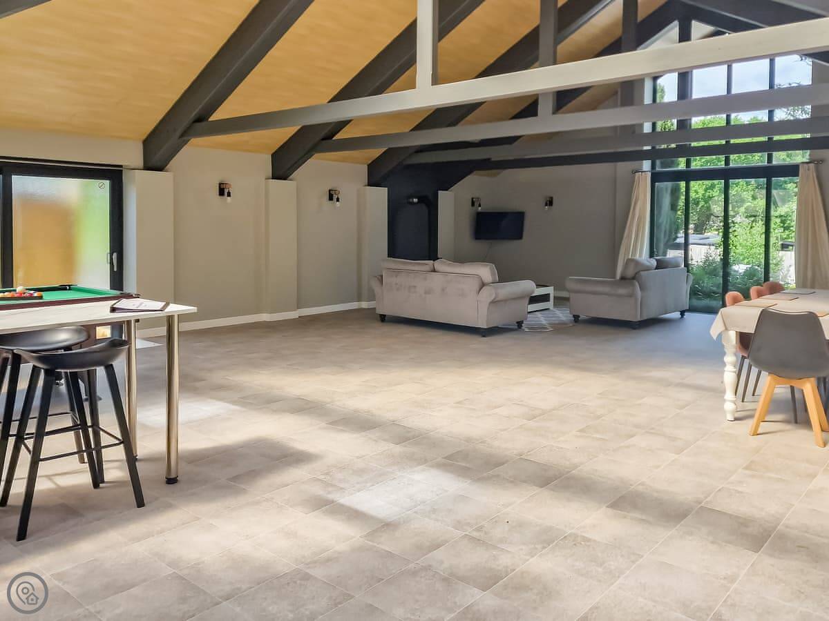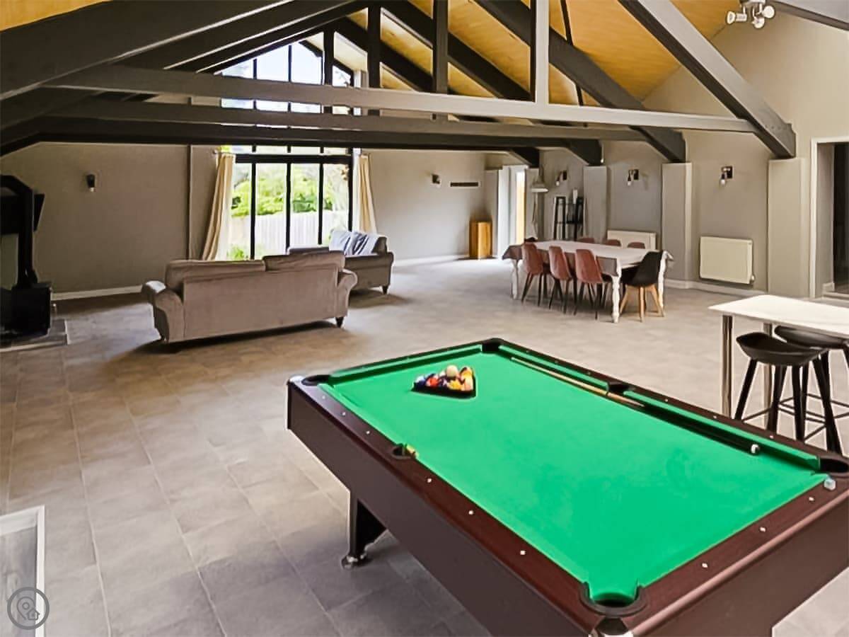 The living area is big. One end has a dining table, the other has a full size pool table. There's a wood burner in there too.