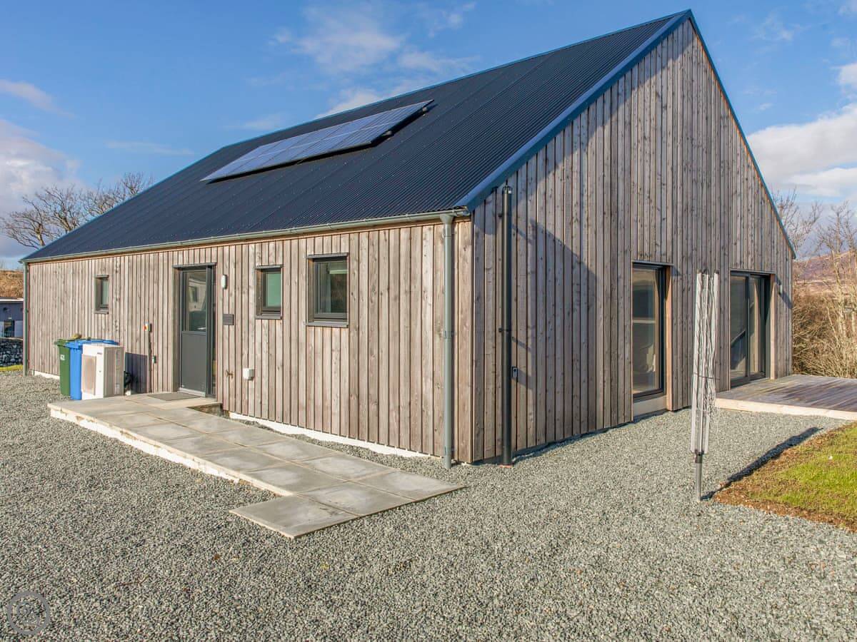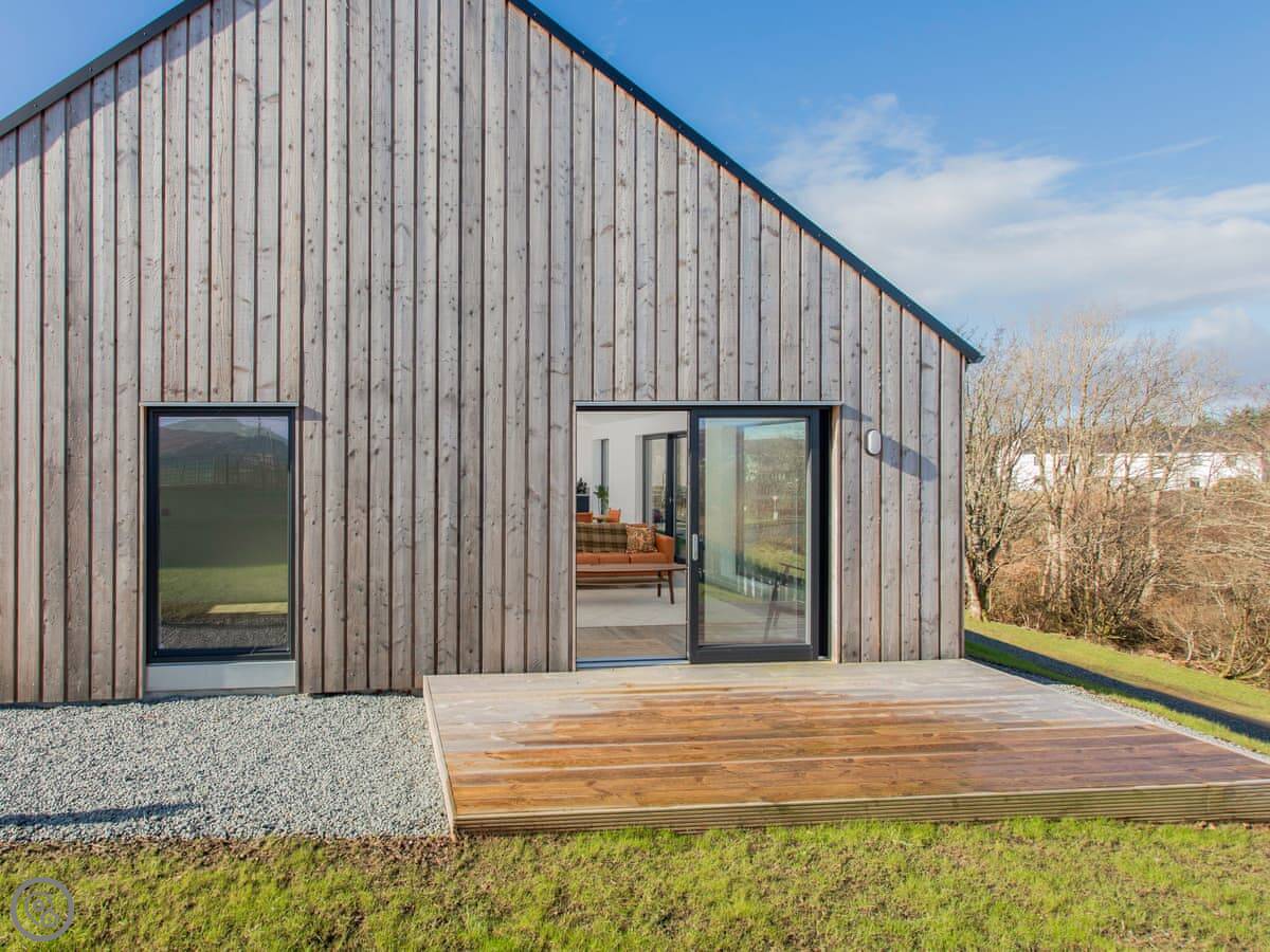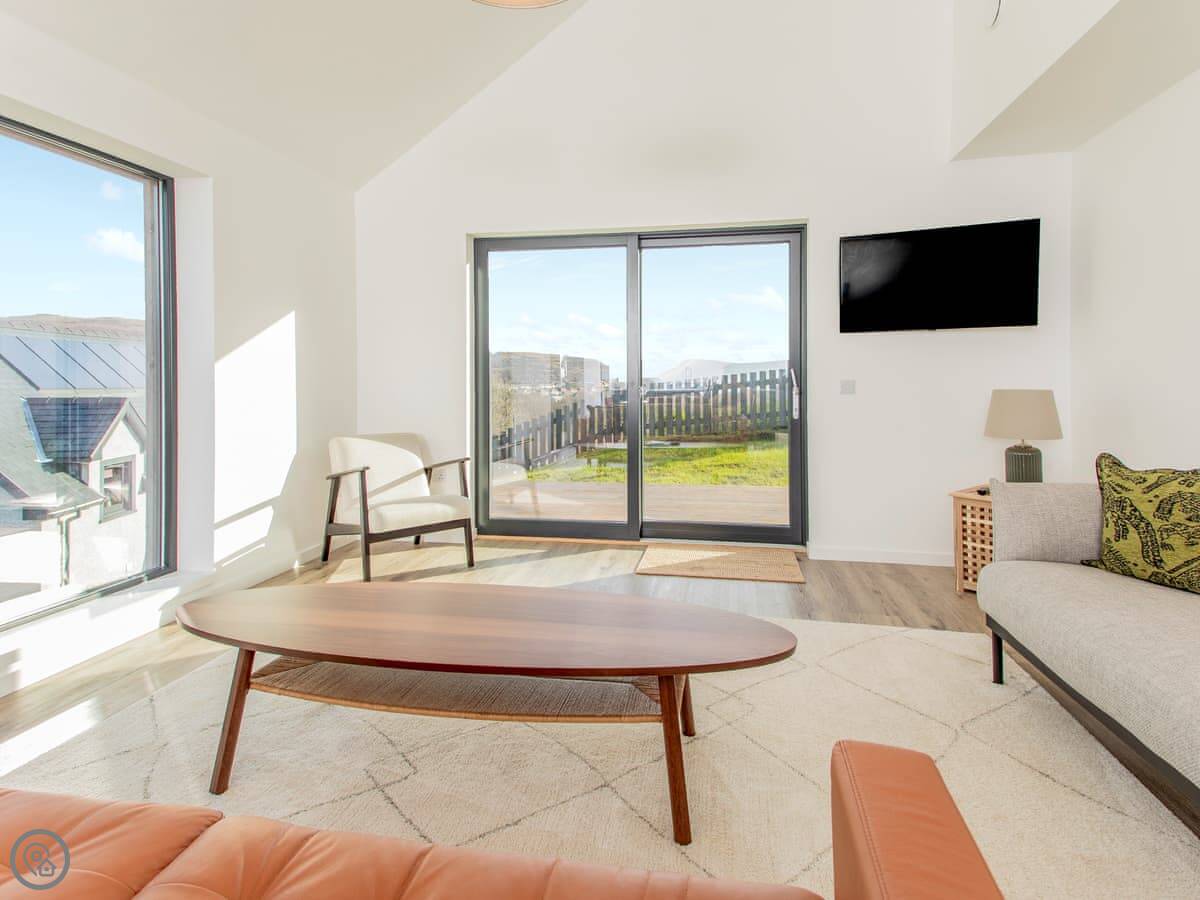 You get the place to yourselves, with a garden and parking. The main living area is open plan. Patio doors lead out to the patio from both the lounge and the dining area. It has underfloor heating, which is good for Skye. It's got a 4 Star rating, which means it's well-equipped and comfortable.