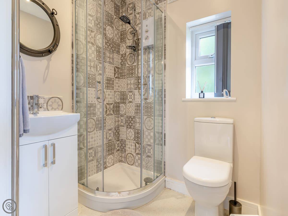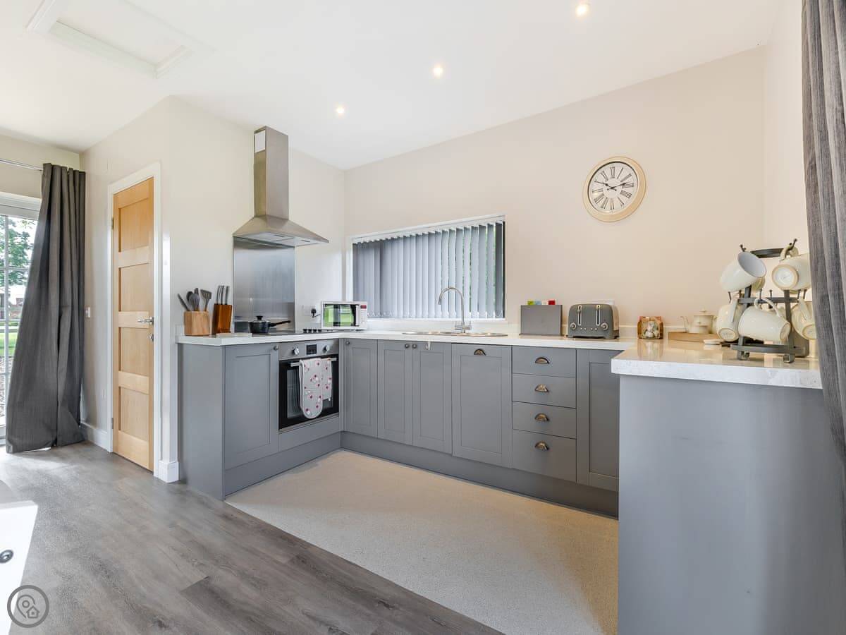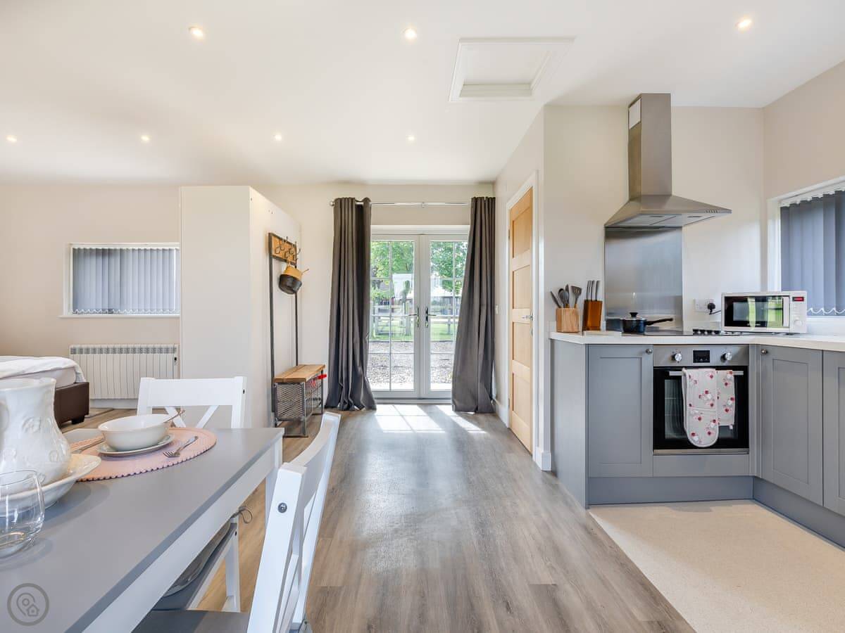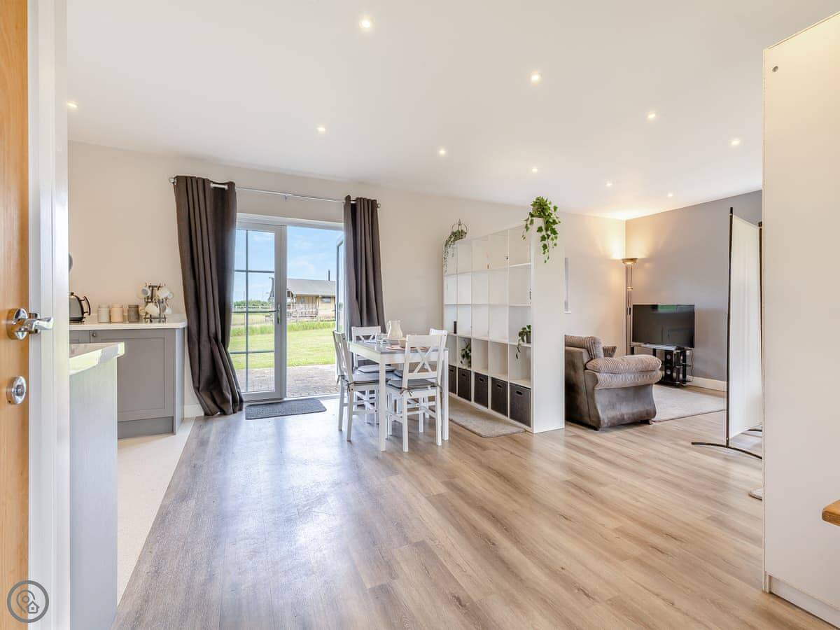 It's open plan inside, so the sleeping, sitting and kitchen area is all one space. There's a separate shower room. It's got underfloor heating and all the power comes from solar, so it's off-grid, but you still get Wi-Fi and things like a dishwasher. The standard is high, it's a 4 Star lodge.