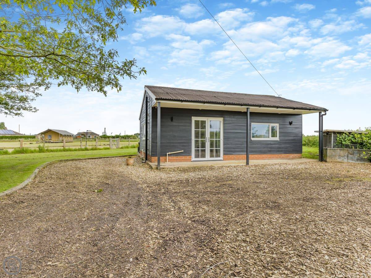 Squirrel Lodge is on the Hawthorns glamping site near Foxley in Norfolk. It's a single storey lodge for two people, completely detached. You're by yourselves in it, but there are a couple of other places on the same three-acre site.