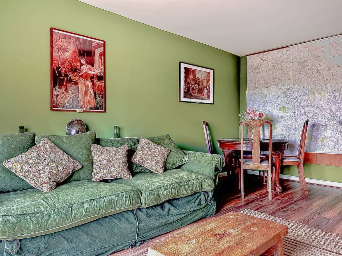 It sleeps four. There's a double bedroom, a room with a single bed, and a single fold-out bed in the living area if you need it. One bathroom. It's a 4 Star place, which means it's well-equipped and comfortable. The kitchen and bathroom are new. The stairs up to the flat are at the back of the building. They're not steep, but they are stairs.