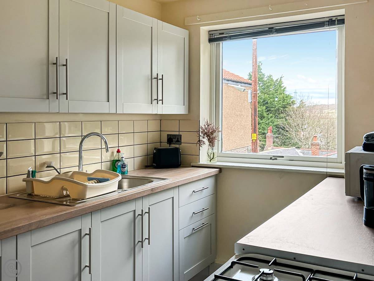 This is the Flodden Apartment in Wooler. It's a first-floor flat above a shop on the high street. You get the whole place to yourselves. It's been freshly decorated.