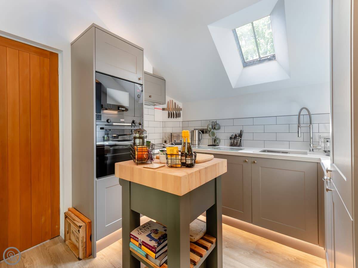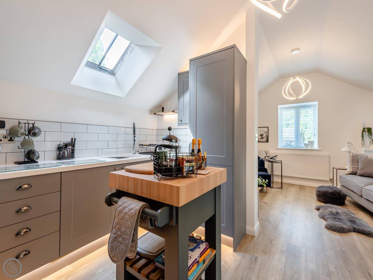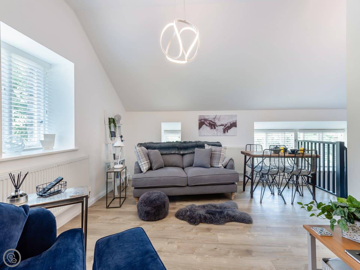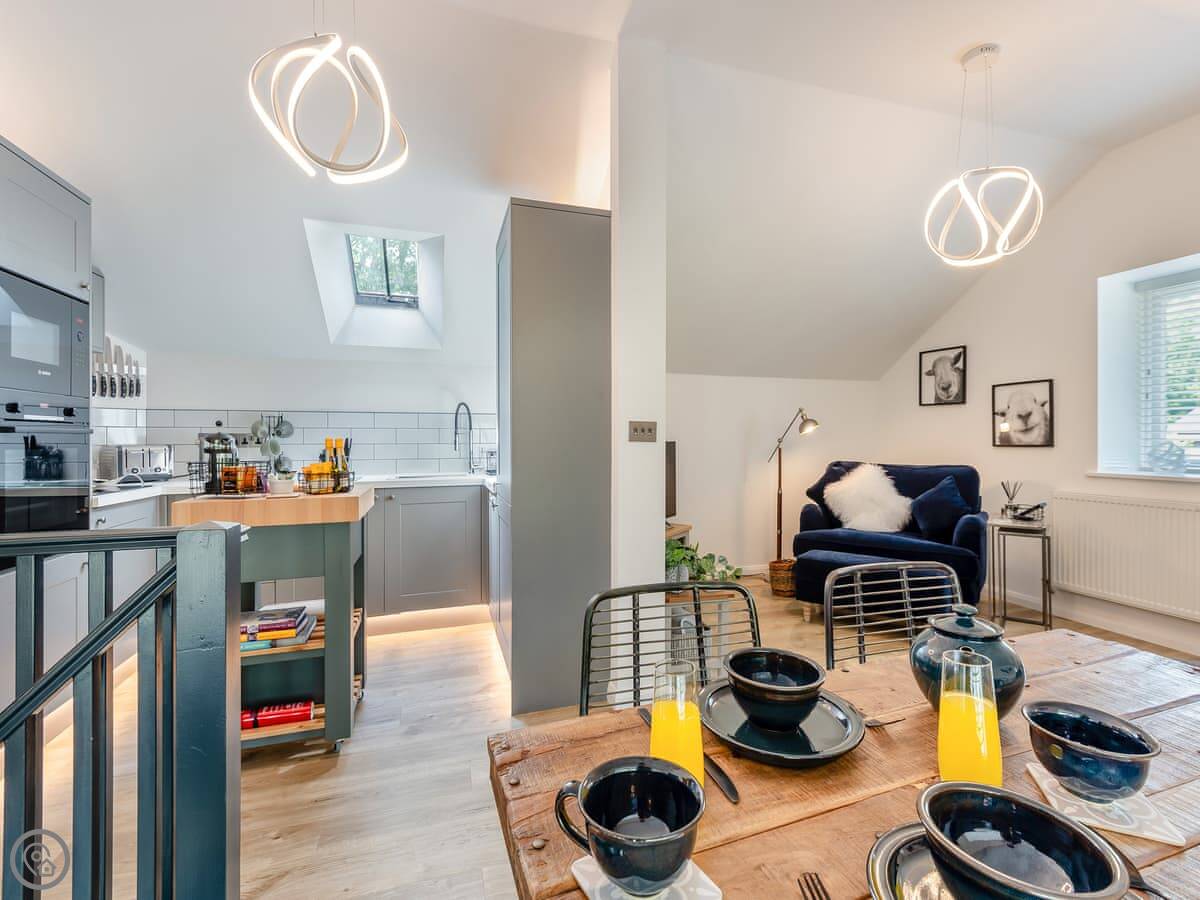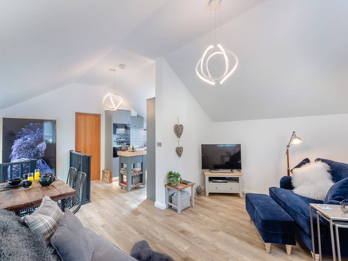 The living space is all upstairs. It's open plan: kitchen, dining area, and sitting area. The kitchen is well equipped. There's a TV with an Amazon Firestick so you can log into your own Netflix. The stairs up are a bit steep, just so you know.