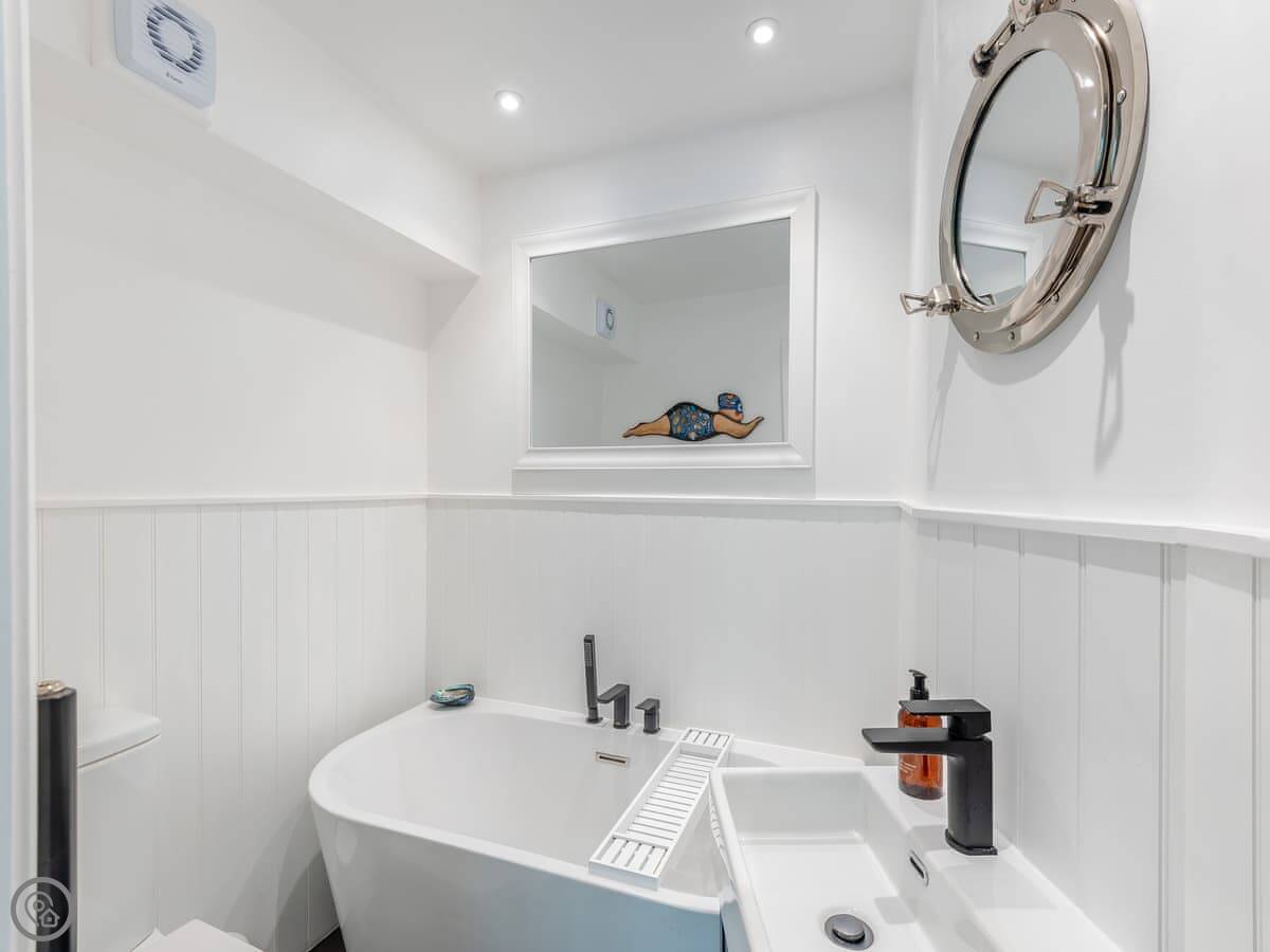 It's for two people. One bedroom with a kingsize bed. There are two bathrooms, which is unusual for a place this size. One is an en-suite with a shower. The other has a bath. Both are nice.