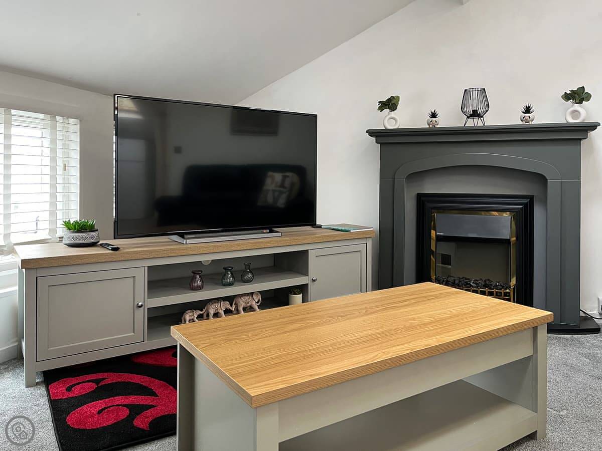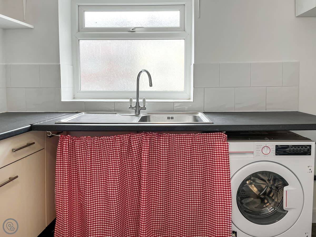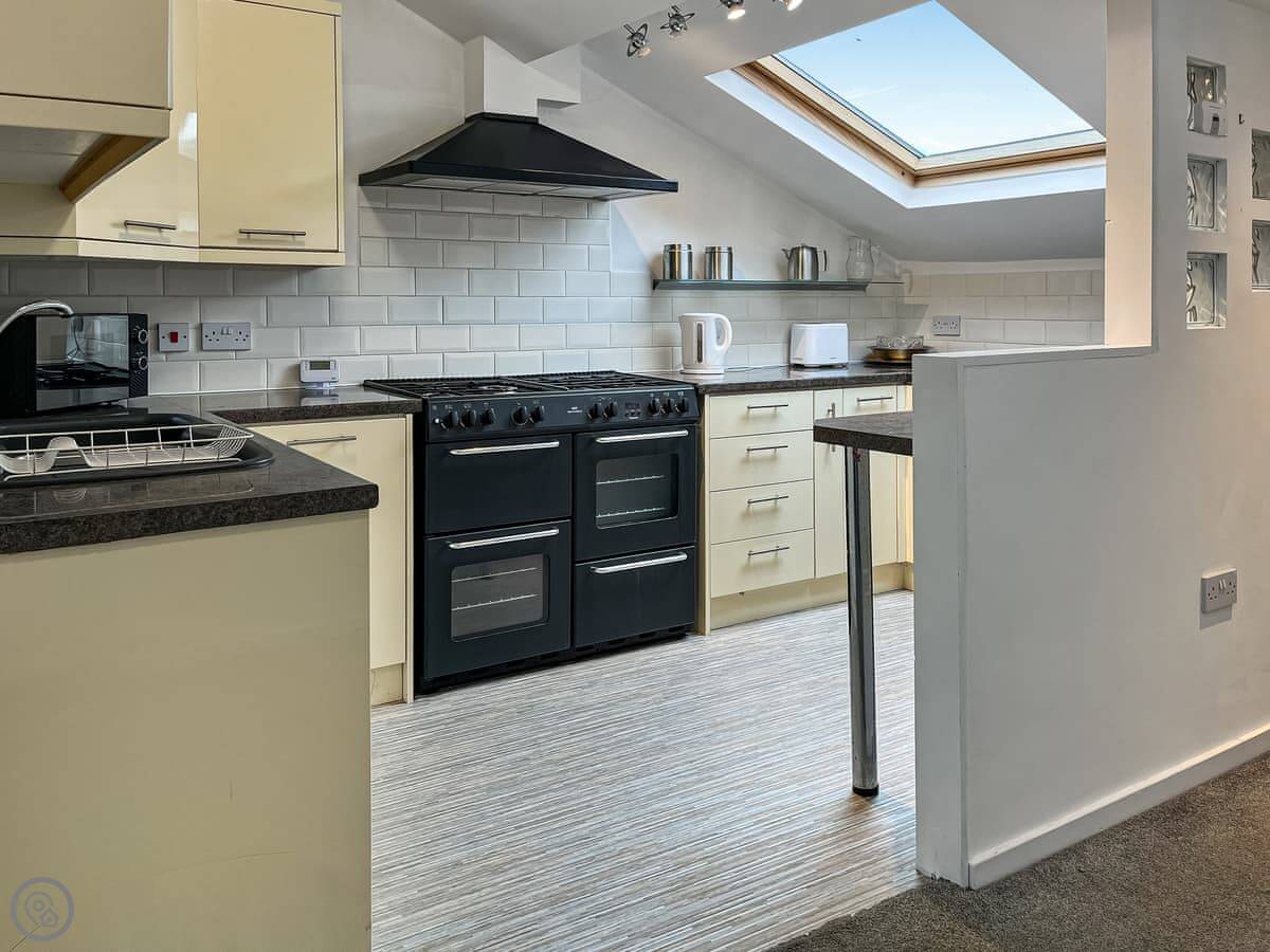 The kitchen and living area are on the top floor, which gets the light. It's open plan. There's a TV, WiFi, a washing machine, and all the bedding and towels are included.