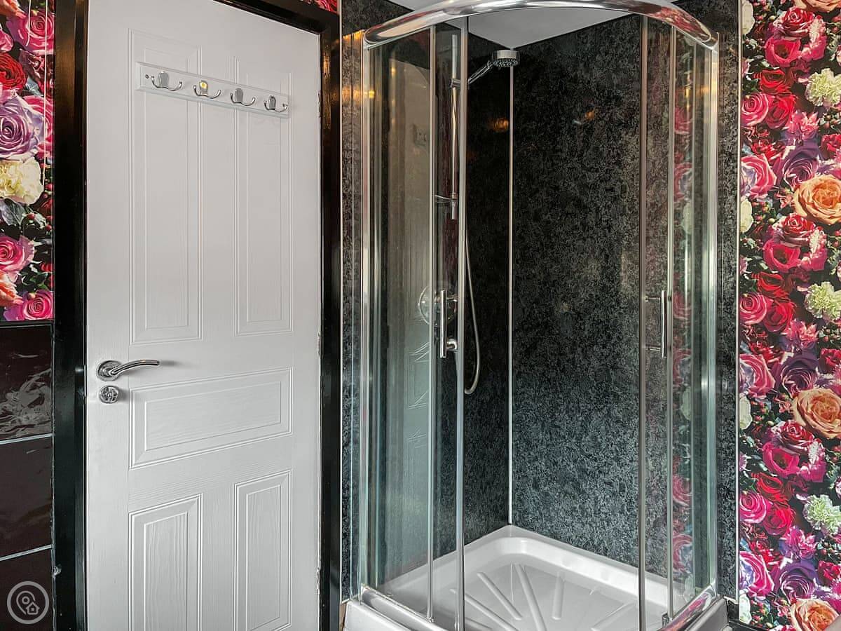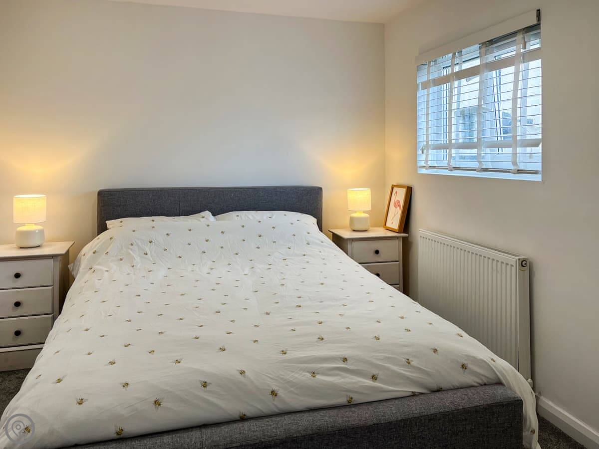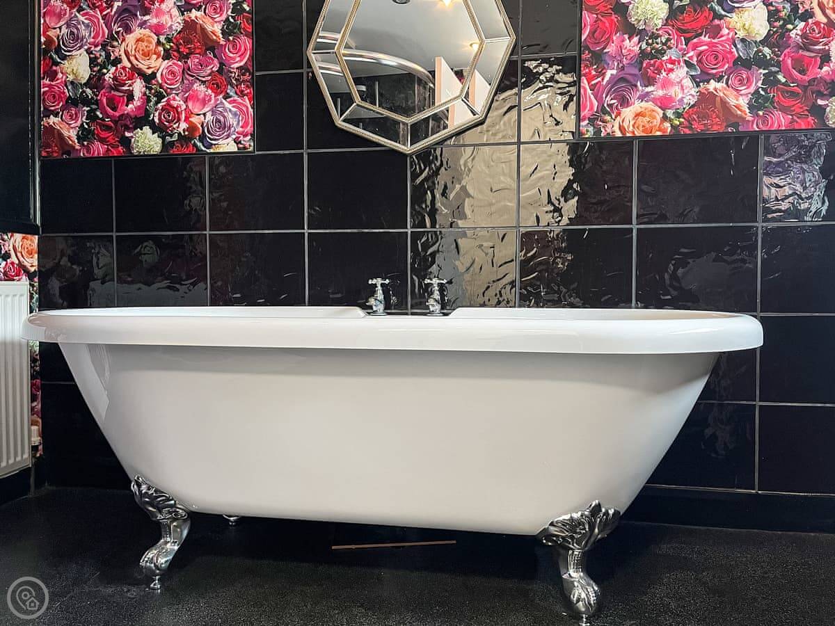 You sleep four, in two double bedrooms. The main one is on the first floor and has its own toilet. The bathroom is on the second floor, with both a bath and a shower. It's all quite floral.
