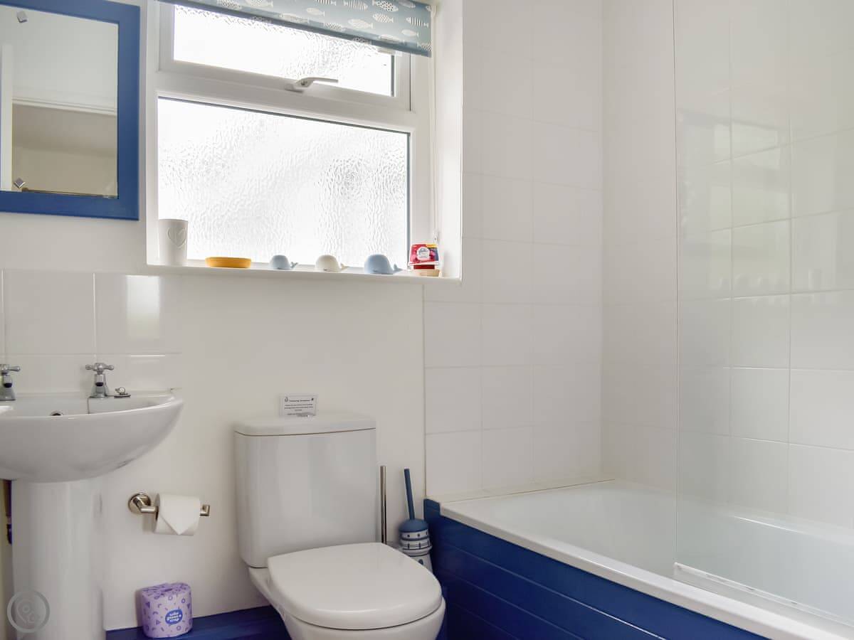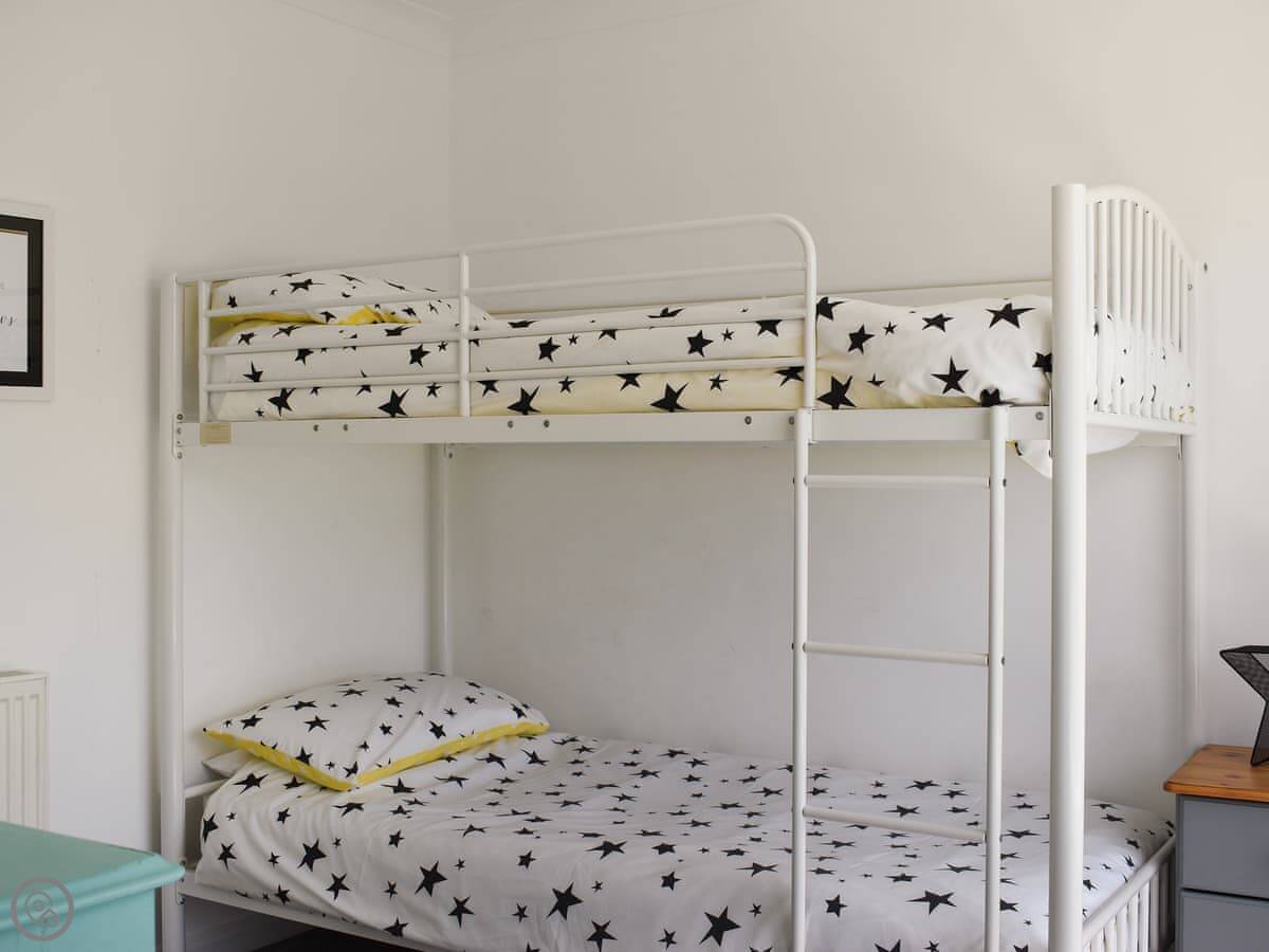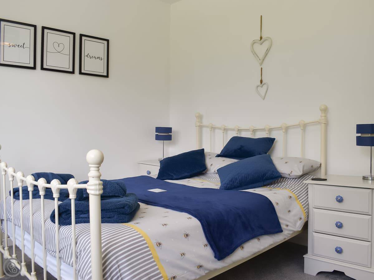 It sleeps six. Three bedrooms, two are doubles and one has bunk beds. There's one bathroom with a shower over the bath, and a separate toilet. It's got a 4 Star rating. It's clean and well set up.