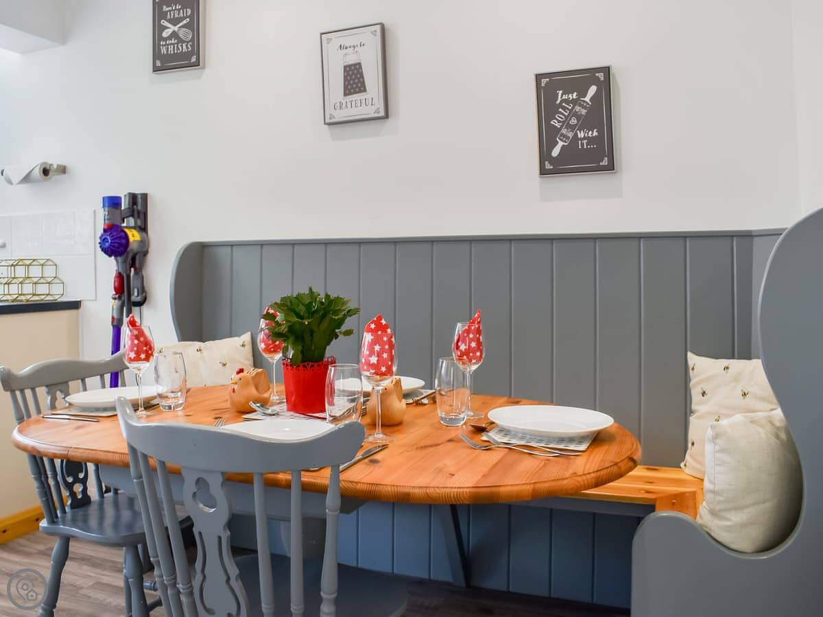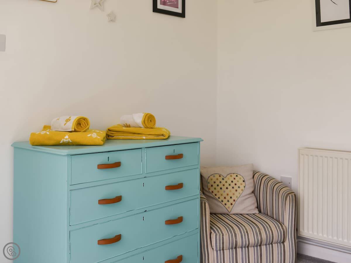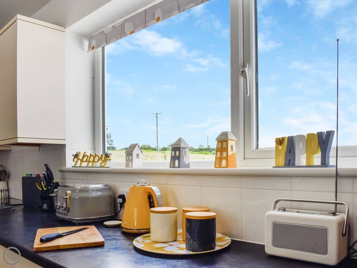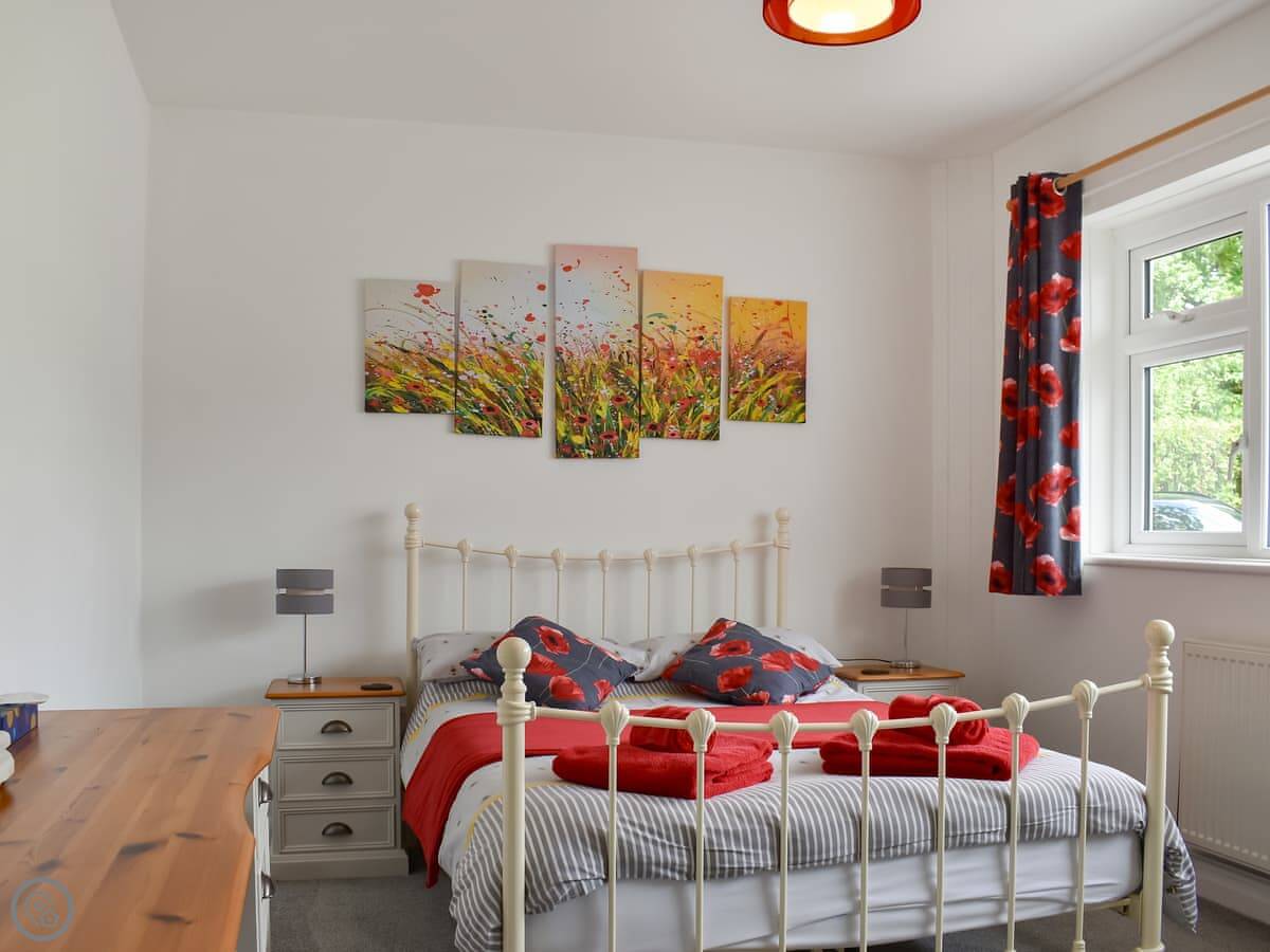 It sleeps six. Three bedrooms, two are doubles and one has bunk beds. There's one bathroom with a shower over the bath, and a separate toilet. It's got a 4 Star rating. It's clean and well set up.