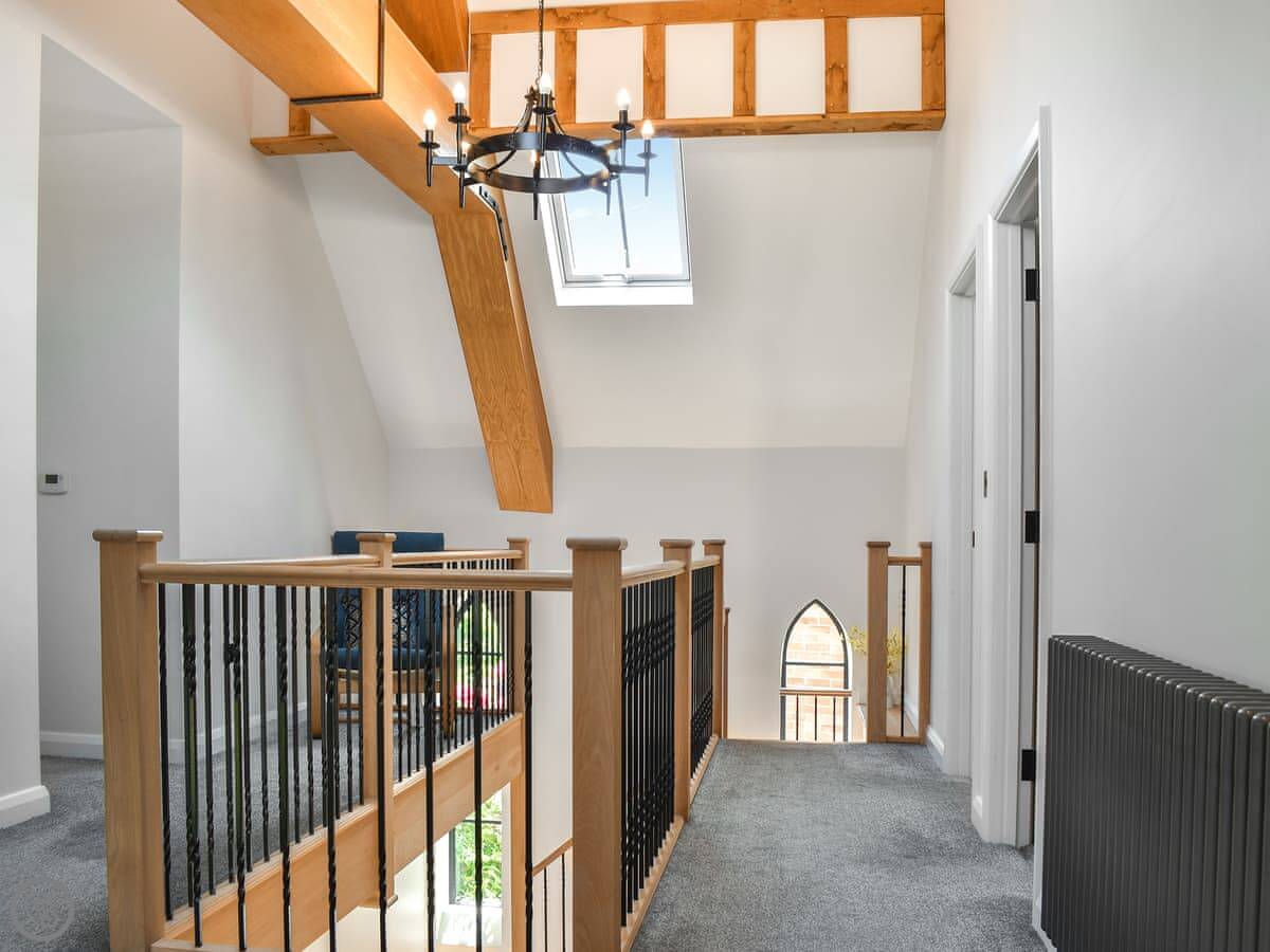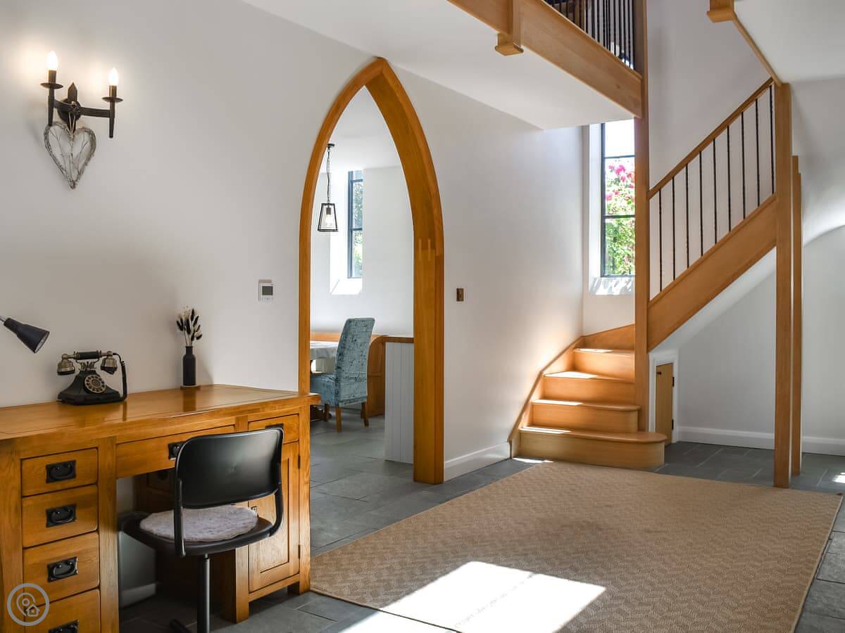 It's a big space. High ceilings, the windows are all stained glass. The stairs to the gallery bedroom are quite tight and winding. That's just how it was built. There are five bedrooms and two bathrooms.