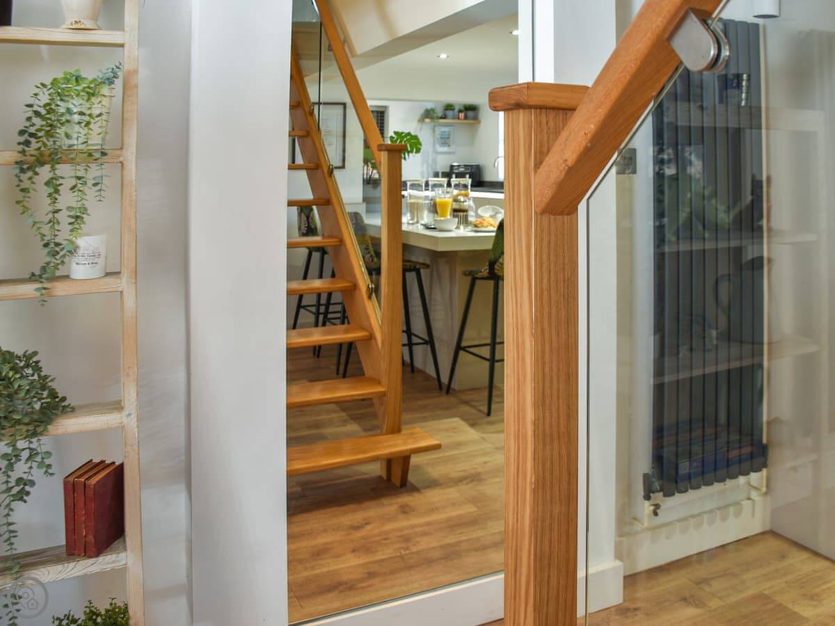 There are two bathrooms upstairs. The stairs are cottage stairs. They're narrow near the bottom and they're a bit steep. Fine for most, just a heads-up.