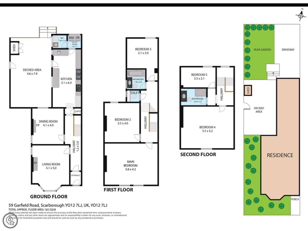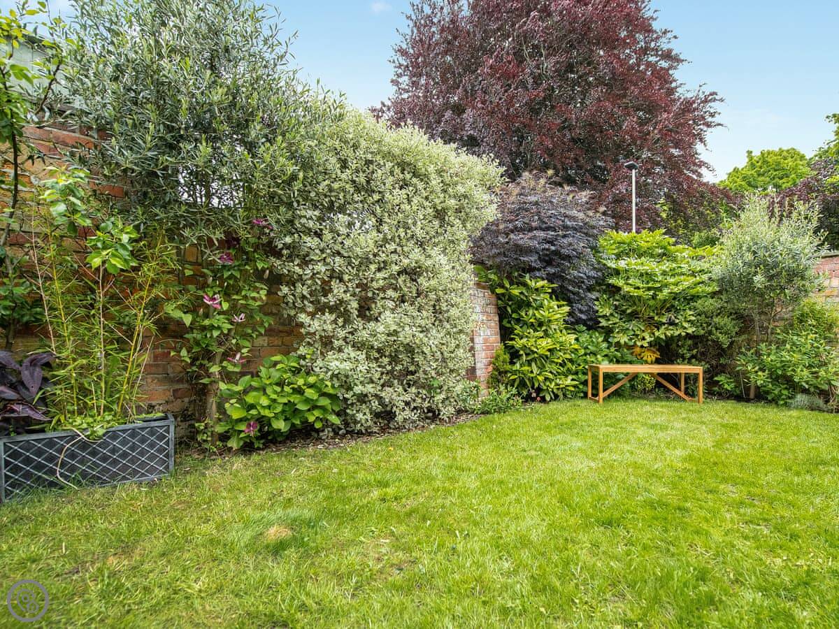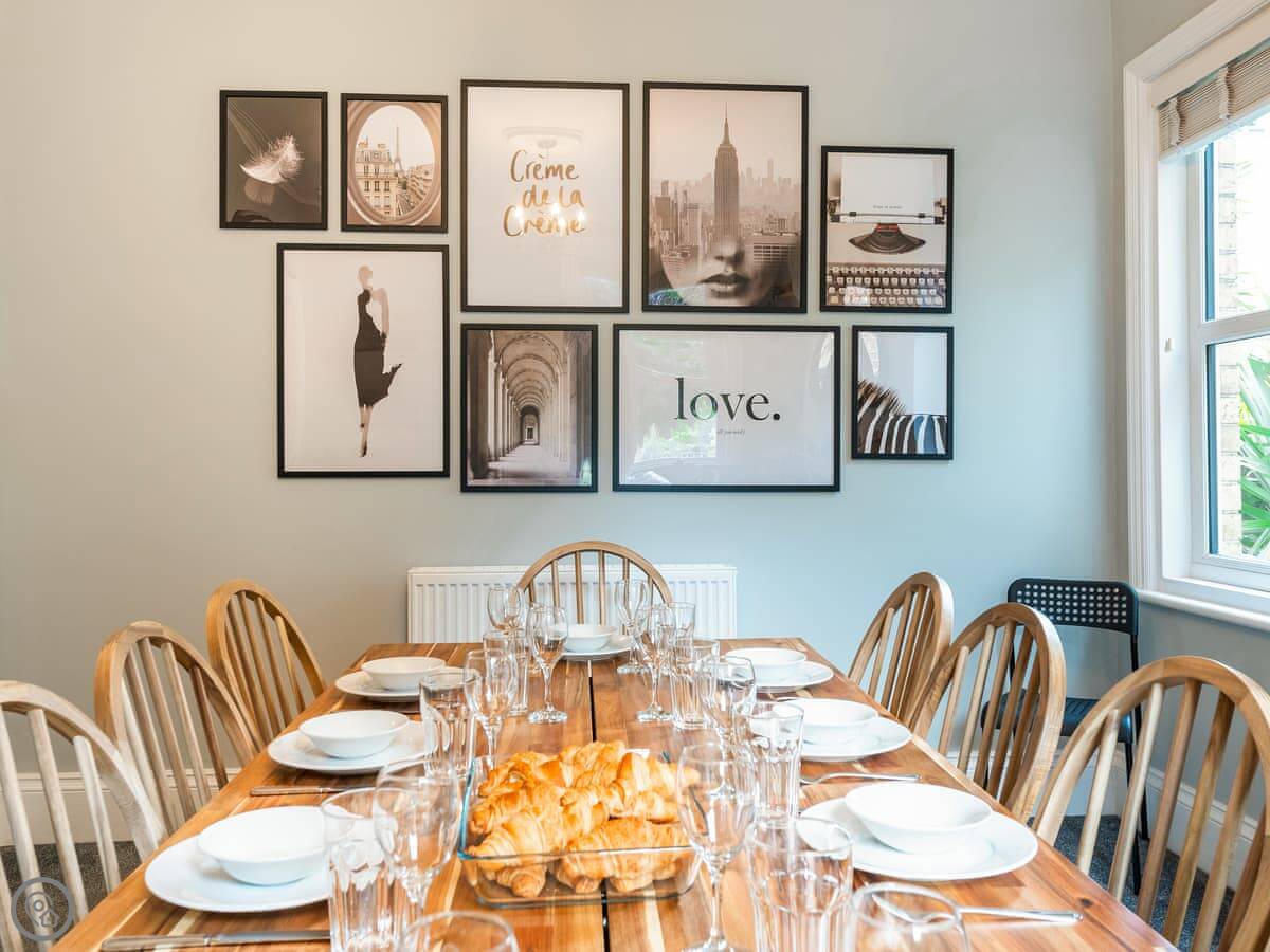 The kitchen is big enough for a group and there’s a separate dining room with a table for ten. The living room has a TV and a few sofas. Outside is a small, enclosed yard, not a garden. Parking is on the driveway.
