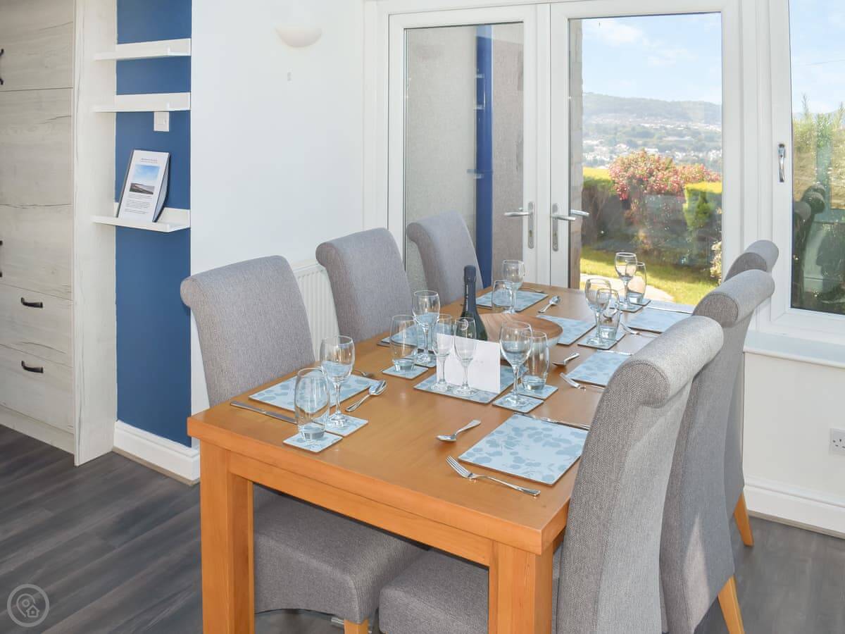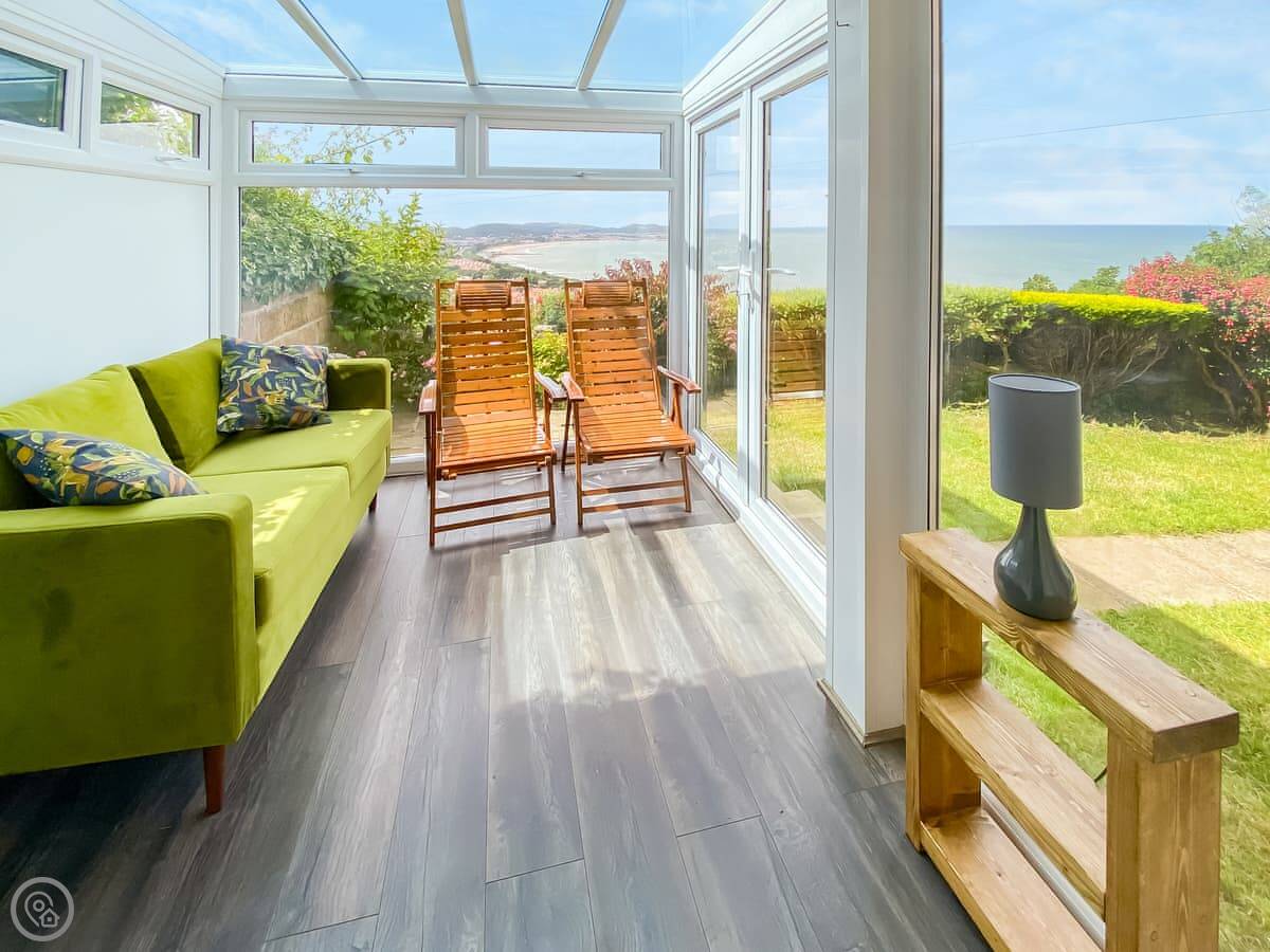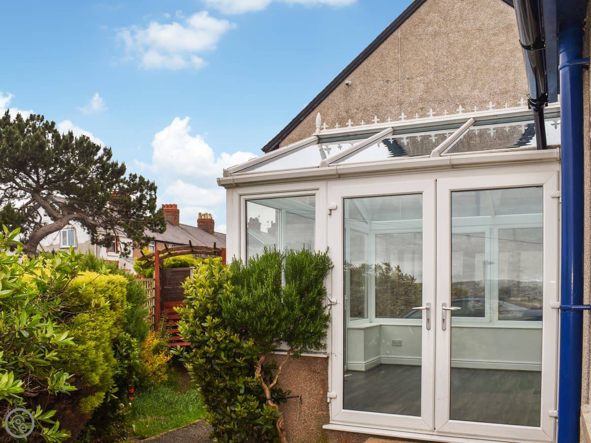 The Eyrie is a semi-detached house on Old Abergele Road in Colwyn Bay. It's on a hill, so you get a clear view of the bay from the back garden. It's not secluded, it's in a residential area. The garden is enclosed, which is handy.