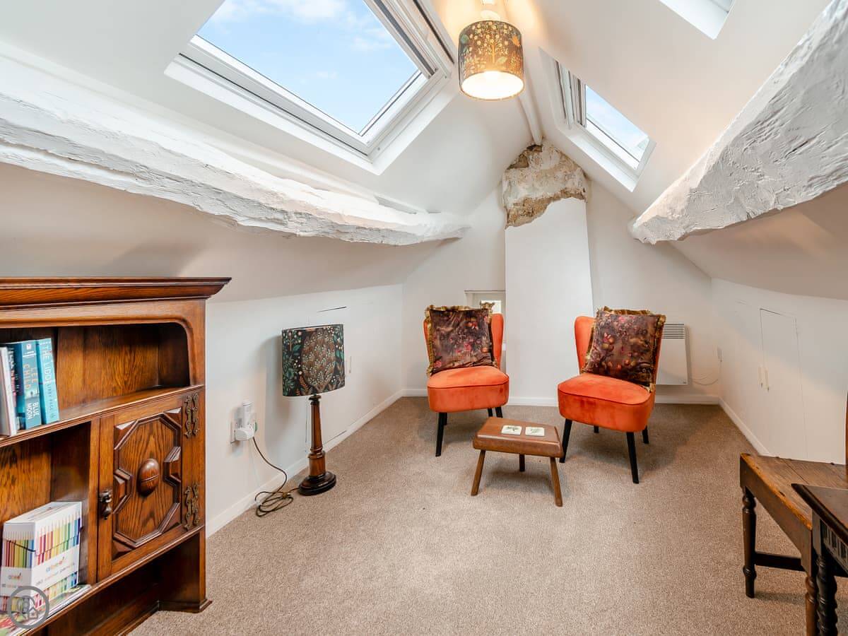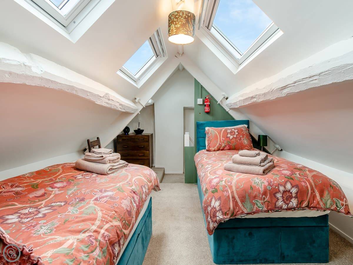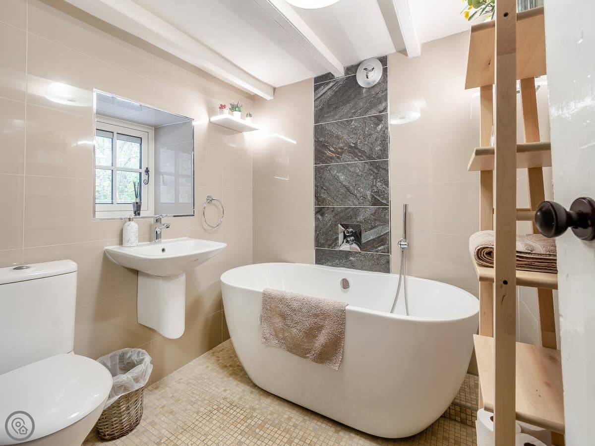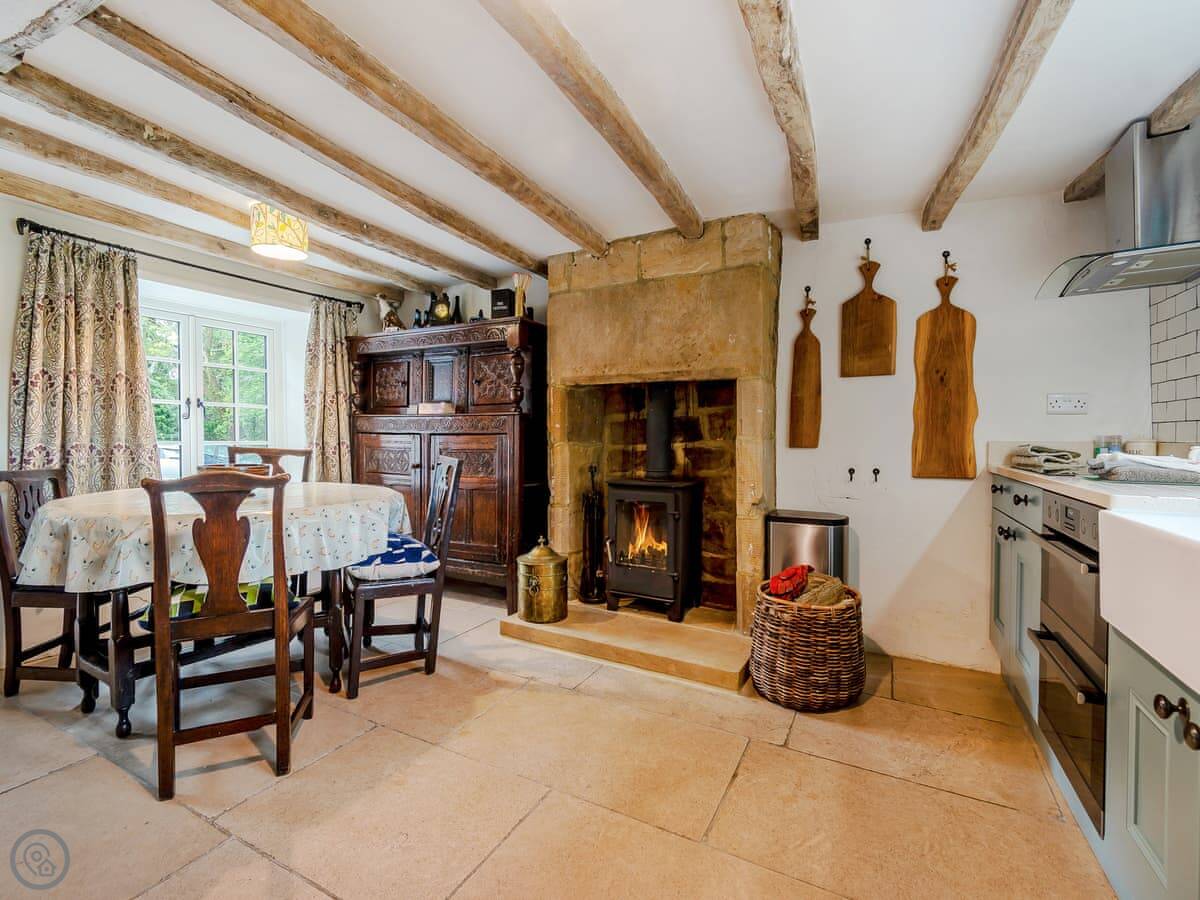There are two wood burners. One in the living room and one by the dining table. The kitchen's got a big Belfast sink and new worktops. The bathroom upstairs has a free-standing bath. Up in the eaves, there's a twin bedroom and a little room next to it with some games for kids.
