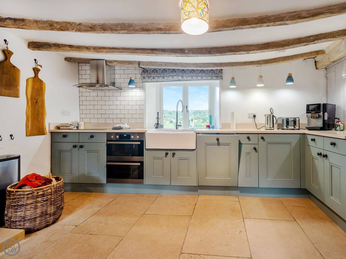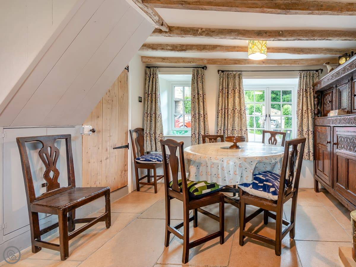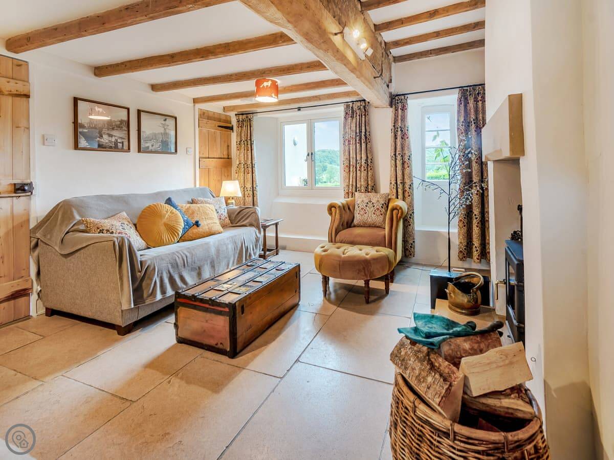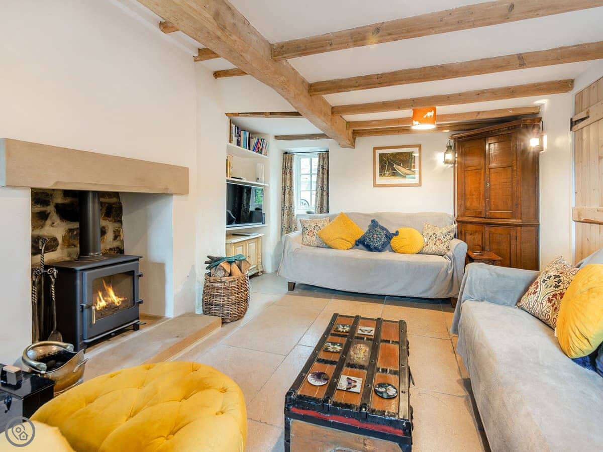 There are two wood burners. One in the living room and one by the dining table. The kitchen's got a big Belfast sink and new worktops. The bathroom upstairs has a free-standing bath. Up in the eaves, there's a twin bedroom and a little room next to it with some games for kids.