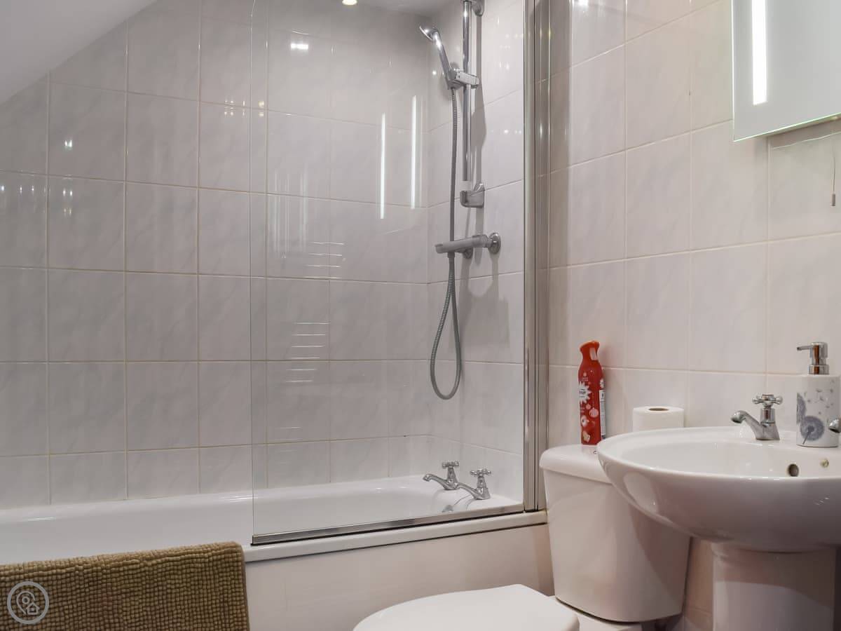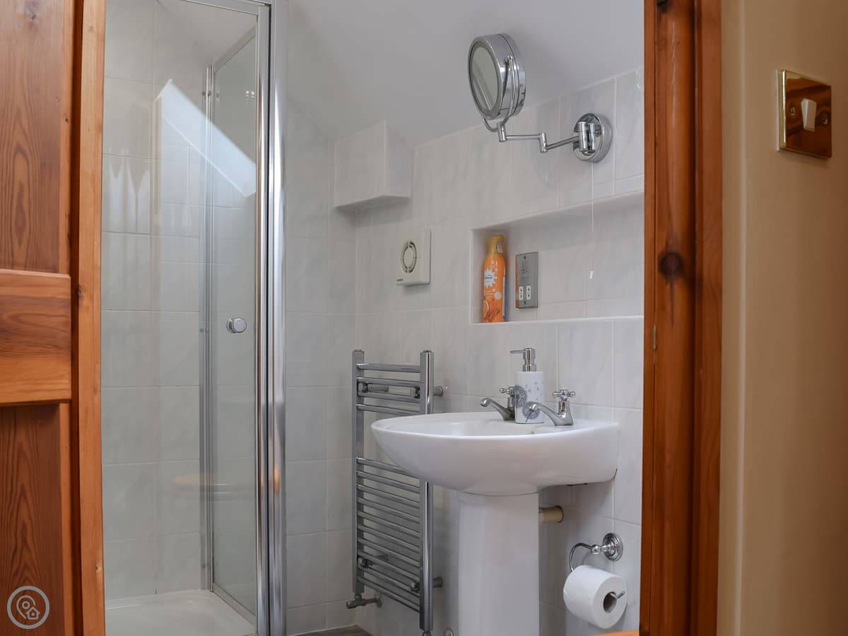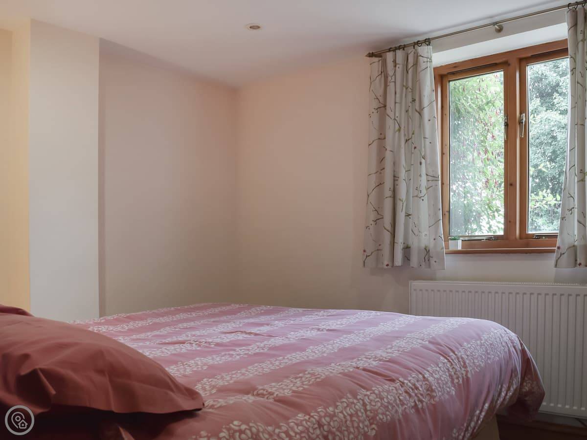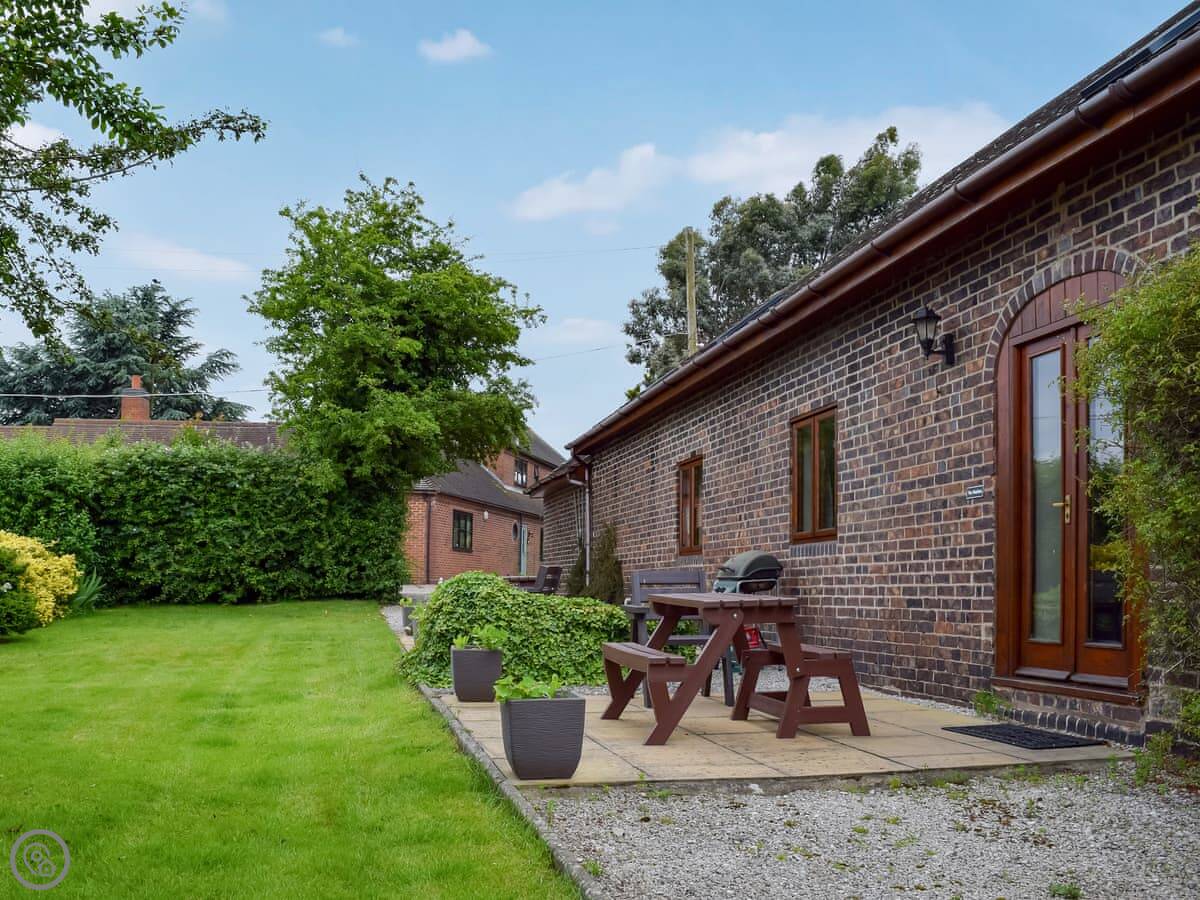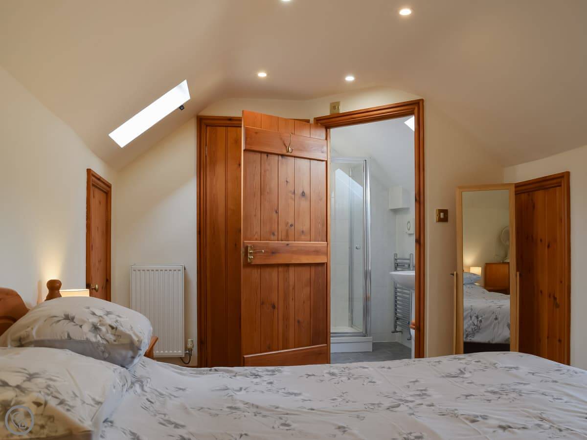 It sleeps four. Two bedrooms and two bathrooms. Both bedrooms are on the ground floor. One's a double with its own en-suite shower room, the other has twin beds that can be joined into a kingsize if you ask beforehand. You get your own patio area out the back with a table and chairs, and a shared bit of garden that looks out over the fields.