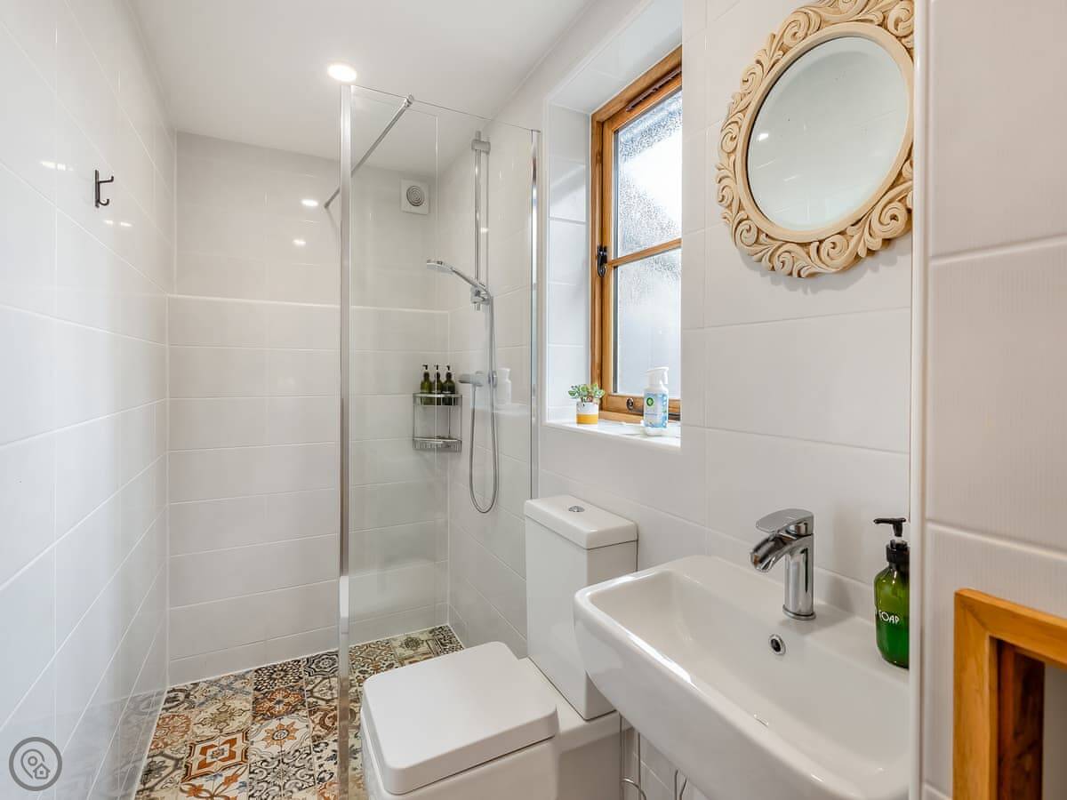 It's for two people. One bedroom, one bathroom. It's got a 4 Star rating. It's comfortable and well looked after. The open plan living area has oak beams. There's a washing machine and a dishwasher. The patio is enclosed, which is handy if you're bringing dogs. Speaking of which, we take up to two pets.