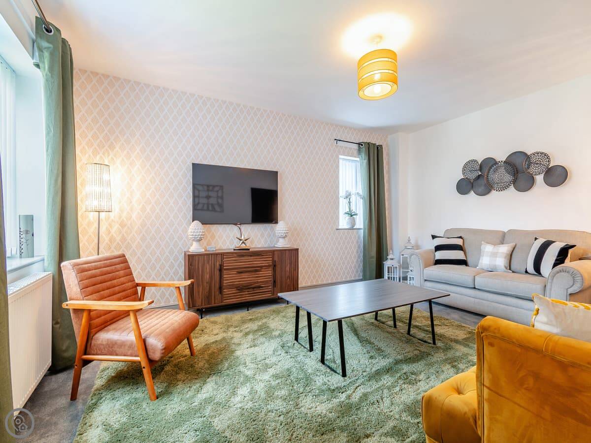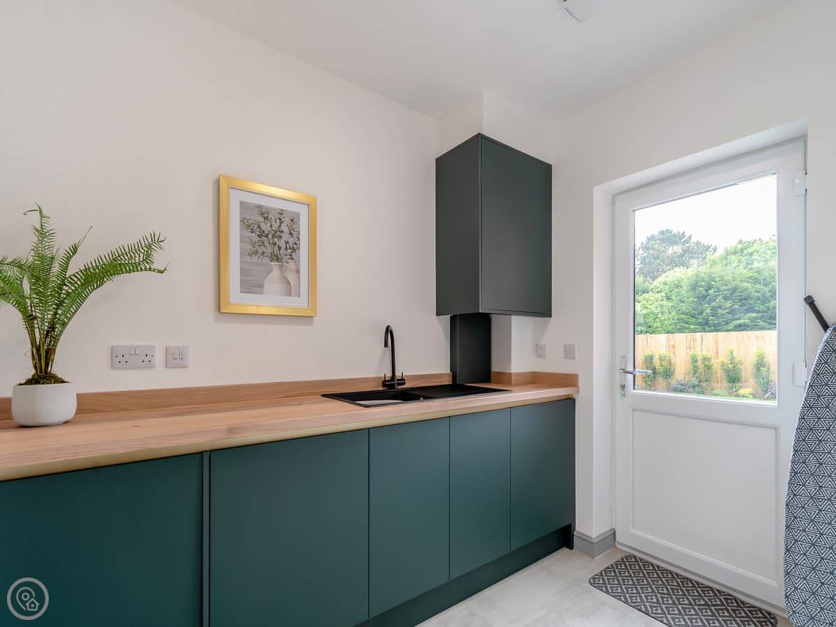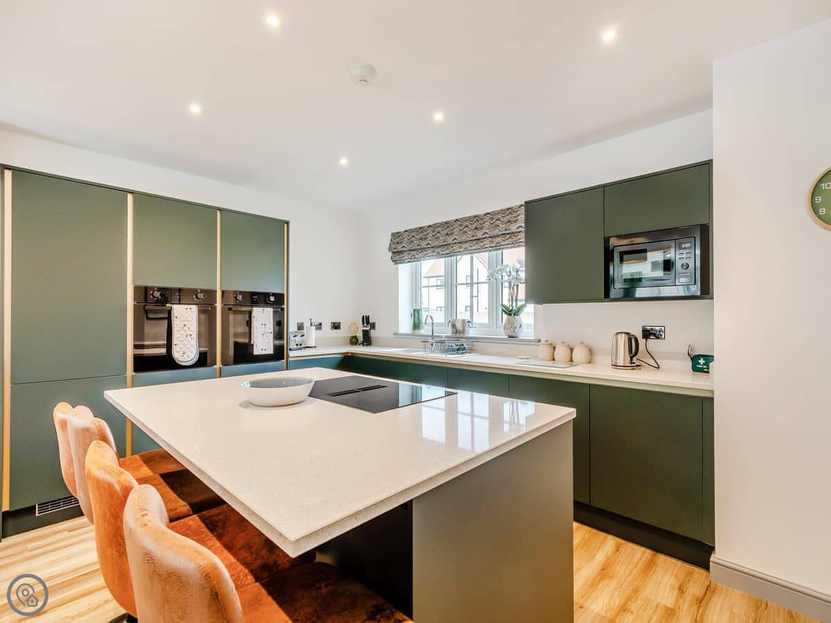 The main living area is open plan, with a big kitchen that has an island. It's a high-spec place, so the appliances are all good. There's a separate utility room with a washing machine and tumble dryer. There's also another living room downstairs if people want to spread out.