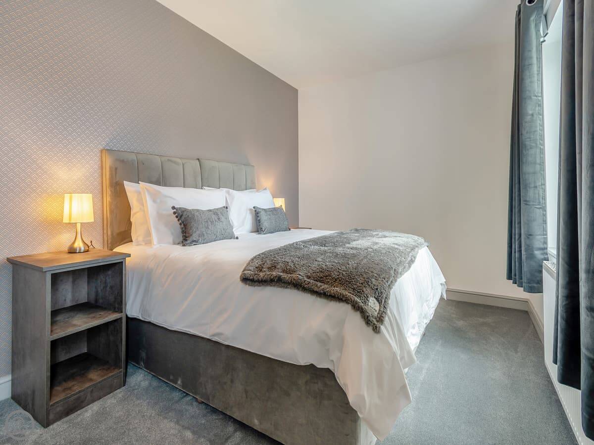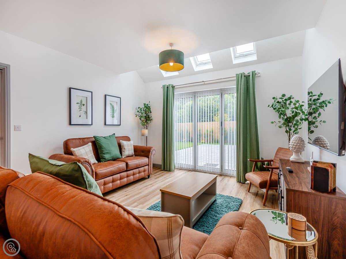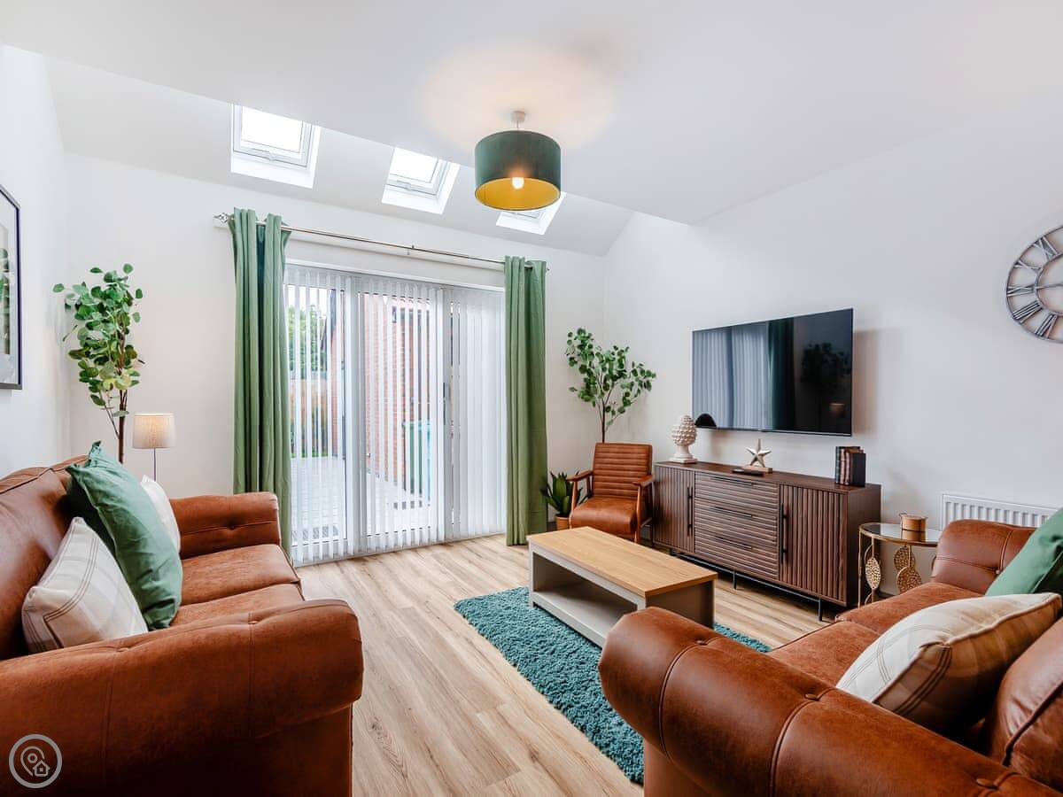 The main living area is open plan, with a big kitchen that has an island. It's a high-spec place, so the appliances are all good. There's a separate utility room with a washing machine and tumble dryer. There's also another living room downstairs if people want to spread out.