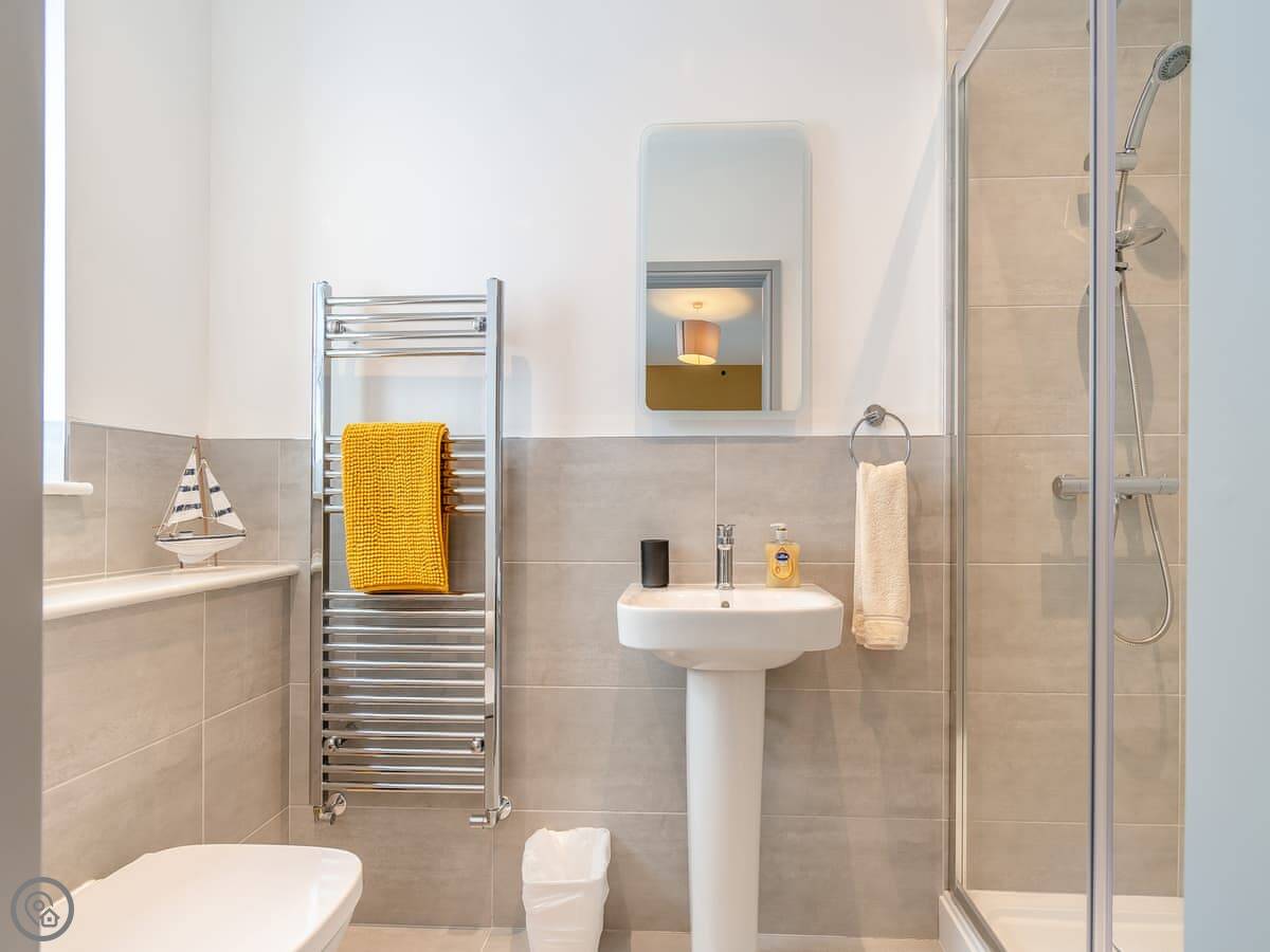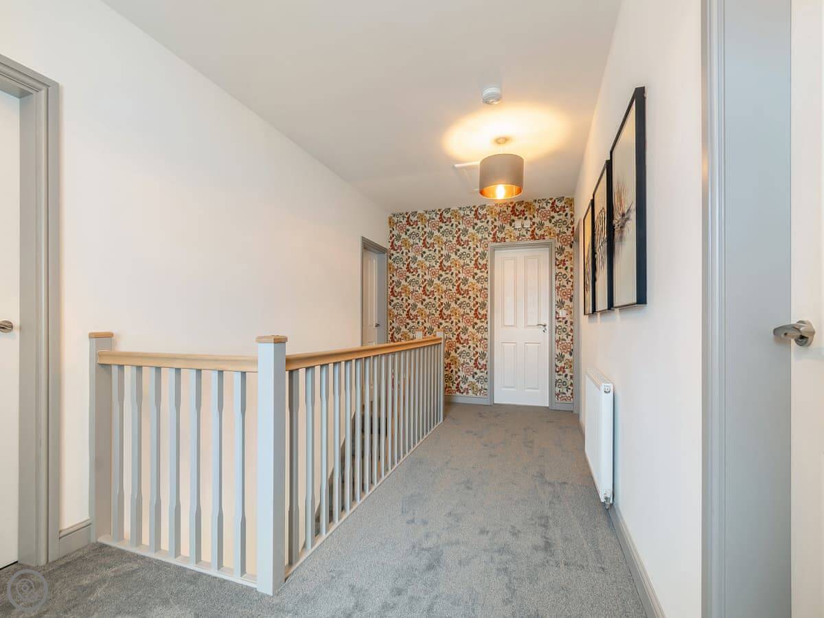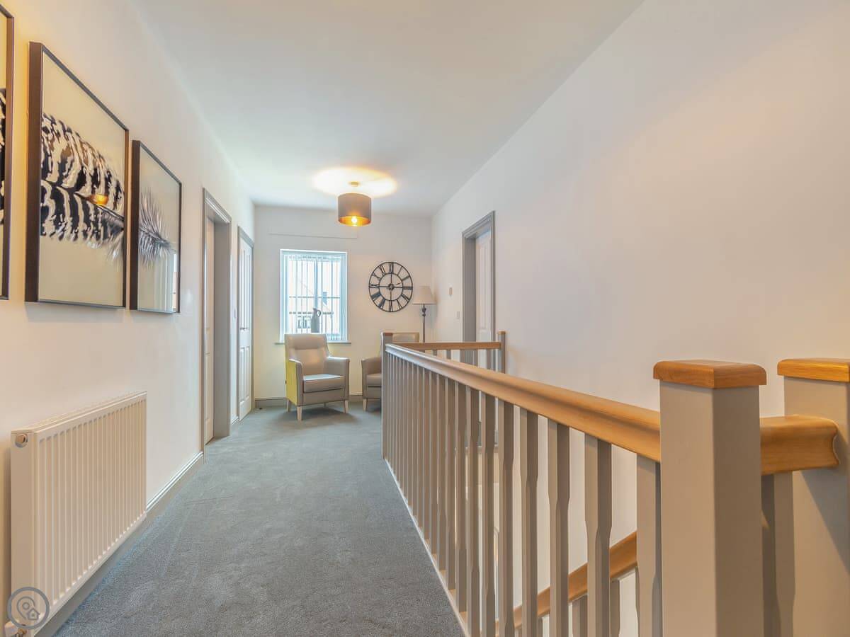 It sleeps ten people. There are five bedrooms and four bathrooms, so you shouldn't have to queue. Three of the bedrooms have their own shower rooms. The stairs are fine, they're just normal stairs.