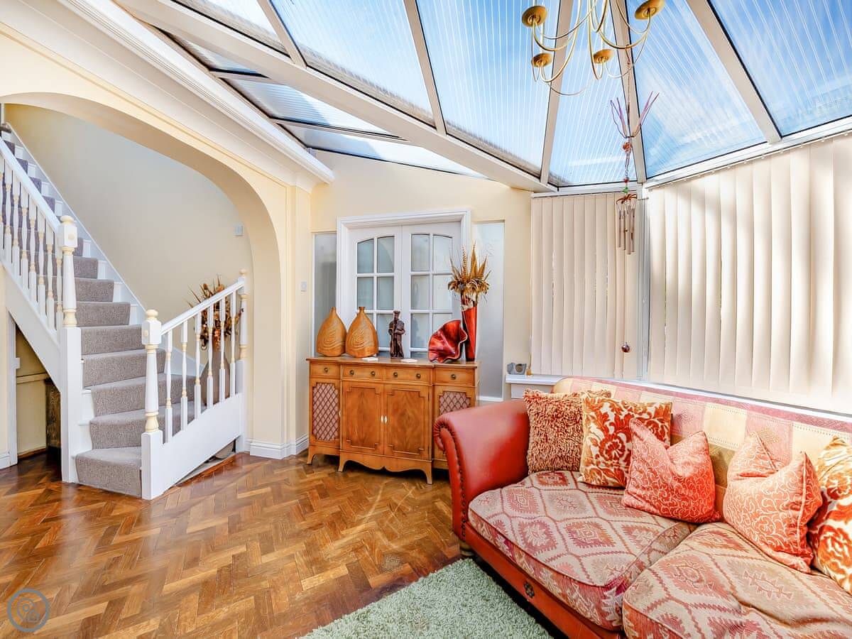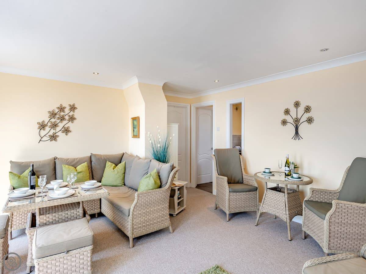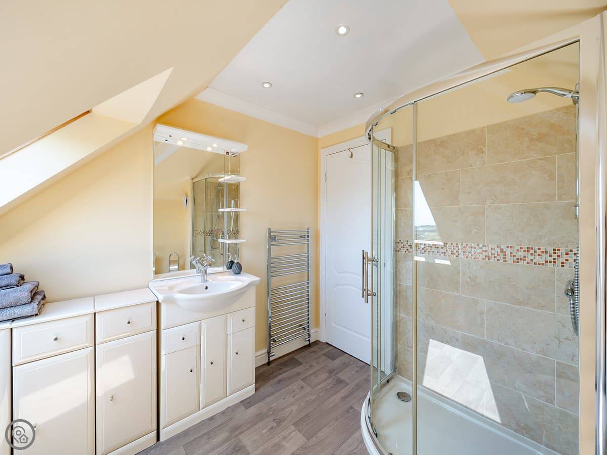 It’s a 5 Star place, so it’s well-finished and feels quite smart. Two bedrooms, both with kingsize beds, and two bathrooms with walk-in showers. That’s handy for four people. You walk in through a conservatory on the ground floor and go up stairs to the main living area.