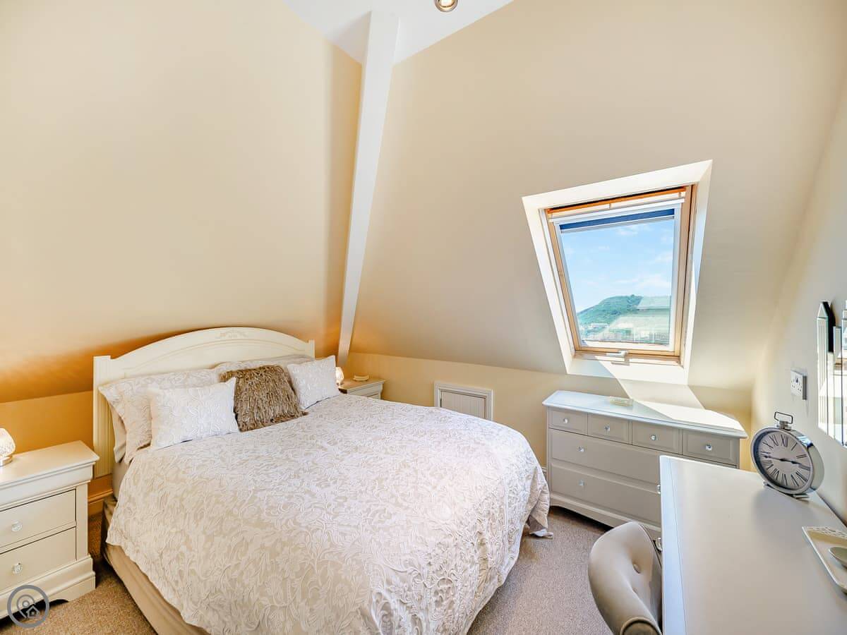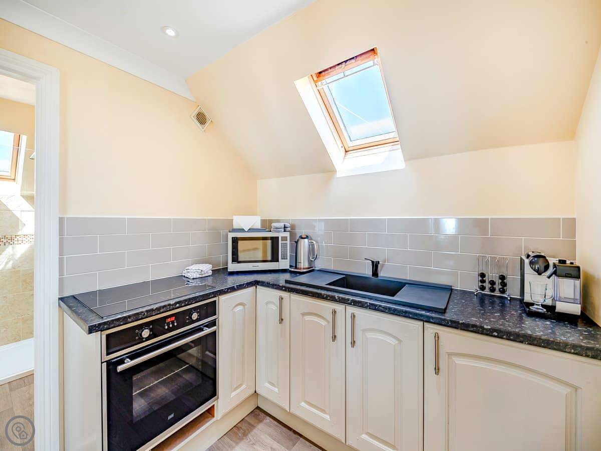 The living room has doors out to two small balconies, so you can get the sea air. There’s also a decked area outside with a table and chairs. The kitchen’s modern and has what you need.