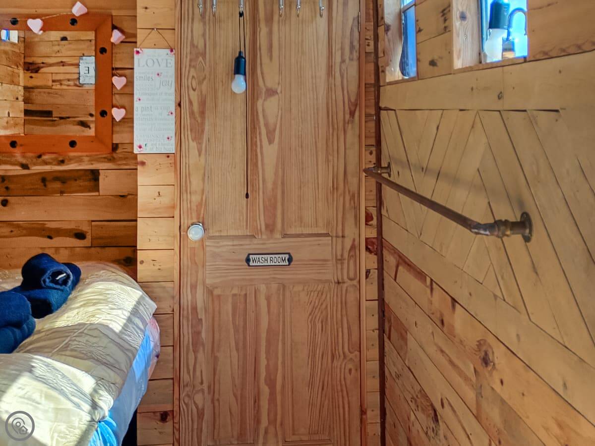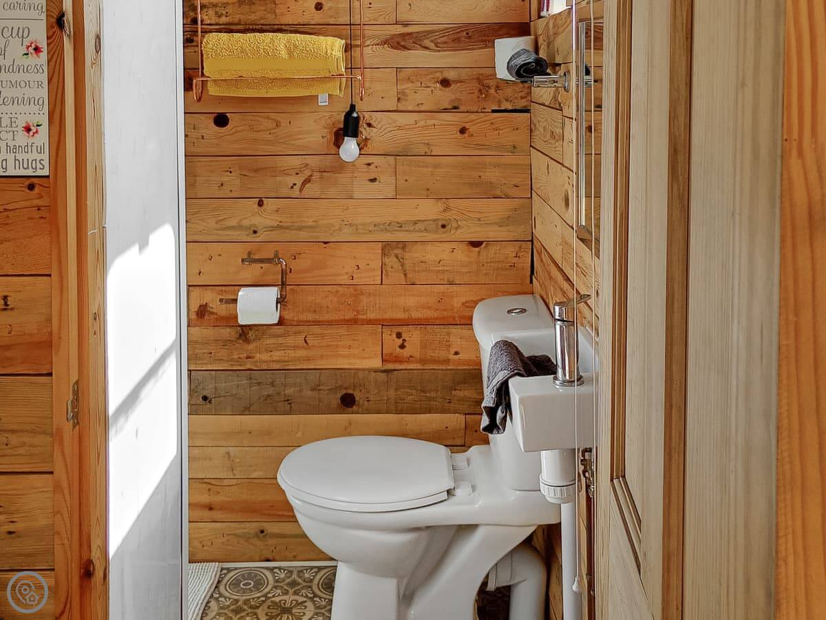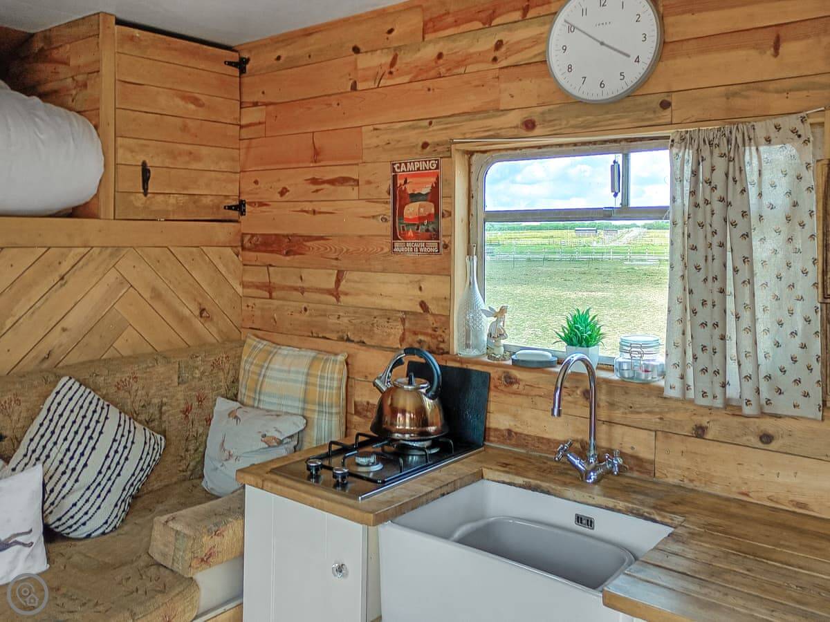 It sleeps two people. One bedroom area, one en-suite bathroom. The shower is electric, so it's warm but not what you'd call powerful. There's a small gas hob for cooking basics. We leave you a breakfast basket with some local bits when you arrive.